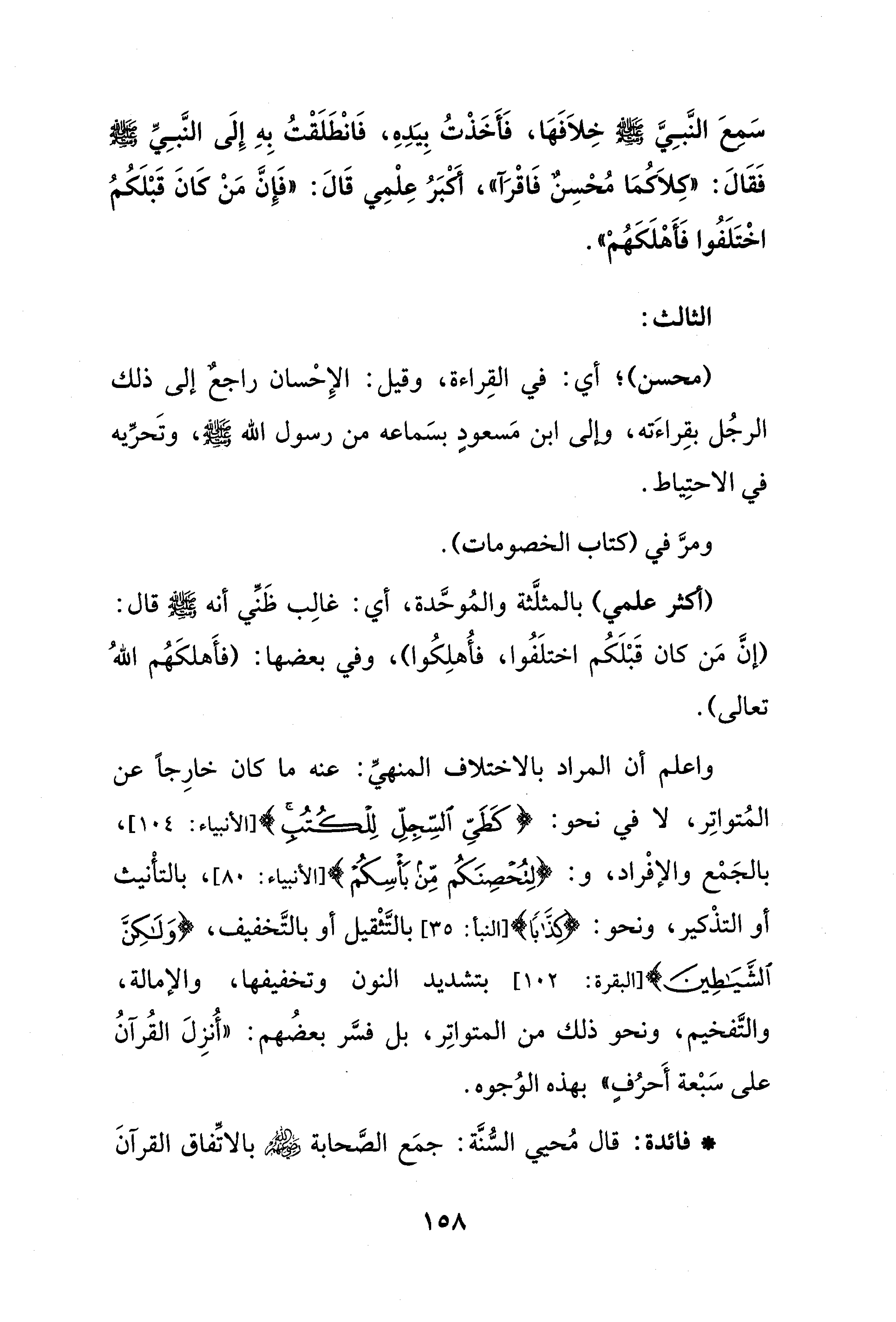 واعلم أن المراد بالاختلاف المنهيِّ: عنه ما كان خارِجًا عن المُتواتِر، لا في نحو: {كَطَيِّ السِّجِلِّ لِلْكُتُبِ} [الأنبياء: 104]، بالجَمْع والإفْراد، و: {لِتُحْصِنَكُمْ مِنْ بَأْسِكُمْ} [الأنبياء: 80]، بالتأْنيث أو التذْكير، ونحو: {كِذَّابًا} [النبأ: 35] بالتَّثْقيل أو بالتَّخفيف، {وَلَكِنَّ الشَّيَاطِينَ} [البقرة: 102] بتشديد النون وتخفيفها، والإمالة، والتَّفخيم، ونحو ذلك من المتواتِر، بل فسَّر بعضُهم: "أُنزِلَ القُرآنُ على سَبْعة أَحرُفٍ" بهذه الوُجوه.