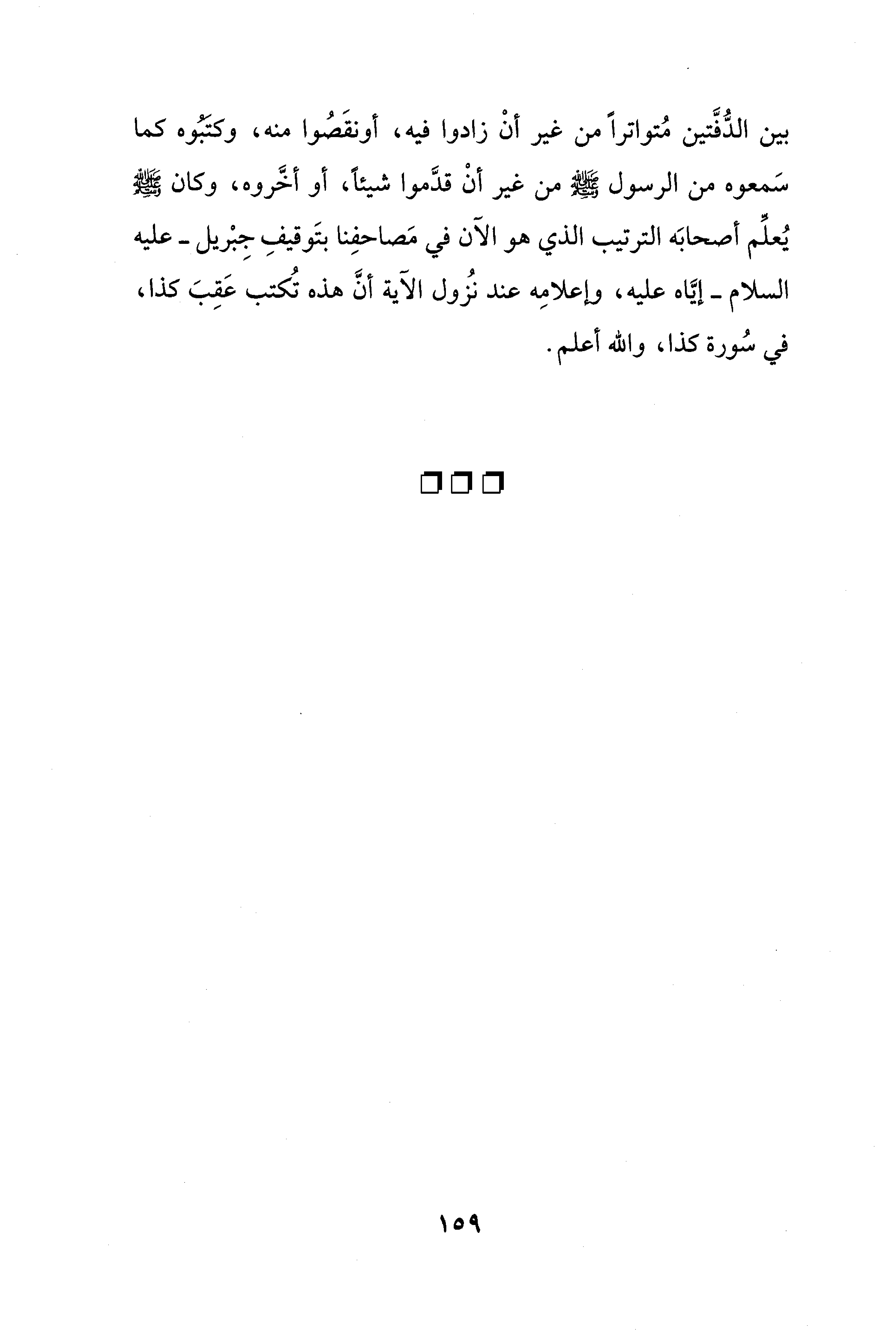 بين الدُّفَّتين مُتواترًا من غير أنْ زادوا فيه، أو نقَصُوا منه، وكتبوه كما سَمعوه من الرسول - صلى الله عليه وسلم - من غير أنْ قدَّموا شيئًا، أو أخَّروه، وكان - صلى الله عليه وسلم - يُعلِّم أصحابَه الترتيب الذي هو الآن في مَصاحفِنا بتَوقيفِ جِبْريل -عليه السلام- إيَّاه عليه، وإعلامِه عند نُزول الاَية أنَّ هذه تُكتب عَقِبَ كذا، في سُورة كذا، والله أعلم.