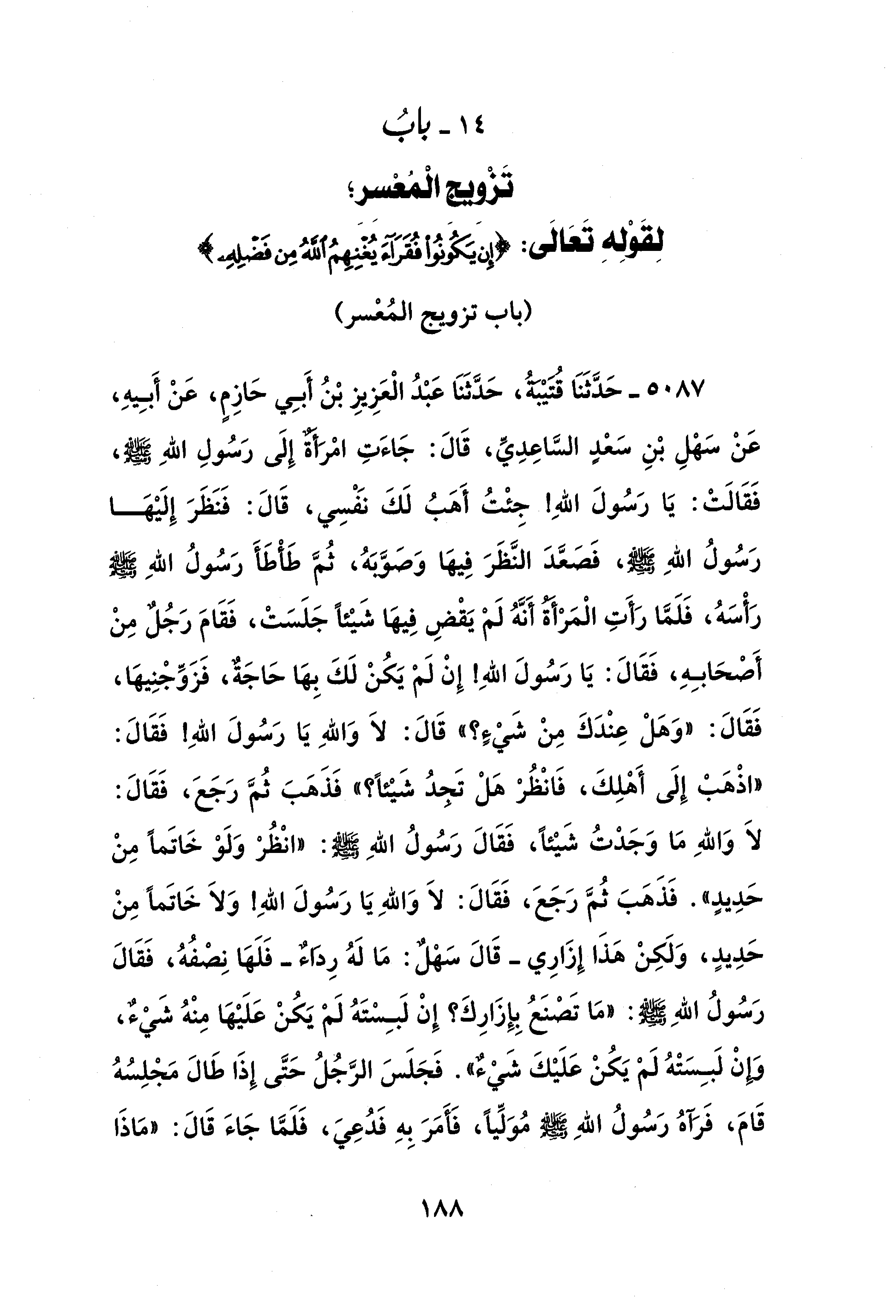 14 - بابُ تَزْويجِ الْمُعْسِرِ؛ لقولِهِ تَعَالى: {إِنْ يَكُونُوا فُقَرَاءَ يُغْنِهِمُ اللَّهُ مِنْ فَضْلِهِ}