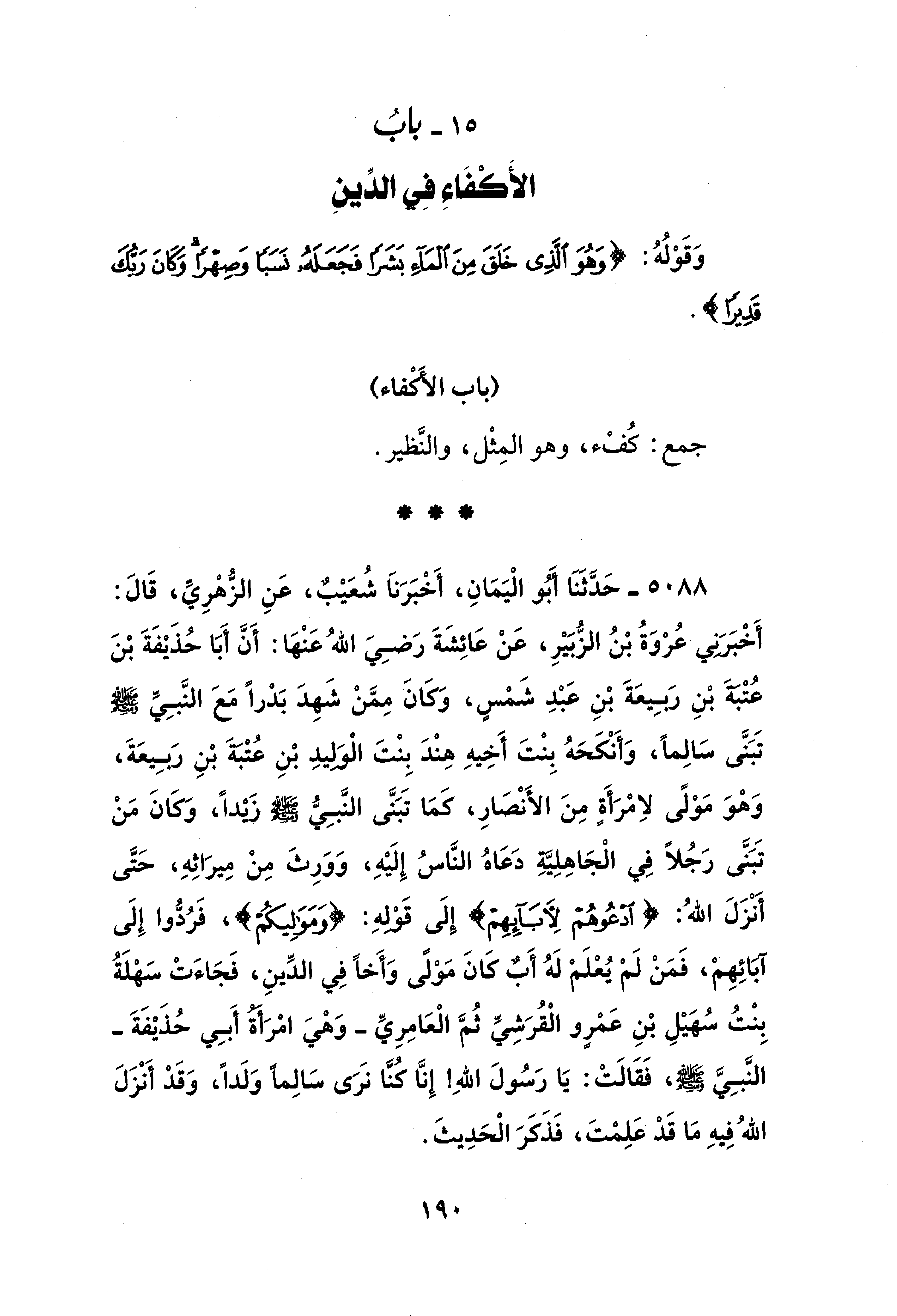 5088 - حَدَّثَنَا أَبُو الْيَمَانِ، أَخْبَرَنَا شُعَيْبٌ، عَنِ الزُّهْرِيِّ، قَالَ: أَخْبَرَني عُرْوَةُ بْنُ الزُّبَيْرِ، عَنْ عَائِشَةَ رَضِيَ اللهُ عَنْهَا: أَنَّ أَبَا حُذَيْفَةَ بْنَ عُتْبهَ بْنِ رَبِيعَةَ بْنِ عَبْدِ شَمْسٍ، وَكَانَ مِمَّنْ شَهِدَ بَدْرًا مَعَ النَّبِيِّ - صلى الله عليه وسلم - تَبَنَّى سَالِمًا، وَأَنْكَحَهُ بِنْتَ أَخِيهِ هِنْدَ بِنْتَ الْوَليدِ بْنِ عُتْبةَ بْنِ رَبِيعَةَ، وَهْوَ مَوْلًى لاِمْرَأَةٍ مِنَ الأَنْصَارِ، كَمَا تَبَنَّى النَّبِيُّ - صلى الله عليه وسلم - زَيْدًا، وَكَانَ مَنْ تَبَنَّى رَجُلًا في الْجَاهِلِيَّةِ دَعَاهُ النَّاسُ إِلَيْهِ، وَوَرِثَ مِنْ مِيرَاثِهِ، حَتَّى أَنْزَلَ اللهُ: {ادْعُوهُمْ لِآبَائِهِمْ} إِلَى قَوْلِهِ: {وَمَوَالِيكُمْ}، فَرُدُّوا إلَى آبَائِهمْ، فَمَنْ لَمْ يُعْلَمْ لَهُ أَبٌ كَانَ مَوْلًى وَأَخًا في الدِّينِ، فَجَاءَتْ سَهْلَةُ بِنْتُ سُهَيْلِ بْنِ عَمْرٍو الْقُرَشِيُّ ثُمَّ الْعَامِرِيِّ -وَهْيَ امْرَأة أَبِي حُذَيْفَةَ- النَّبِيَّ - صلى الله عليه وسلم -، فَقَالَتْ: يَا رَسُولَ اللهِ! إِنَّا كُنَّا نَرَى سَالِمًا وَلَدًا، وَقَدْ أَنْزَلَ اللهُ فِيهِ مَا قَدْ عَلِمْتَ، فَذَكَرَ الْحَدِيثَ.