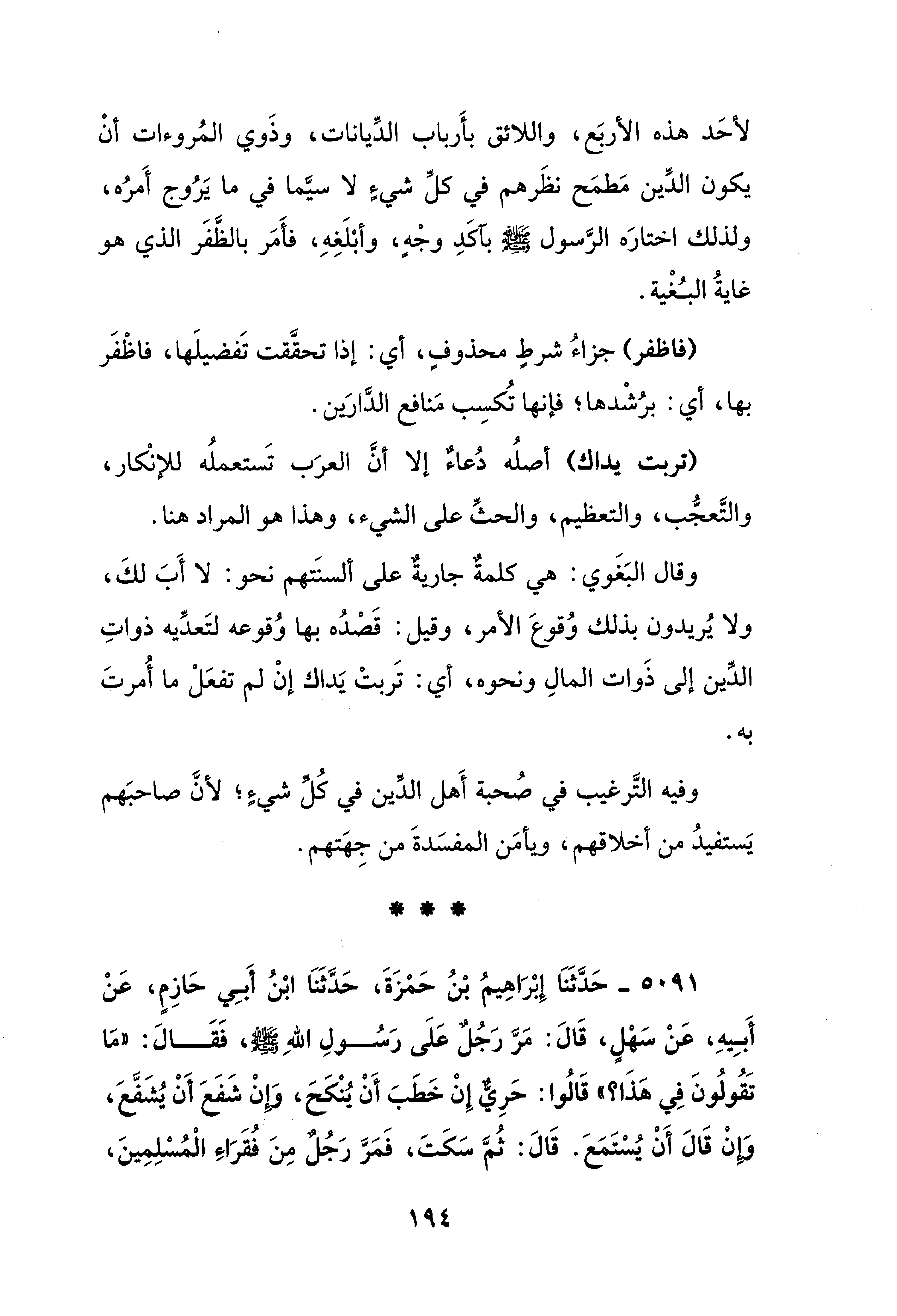 لأحَد هذه الأربَع، واللائق بأرباب الدِّيانات، وذَوي المُروءات أنْ يكون الدِّين مَطمَح نظَرهم في كلِّ شيءٍ لا سيَّما في ما يَرُوج أَمرُه، ولذلك اختارَه الرَّسول - صلى الله عليه وسلم - بآكَدِ وجْهٍ، وأبْلَغِهِ، فأَمَر بالظَّفَر الذي هو غايةُ البُغْية.