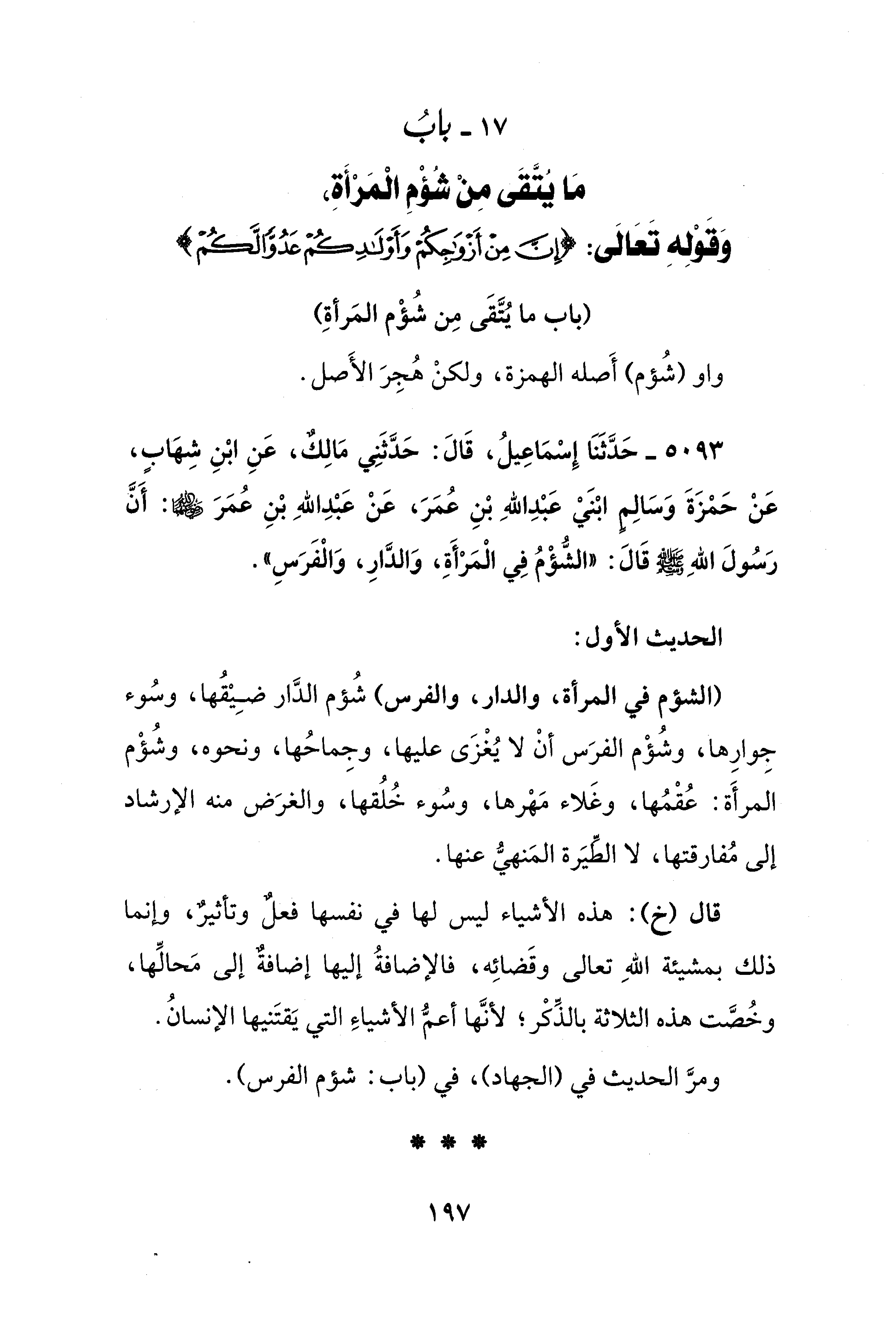 5093 - حَدَّثَنَا إِسْمَاعِيلُ، قَالَ: حَدَّثَنِي مَالِكٌ، عَنِ ابْنِ شِهَابٍ، عَنْ حَمْزَةَ وَسَالِم ابْنَيْ عَبْدِ اللهِ بْنِ عُمَرَ، عَنْ عَبْدِ اللهِ بْنِ عُمَرَ - رضي الله عنهما -: أَنَّ رَسُولَ اللهِ - صلى الله عليه وسلم - قَالَ: "الشُّؤْمُ في الْمَرْأَةِ، وَالدَّارِ، وَالْفَرَسِ".