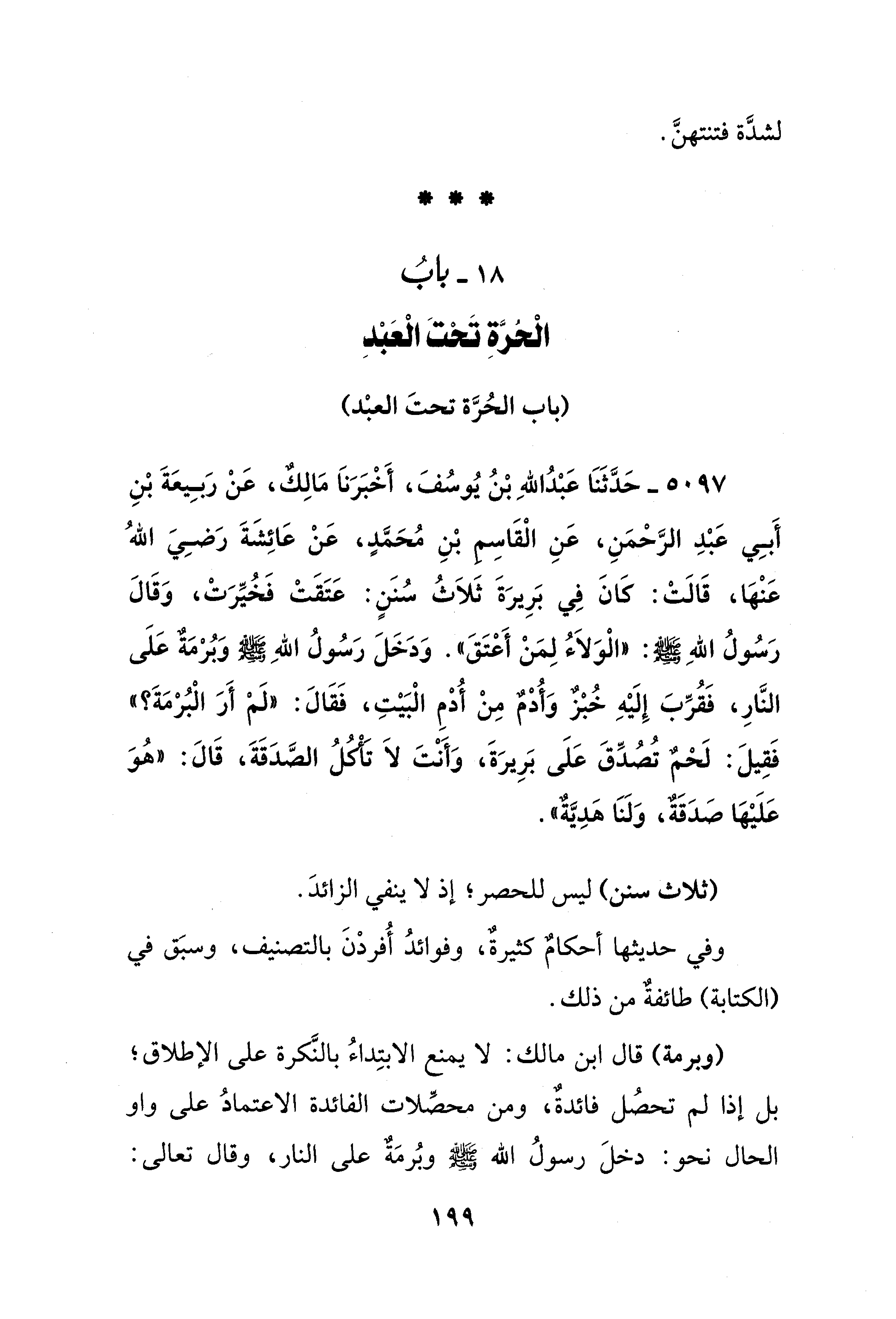 5097 - حَدَّثَنَا عَبْدُ اللهِ بْنُ يُوسُفَ، أَخْبَرَنَا مَالِكٌ، عَنْ رَبِيعَةَ بْنِ أَبِي عَبْدِ الرَّحْمَنِ، عَنِ الْقَاسِمِ بْنِ مُحمدٍ، عَنْ عَائِشَةَ رَضِيَ اللهُ عَنْهَا، قَالَتْ: كَانَ في بَرِيرَةَ ثَلاَثُ سُنَنٍ: عَتَقَتْ فَخُيِّرَتْ، وَقَالَ رَسُولُ اللهِ - صلى الله عليه وسلم -: "الْوَلاَءُ لِمَنْ أَعْتَقَ". وَدَخَلَ رَسُولُ اللهِ - صلى الله عليه وسلم - وَبُرْمَة عَلَى النَّارِ، فَقُرِّبَ إِلَيْهِ خُبْزٌ وَأُدْمٌ مِنْ أُدْمِ الْبَيْتِ، فَقَالَ: "لَمْ أَرَ الْبُرْمَةَ؟ " فَقِيلَ: لَحْمٌ تُصُدِّقَ عَلَى بَرِيرَةَ، وَأَنْتَ لَا تأكلُ الصَّدَقَةَ، قَالَ: "هُوَ عَلَيْهَا صَدَقَةٌ، وَلَنَا هَدِيَّةٌ".