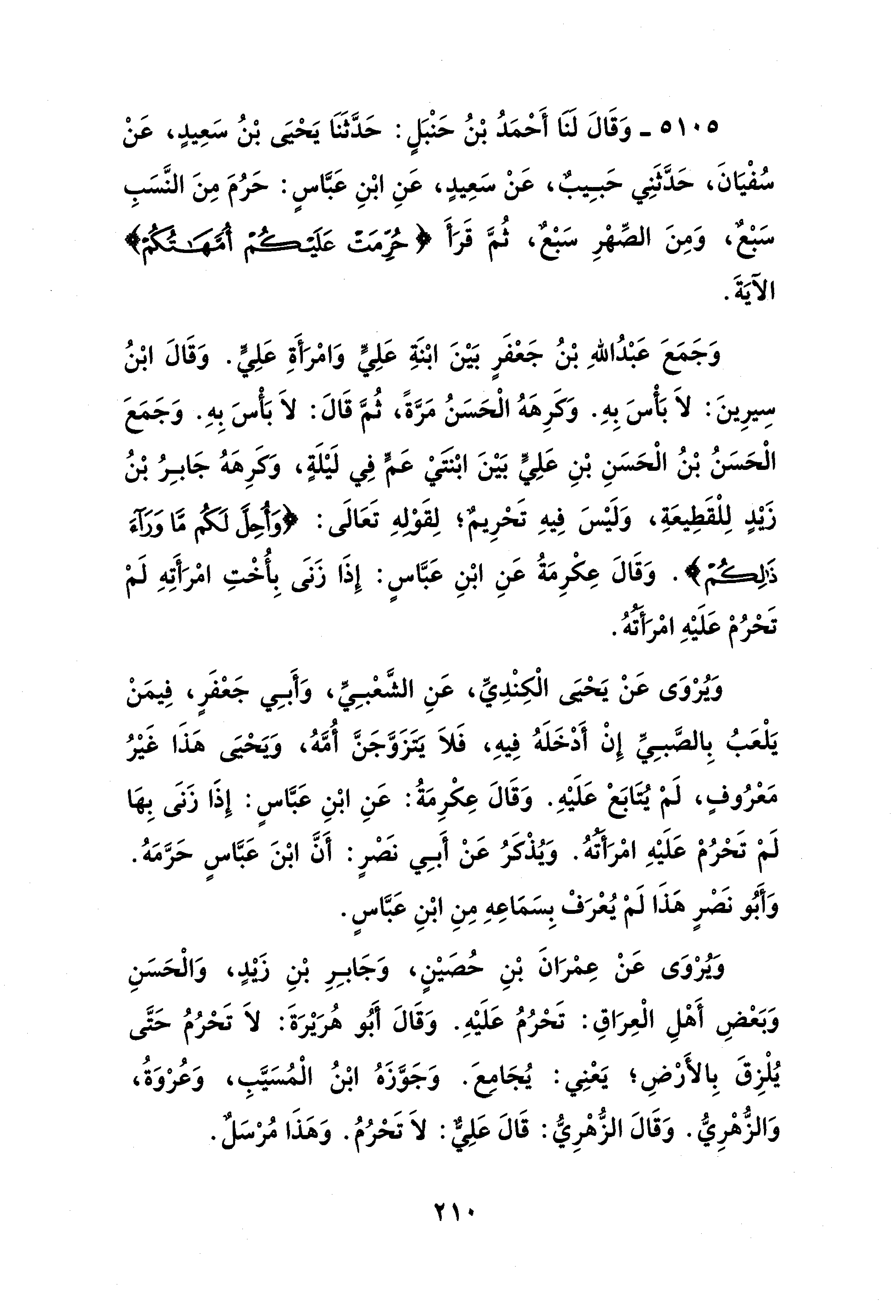 5105 - وَقَالَ لَنَا أَحْمَدُ بْنُ حَنْبَلٍ: حَدَّثَنَا يَحْيَى بْنُ سَعِيدٍ، عَنْ سُفْيَانَ، حَدَّثَنِي حَبِيبٌ، عَنْ سَعِيدٍ، عَنِ ابْنِ عَبَّاسٍ: حَرُمَ مِنَ النَّسَبِ سَبْعٌ، وَمِنَ الصِّهْرِ سَبْعٌ، ثُمَّ قَرَأَ {حُرِّمَتْ عَلَيْكُمْ أُمَّهَاتُكُمْ} الآيةَ.