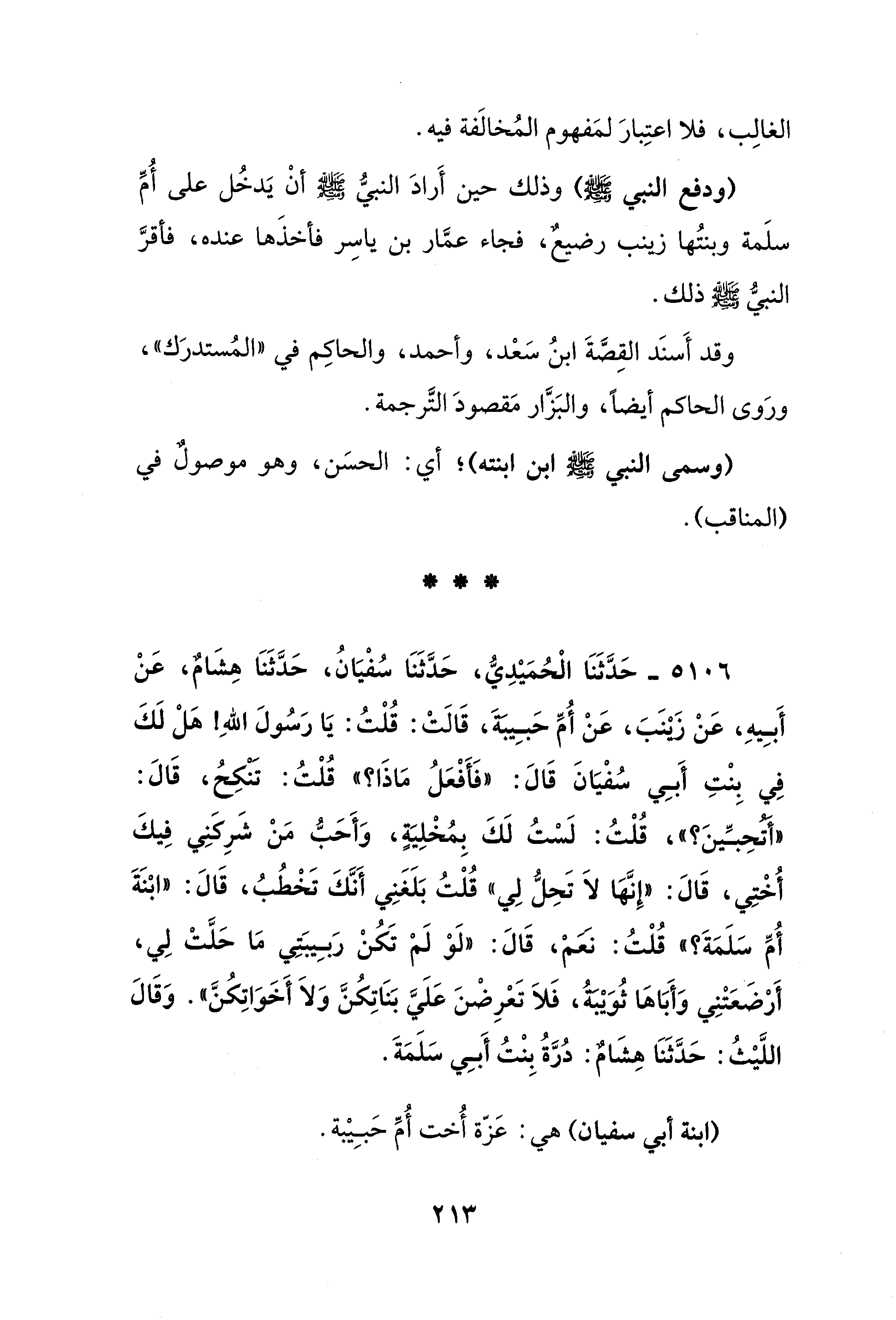 (ودفع النبي - صلى الله عليه وسلم -) وذلك حين أَرادَ النبيُّ - صلى الله عليه وسلم - أنْ يَدخُل على أُمِّ سلَمة وبنتُها زينب رضيعٌ، فجاء عمَّار بن ياسِر فأخذَها عنده، فأقرَّ النبيُّ - صلى الله عليه وسلم - ذلك.