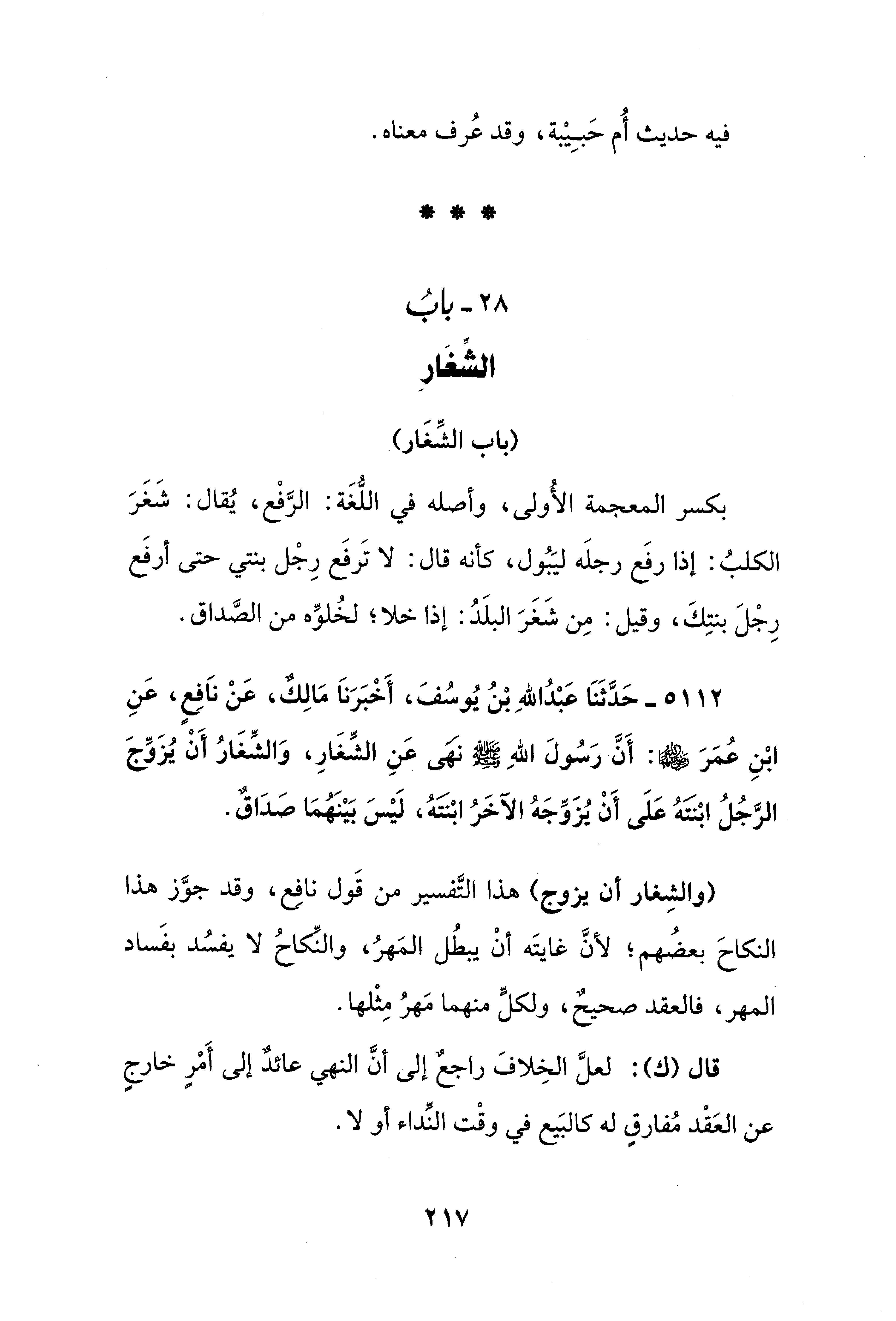 5112 - حَدَّثَنَا عَبْدُ اللهِ بْنُ يُوسُفَ، أَخْبَرَنَا مَالِكٌ، عَنْ نَافِعٍ، عَنِ ابْنِ عُمَرَ - رضي الله عنهما -: أَنَّ رَسُولَ اللهِ - صلى الله عليه وسلم - نهى عَنِ الشِّغَارِ، وَالشِّغَارُ أَنْ يُزَوِّجَ الرَّجُلُ ابْنتَهُ عَلَى أَنْ يُزَوِّجَهُ الآخَرُ ابْنتَهُ، لَيْسَ بَيْنَهمَا صَدَاقٌ.