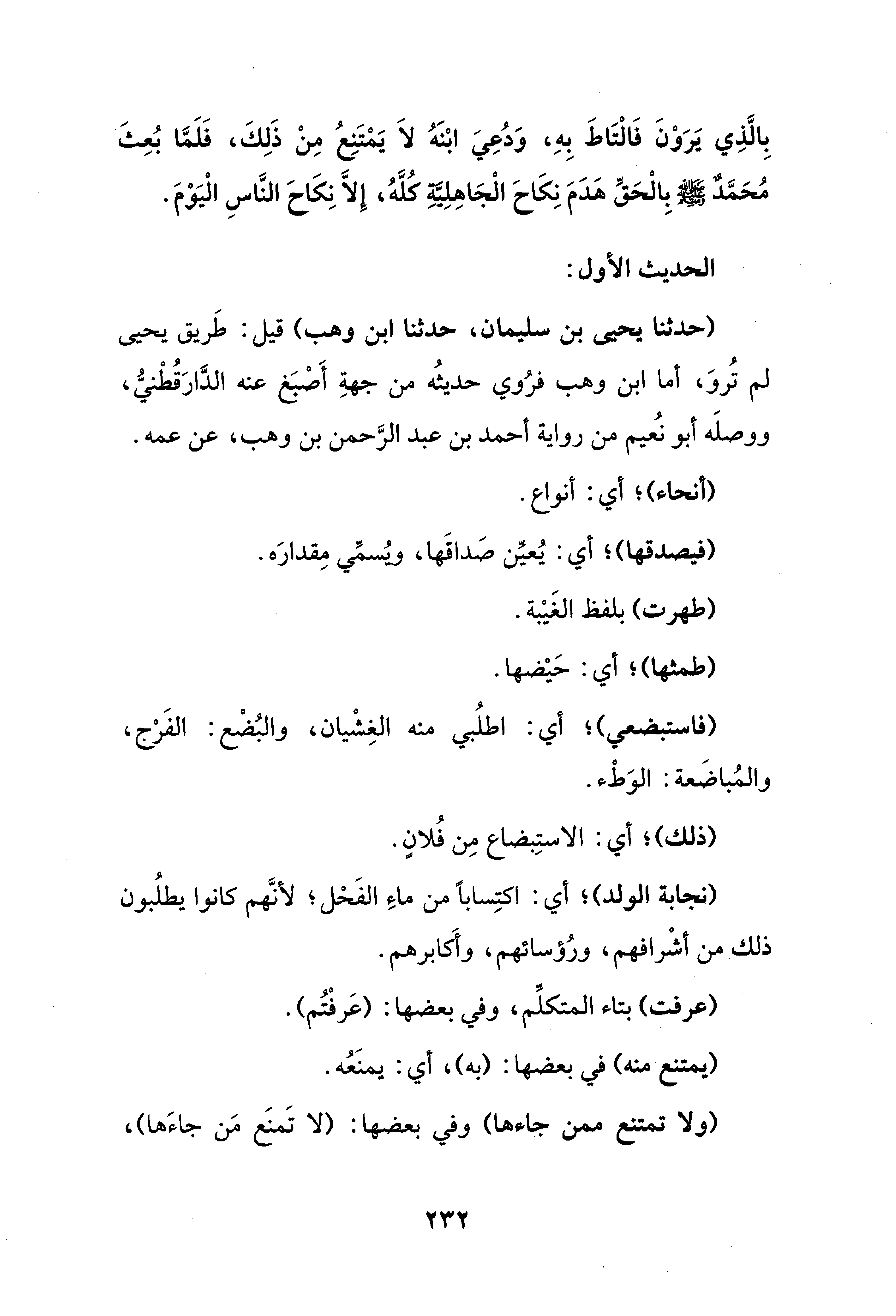 بِالَّذِي يَرَوْنَ فَالْتَاطَ بِهِ، وَدُعِيَ ابْنَهُ لَا يَمْتَنِعُ مِنْ ذَلِكَ، فَلَمَّا بُعِثَ مُحَمَّدٌ - صلى الله عليه وسلم - بِالْحَقِّ هَدَمَ نِكَاحَ الْجَاهِلِيَّةِ كُلَّهُ، إِلَّا نِكَاحَ النَّاسِ الْيَوْمَ.