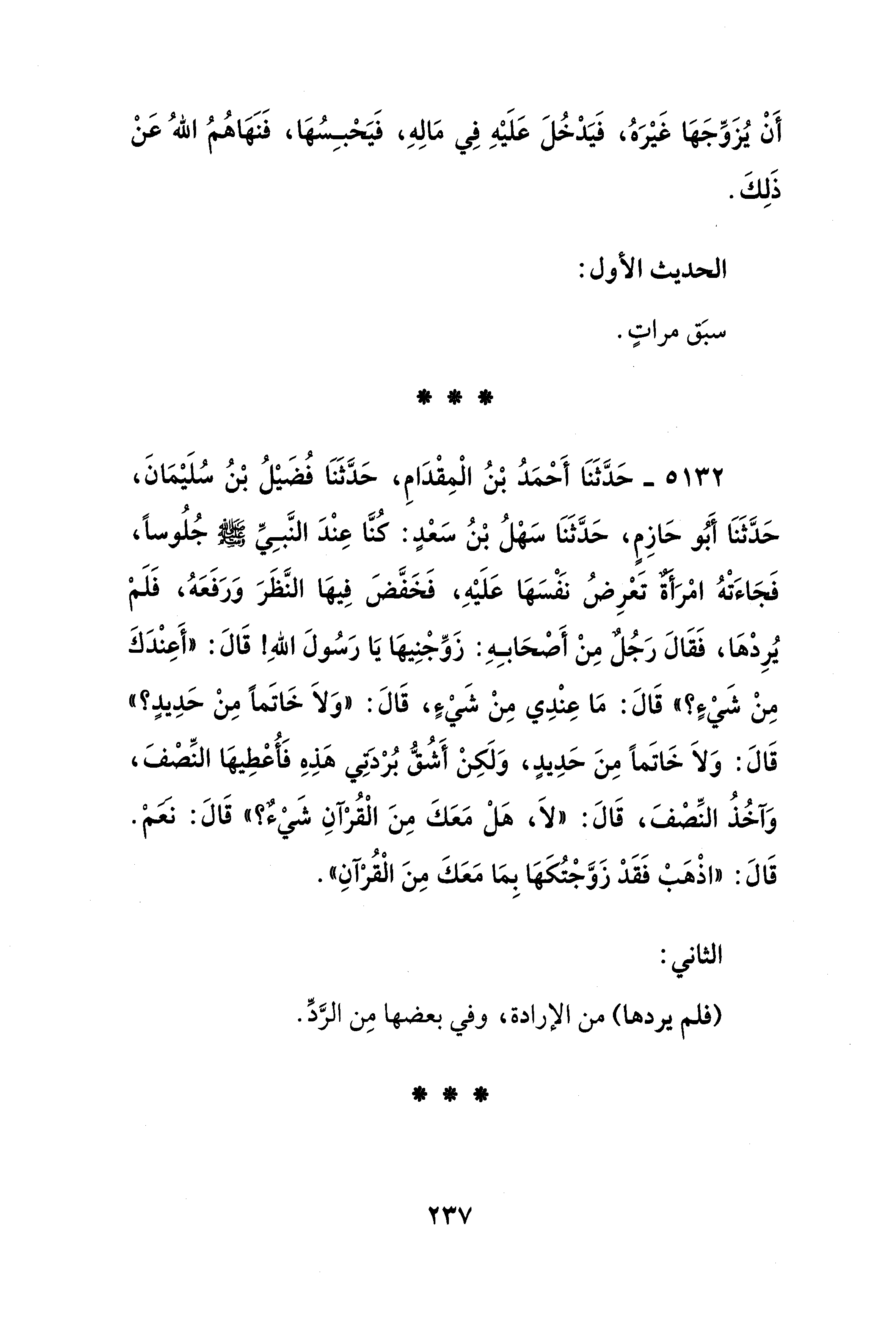 5132 - حَدَّثَنَا أَحْمَدُ بْنُ الْمِقْدَامِ، حَدَّثَنَا فُضَيْلُ بْنُ سُلَيْمَانَ، حَدَّثَنَا أَبُو حَازِمٍ، حَدَّثَنَا سَهْلُ بْنُ سَعْدٍ: كنَّا عِنْدَ النَّبِيِّ - صلى الله عليه وسلم - جُلُوسًا، فَجَاءَتْهُ امْرَأةٌ تَعْرِضُ نَفْسَهَا عَلَيْهِ، فَخَفَّضَ فِيهَا النَّظَرَ وَرَفَعَهُ، فَلَمْ يُرِدْهَا، فَقَالَ رَجُلٌ مِنْ أَصْحَابِهِ: زَوِّجْنِيهَا يَا رَسُولَ اللهِ! قَالَ: "أَعِنْدَكَ مِنْ شَيْء؟ " قَالَ: مَا عِنْدِي مِنْ شَيْء، قَالَ: "وَلَا خَاتَمًا مِنْ حَدِيدٍ؟ " قَالَ: وَلَا خَاتَمًا مِنَ حَدِيدٍ، وَلَكِنْ أَشُقُّ بُرْدتي هَذِهِ فَأُعْطِيهَا النِّصْفَ، وَآخُذُ النِّصْفَ، قَالَ: "لَا، هَلْ مَعَكَ مِنَ الْقُرْآنِ شَيْء؟ " قَالَ: نعمْ. قَالَ: "اذْهَبْ فَقَدْ زَوَّجْتُكَهَا بِمَا مَعَكَ مِنَ الْقُرْآنِ".