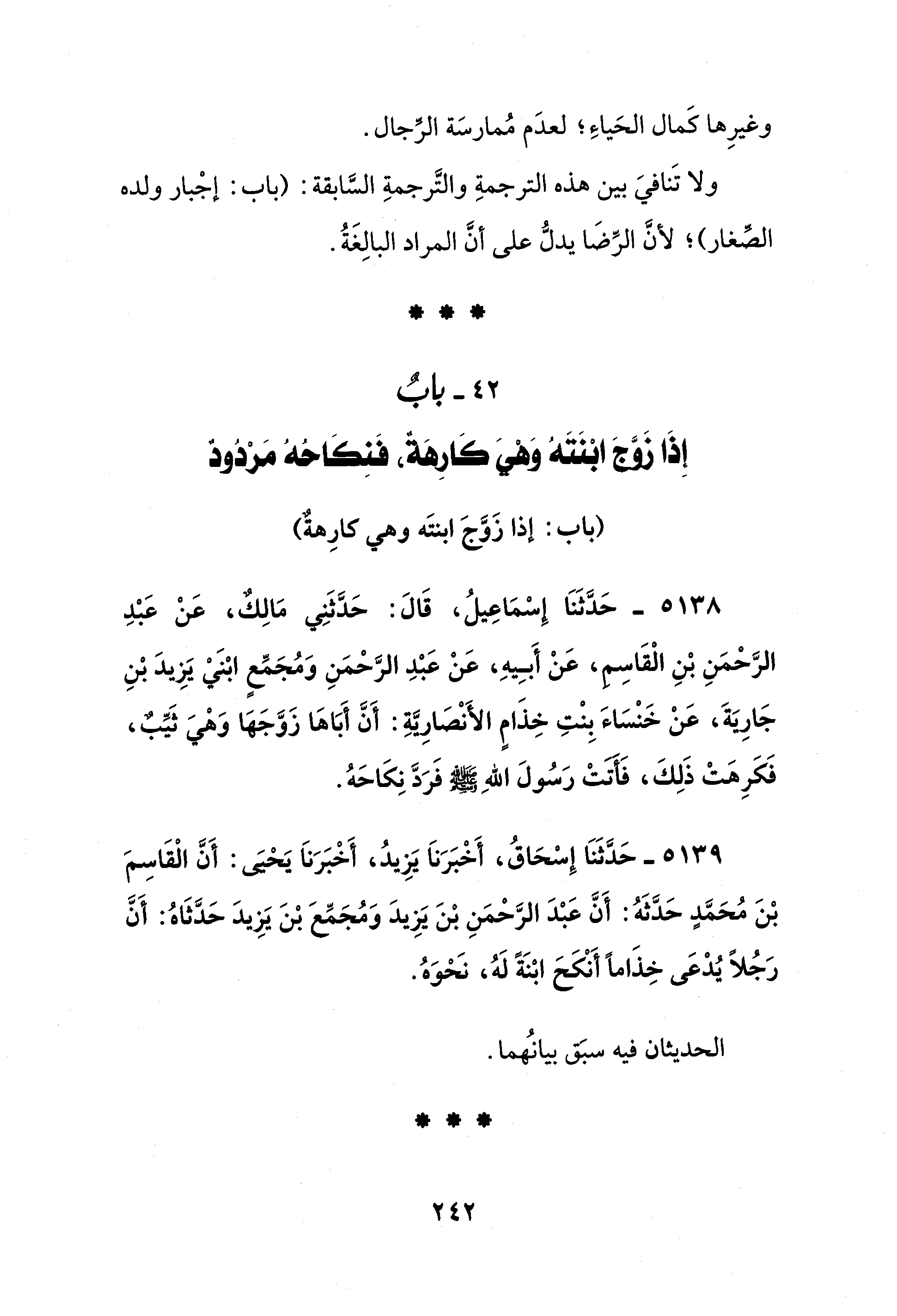 5138 - حَدَّثَنَا إِسْمَاعِيلُ، قَالَ: حَدَّثَنِي مَالِكٌ، عَنْ عَبْدِ الرَّحْمَنِ بْنِ الْقَاسم، عَنْ أَبِيهِ، عَنْ عَبْدِ الرَّحْمَنِ وَمُجَمِّع ابْنَيْ يَزِيدَ بْنِ جَارِيَةَ، عَنْ خَنْسَاءَ بِنْتِ خِذَام الأَنْصَارِيَّةِ: أَنَّ أَبَاهَا زَوَّجَهَا وَهْيَ ثَيِّبٌ، فَكَرِهَتْ ذَلِكَ، فَأَتَتْ رَسُولَ اللهِ - صلى الله عليه وسلم - فَرَدَّ نِكَاحَهُ.
