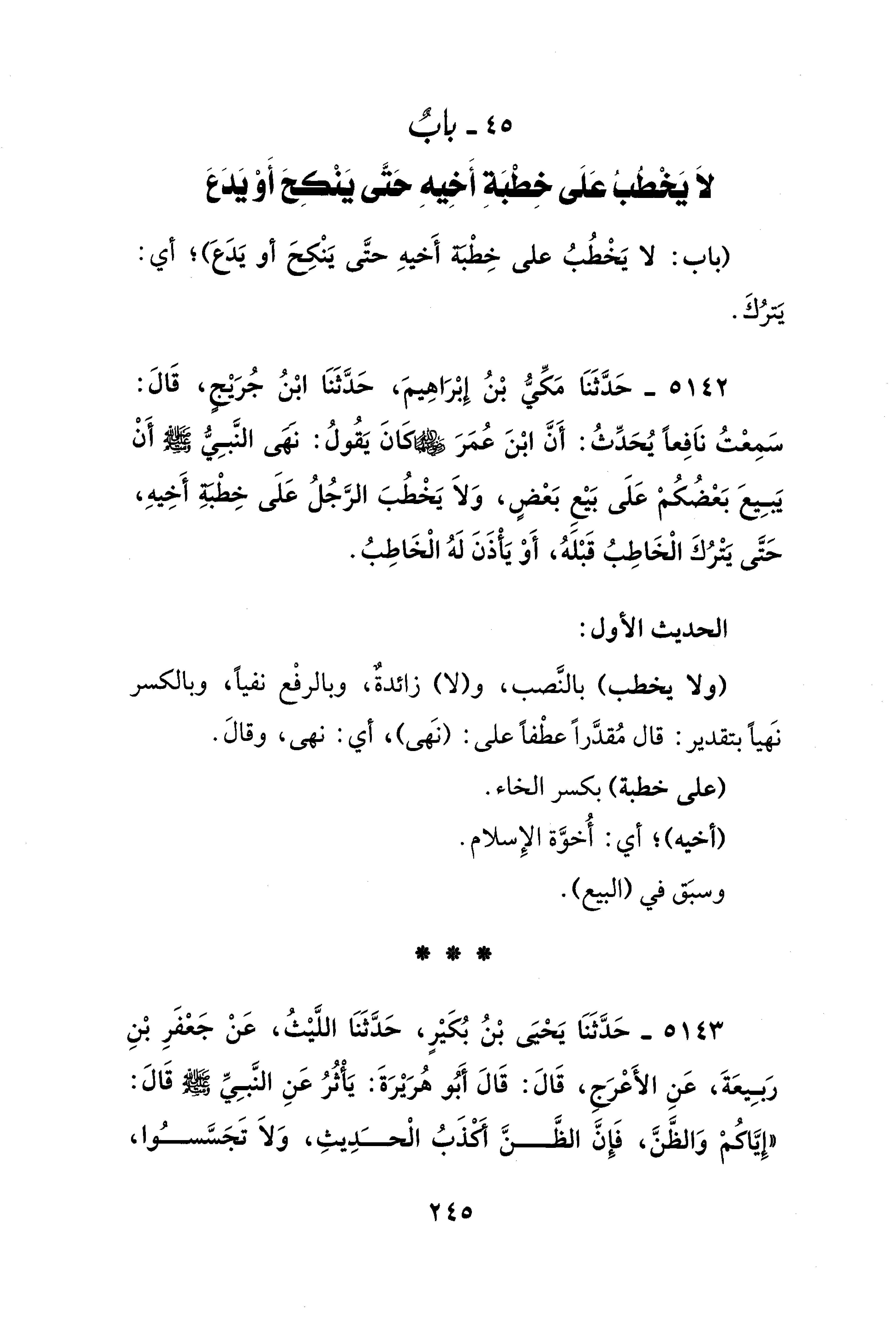 5142 - حَدَّثَنَا مَكِّيُّ بْنُ إِبْرَاهِيمَ، حَدَّثَنَا ابْنُ جُرَيْجٍ، قَالَ: سَمِعْتُ نَافِعًا يُحَدِّثُ: أَنَّ ابْنَ عُمَرَ - رضي الله عنهما - كَانَ يَقُولُ: نهى النَّبِيُّ - صلى الله عليه وسلم - أَنْ يَبِيعَ بَعْضُكُمْ عَلَى بَيْعِ بَعْضٍ، وَلَا يَخْطُبَ الرَّجُلُ عَلَى خِطْبةِ أَخِيهِ، حَتَّى يترُكَ الْخَاطِبُ قَبْلَهُ، أَوْ يَأذَنَ لَهُ الْخَاطِبُ.