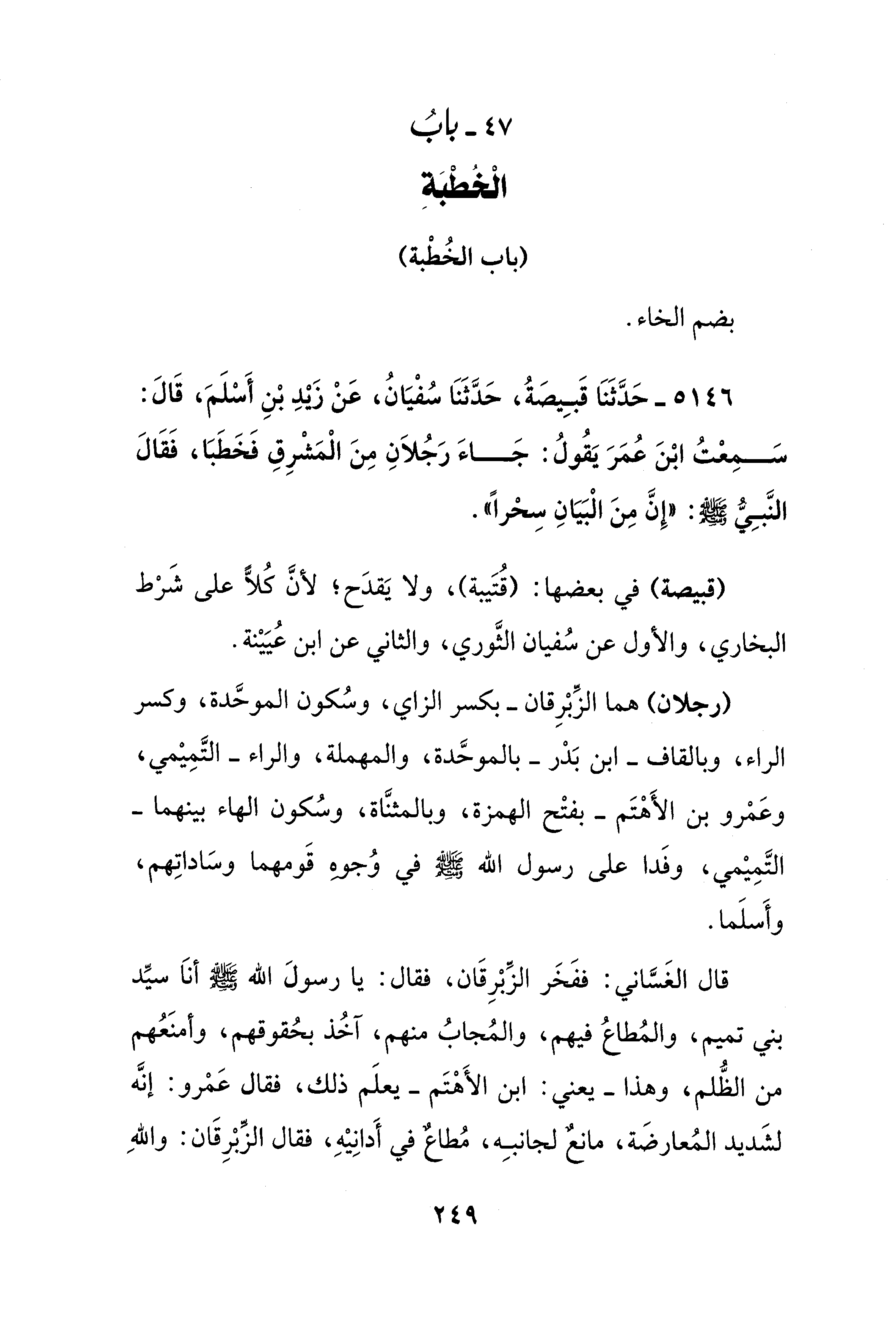 5146 - حَدَّثَنَا قَبِيصَةُ، حَدَّثَنَا سُفْيَانُ، عَنْ زيدِ بْنِ أَسْلَمَ، قَالَ: سَمِعْتُ ابْنَ عُمَرَ يَقُولُ: جَاءَ رَجُلاَنِ مِنَ الْمَشْرِقِ فَخَطَبَا، فَقَالَ النَّبِيُّ - صلى الله عليه وسلم -: "إِنَّ مِنَ الْبَيَانِ سِحْرًا".