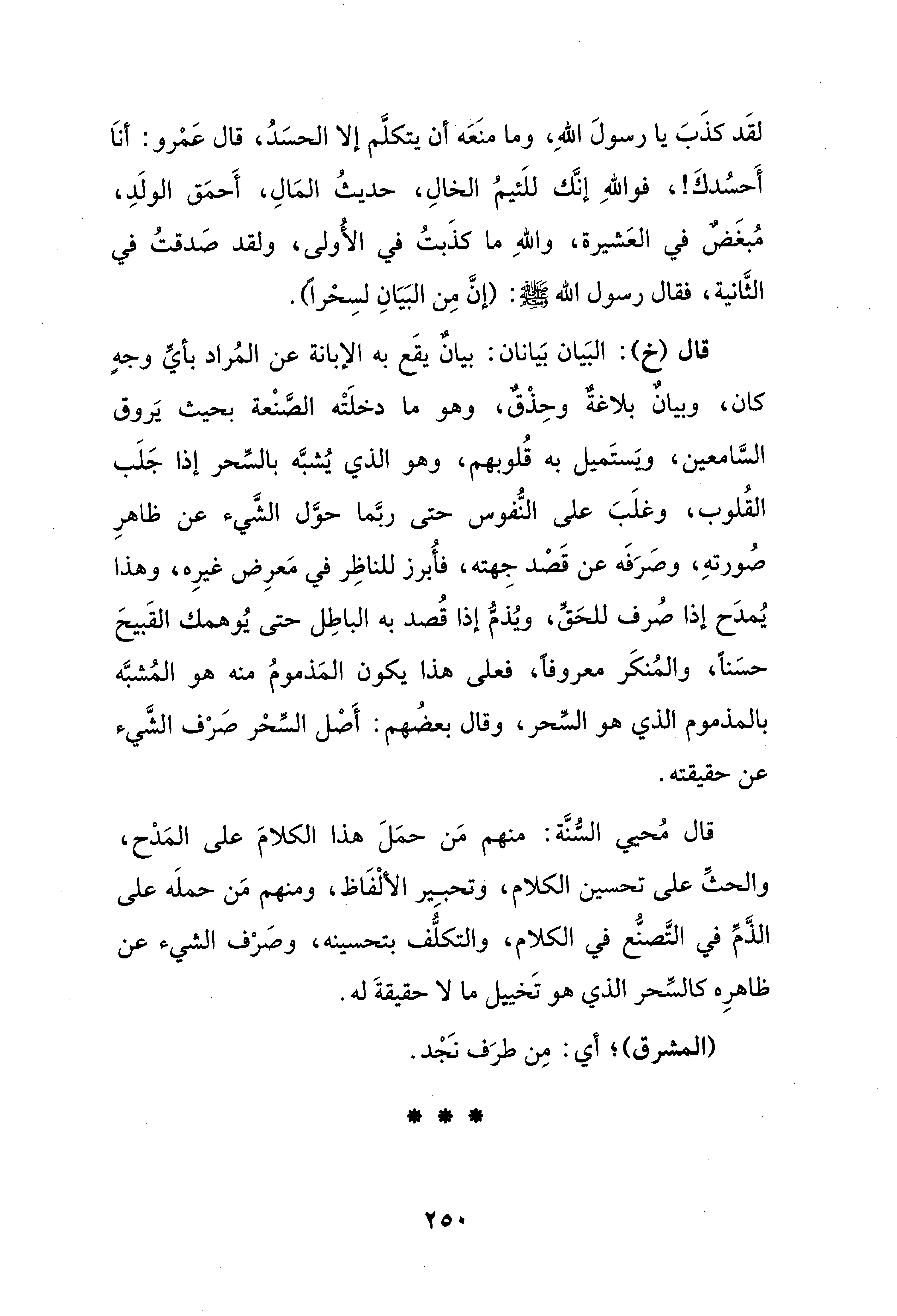 لقَد كذَبَ يا رسولَ الله، وما منَعَه أن يتكلَّم إلا الحسَدُ، قال عَمْرو: أنَا أَحسُدكَ!، فواللهِ إنَّك للَئيمُ الخالِ، حديثُ المَالِ، أَحمَق الولَدِ، مُبغَضٌ في العَشيرة، واللهِ ما كذَبتُ في الأُولى، ولقد صَدقتُ في الثَّانية، فقال رسول الله - صلى الله عليه وسلم -: (إنَّ مِن البَيَانِ لسِحْرًا).