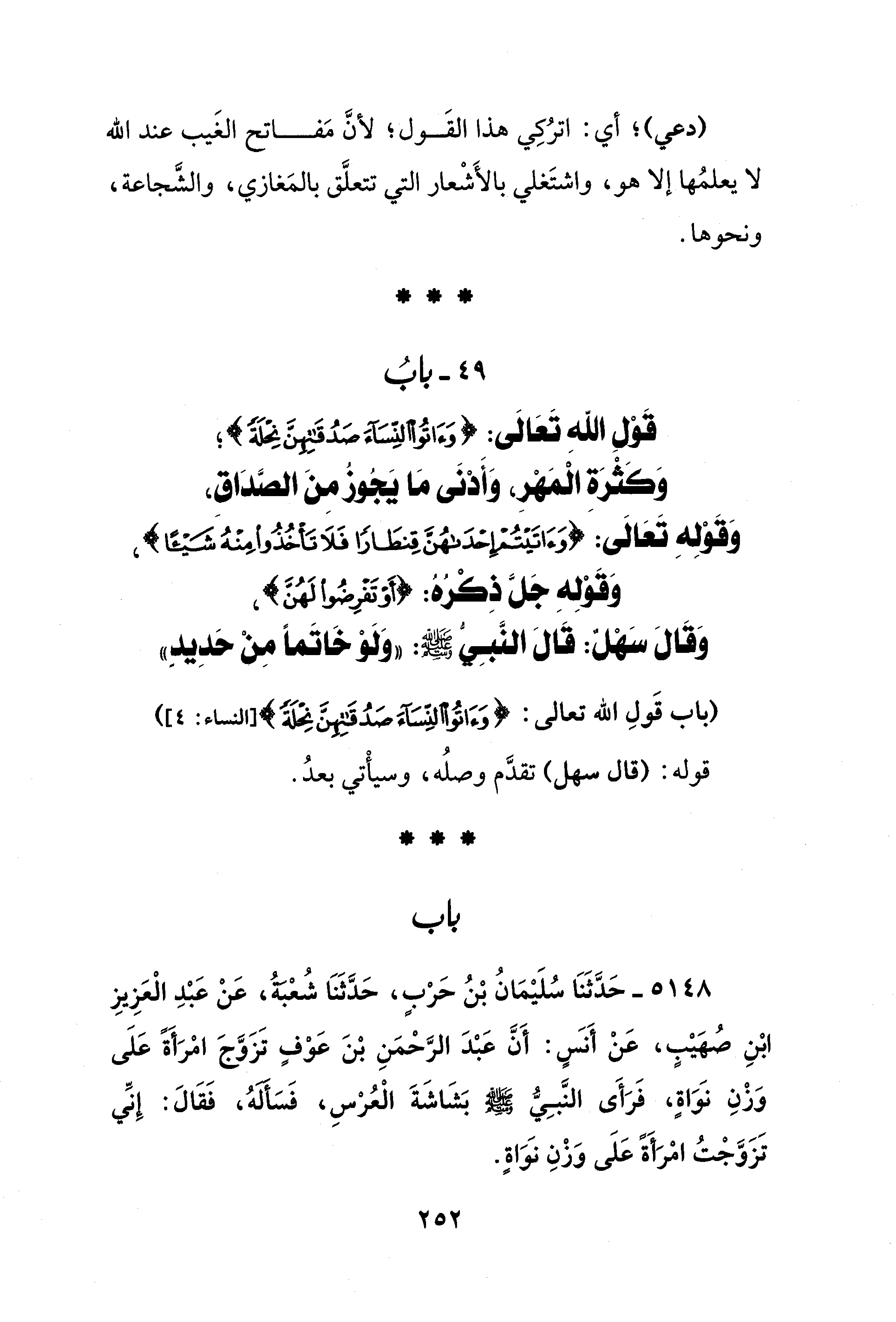49 - بابُ قولِ الله تعالَى: {وَآتُوا النِّسَاءَ صَدُقَاتِهِنَّ نِحْلَةً}؛ وَكَثْرَة الْمَهْرِ، وَأَدْنَى مَا يَجُوزُ مِنَ الصدَاقِ، وَقوِلِه تعالَى: {وَآتَيْتُمْ إِحْدَاهُنَّ قِنْطَارًا فَلَا تَأْخُذُوا مِنْهُ شَيْئًا} , وَقَوْلِهِ جَلَّ ذِكرُهُ: {أَوْ تَفْرِضُوا لَهُنَّ}، وَقَالَ سَهْلٌ: قَالَ النبِيُّ - صلى الله عليه وسلم -: "وَلَوْ خَاتَمًا مِنْ حَدِيدٍ"