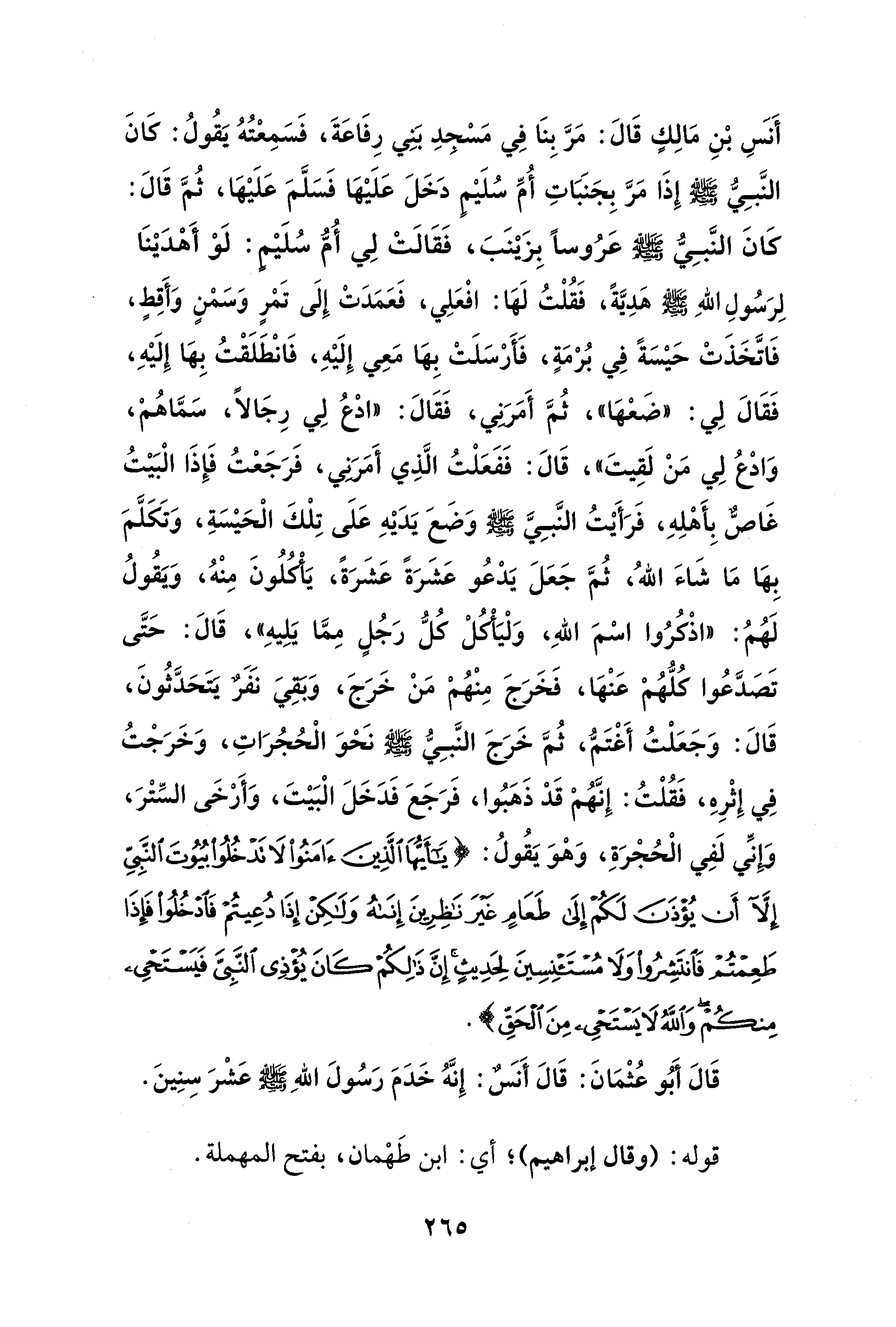 أَنس بْنِ مَالِكٍ قَالَ: مَرَّ بِنَا في مَسْجدِ بَنِي رِفَاعَةَ، فَسَمِعْتُهُ يَقُولُ: كَانَ النَّبِيُّ - صلى الله عليه وسلم - إِذَا مَرَّ بِجَنَبَاتِ أُمِّ سُلَيْمٍ دَخَلَ عَلَيْهَا فَسَلَّمَ عَلَيْهَا، ثُمَّ قَالَ: كانَ النَّبِيُّ - صلى الله عليه وسلم - عَرُوسًا بِزَيْنَبَ، فَقَالَتْ لِي أُمُّ سُلَيْم: لَوْ أَهْدَيْنَا لِرَسُولِ اللهِ - صلى الله عليه وسلم - هَدِيَّةً، فَقُلْتُ لَهَا: افْعَلِي، فَعَمَدَتْ إِلَى تَمْرٍ وَسَمْنٍ وَأَقِطٍ، فَاتَّخَذَتْ حَيْسَةً في بُرْمَةٍ، فَأَرْسَلَتْ بِهَا مَعِي إِلَيْهِ، فَانْطَلَقْتُ بِهَا إِلَيْهِ، فَقَالَ لِي: "ضَعْهَا"، ثُمَّ أَمَرَني، فَقَالَ: "ادْع لِي رِجَالًا، سَمَّاهُمْ، وَادْع لِي مَنْ لَقِيتَ"، قَالَ: فَفَعَلْتُ الَّذِي أَمَرَني، فَرَجَعْتُ فَإِذَا الْبَيْتُ غَاصٌّ بِأَهْلِهِ، فَرَأَيْتُ النَّبِيَّ - صلى الله عليه وسلم - وَضَعَ يَدَيْهِ عَلَى تِلْكَ الْحَيْسَةِ، وَتَكَلَّمَ بِهَا مَا شَاءَ اللهُ، ثُمَّ جَعَلَ يَدْعُو عَشَرَةً عَشَرَةً، يَأكلُونَ مِنْهُ، وَيَقُولُ لَهُمُ: "اذْكُرُوا اسْمَ اللهِ، وَلْيَأكلْ كلُّ رَجُلٍ مِمَّا يَلِيهِ"، قَالَ: حَتَّى تَصَدَّعُوا كلُّهُمْ عَنْهَا، فَخَرَجَ مِنْهُمْ مَنْ خَرَجَ، وَبَقِيَ نَفَرٌ يتحَدَّثُونَ، قَالَ: وَجَعَلْتُ أَغْتَمُّ، ثُمَّ خَرَجَ النَّبِيُّ - صلى الله عليه وسلم - نَحْوَ الْحُجُرَاتِ، وَخَرَجْتُ في إِثْرِهِ، فَقُلْتُ: إِنَّهُمْ قَدْ ذَهَبُوا، فَرَجَعَ فَدَخَلَ الْبَيْتَ، وَأَرْخَى السِّتْرَ، وإنِّي لَفِي الْحُجْرَةِ، وَهْوَ يَقُولُ: {يَا أَيُّهَا الَّذِينَ آمَنُوا لَا تَدْخُلُوا بُيُوتَ النَّبِيِّ إلا أَنْ يُؤْذَنَ لَكُمْ إِلَى طَعَامٍ غَيْرَ نَاظِرِينَ إِنَاهُ وَلَكِنْ إِذَا دُعِيتُمْ فَادْخُلُوا فَإِذَا طَعِمْتُمْ فَانْتَشِرُوا وَلَا مُسْتَأْنِسِينَ لِحَدِيثٍ إِنَّ ذَلِكُمْ كَانَ يُؤْذِي النَّبِيَّ فَيَسْتَحْيِي مِنْكُمْ وَاللَّهُ لَا يَسْتَحْيِي مِنَ الْحَقِّ}.