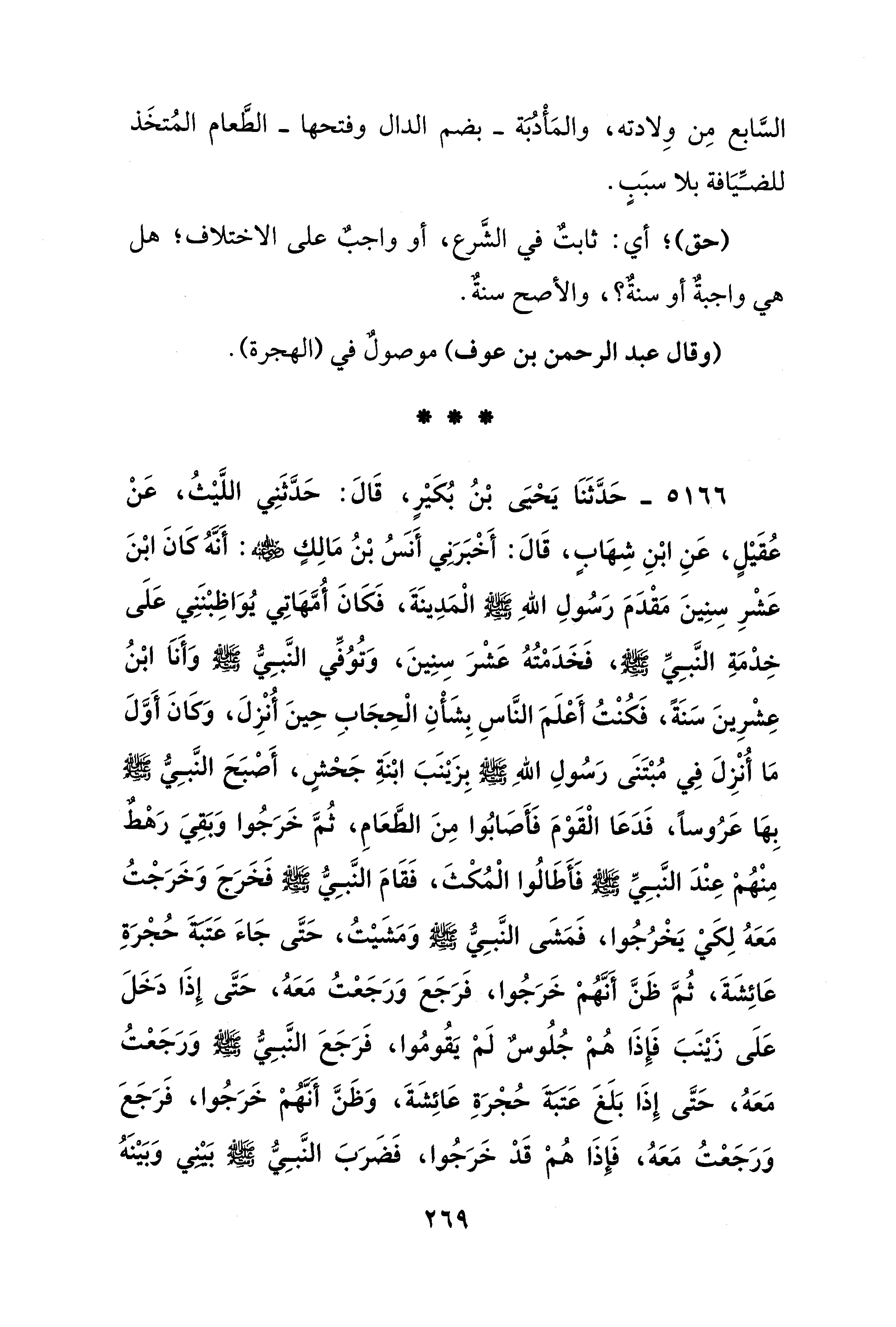 5166 - حَدَّثَنَا يَحْيَى بْنُ بُكَيْرٍ، قَالَ: حَدَّثَنِي اللَّيْثُ، عَنْ عُقَيْلٍ، عَنِ ابْنِ شِهَابٍ، قَالَ: أَخْبَرَنِي أَنسُ بْنُ مَالِكٍ - رضي الله عنه -: أَنَّهُ كَانَ ابْنَ عَشْرِ سِنِينَ مَقْدَمَ رَسُولِ اللهِ - صلى الله عليه وسلم - الْمَدِينَةَ، فَكَانَ أُمَّهَاتِي يُوَاظِبْنَنِي عَلَى خِدْمَةِ النَّبِيِّ - صلى الله عليه وسلم -، فَخَدَمْتُهُ عَشْرَ سِنِينَ، وَتُوُفِّي النَّبِي - صلى الله عليه وسلم - وَأَنَا ابنُ عِشْرِينَ سَنَةً، فَكُنْتُ أَعْلَمَ النَّاسِ بِشَأنِ الْحِجَابِ حِينَ أُنْزِلَ، وَكَانَ أَوَّلَ مَا أُنْزِلَ في مُبْتَنَى رَسُولِ اللهِ - صلى الله عليه وسلم - بِزَيْنَبَ ابْنَةِ جَحْشٍ، أَصْبَحَ النَّبِيُّ - صلى الله عليه وسلم - بِهَا عَرُوسًا، فَدَعَا الْقَوْمَ فَأَصَابُوا مِنَ الطَّعَامِ، ثُمَّ خَرَجُوا وَبَقِيَ رَهْطٌ مِنْهُمْ عِنْدَ النَّبِيِّ - صلى الله عليه وسلم - فَأَطَالُوا الْمُكْثَ، فَقَامَ النَّبِيُّ - صلى الله عليه وسلم - فَخَرَجَ وَخَرَجْتُ مَعَهُ لِكَي يَخْرُجُوا، فَمَشَى النَّبِي - صلى الله عليه وسلم - وَمَشَيتُ، حَتَّى جَاءَ عَتَبةَ حُجْرَةِ عَائِشَةَ، ثُمَّ ظَنَّ أَنَّهُمْ خَرَجُوا، فَرَجَعَ وَرَجَعْتُ مَعَهُ، حَتَّى إِذَا دَخَلَ عَلَى زينَبَ فَإِذَا هُمْ جُلُوسٌ لَمْ يَقُومُوا، فَرَجَعَ النَّبِيُّ - صلى الله عليه وسلم - وَرَجَعْتُ مَعَهُ، حَتَّى إِذَا بَلَغَ عَتبة حُجْرَةِ عَائِشَةَ، وَظَنَّ أَنَّهمْ خَرَجُوا، فَرَجَعَ وَرَجَعْتُ مَعَهُ، فَإذَا هُمْ قَدْ خَرَجُوا، فَضَرَبَ النَّبِيُّ - صلى الله عليه وسلم - بَيْني وَبَيْنَهُ