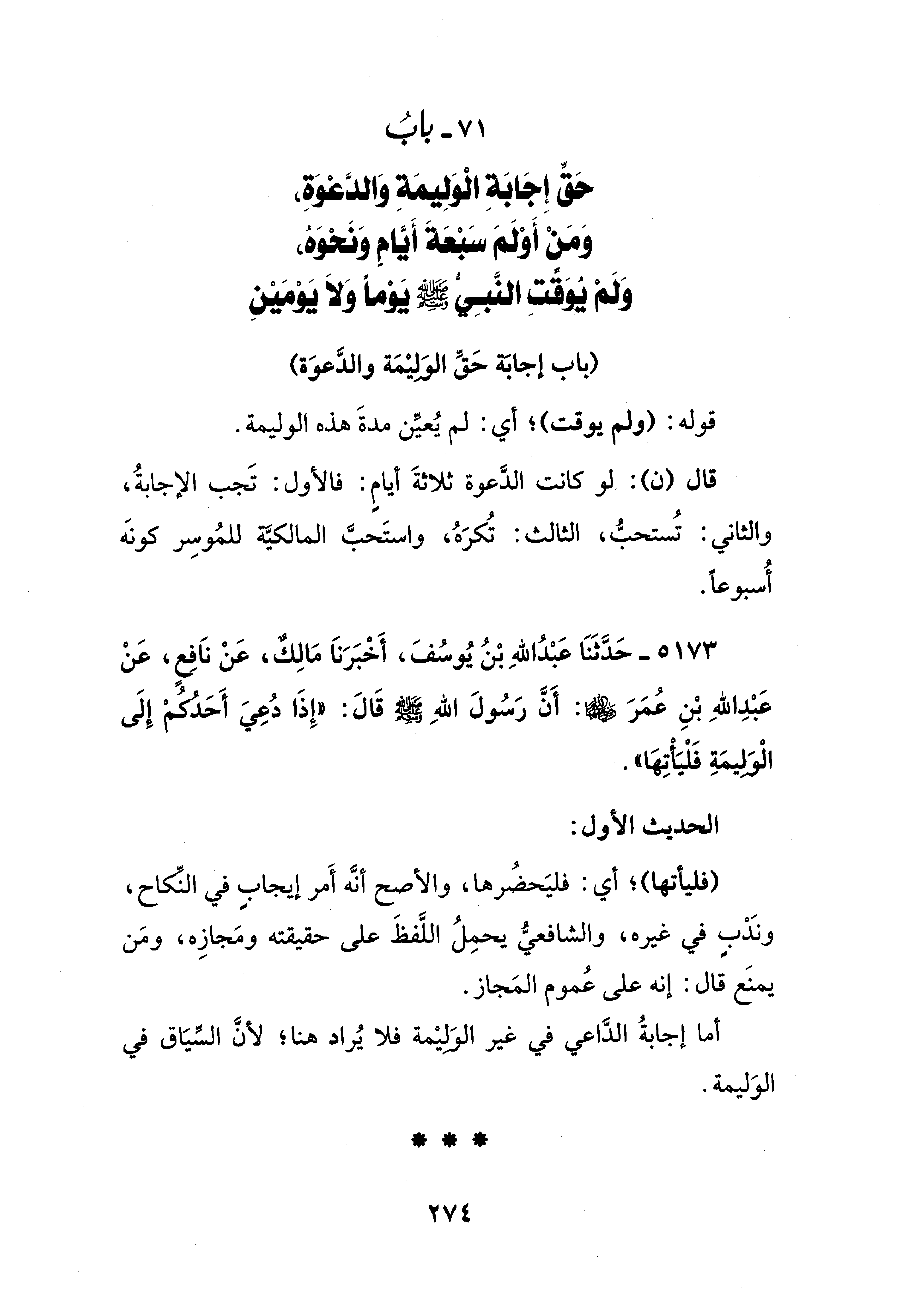 5173 - حَدَّثَنَا عَبْدُ اللهِ بْنُ يُوسُفَ، أَخْبَرَنَا مَالِكٌ، عَنْ نَافِعٍ، عَنْ عَبْدِ اللهِ بْنِ عُمَرَ - رضي الله عنهما -: أَنَّ رَسُولَ اللهِ - صلى الله عليه وسلم - قَالَ: "إِذَا دُعيِ أَحَدُكُمْ إِلَى الْوَليمَةِ فَلْيَأتِهَا".