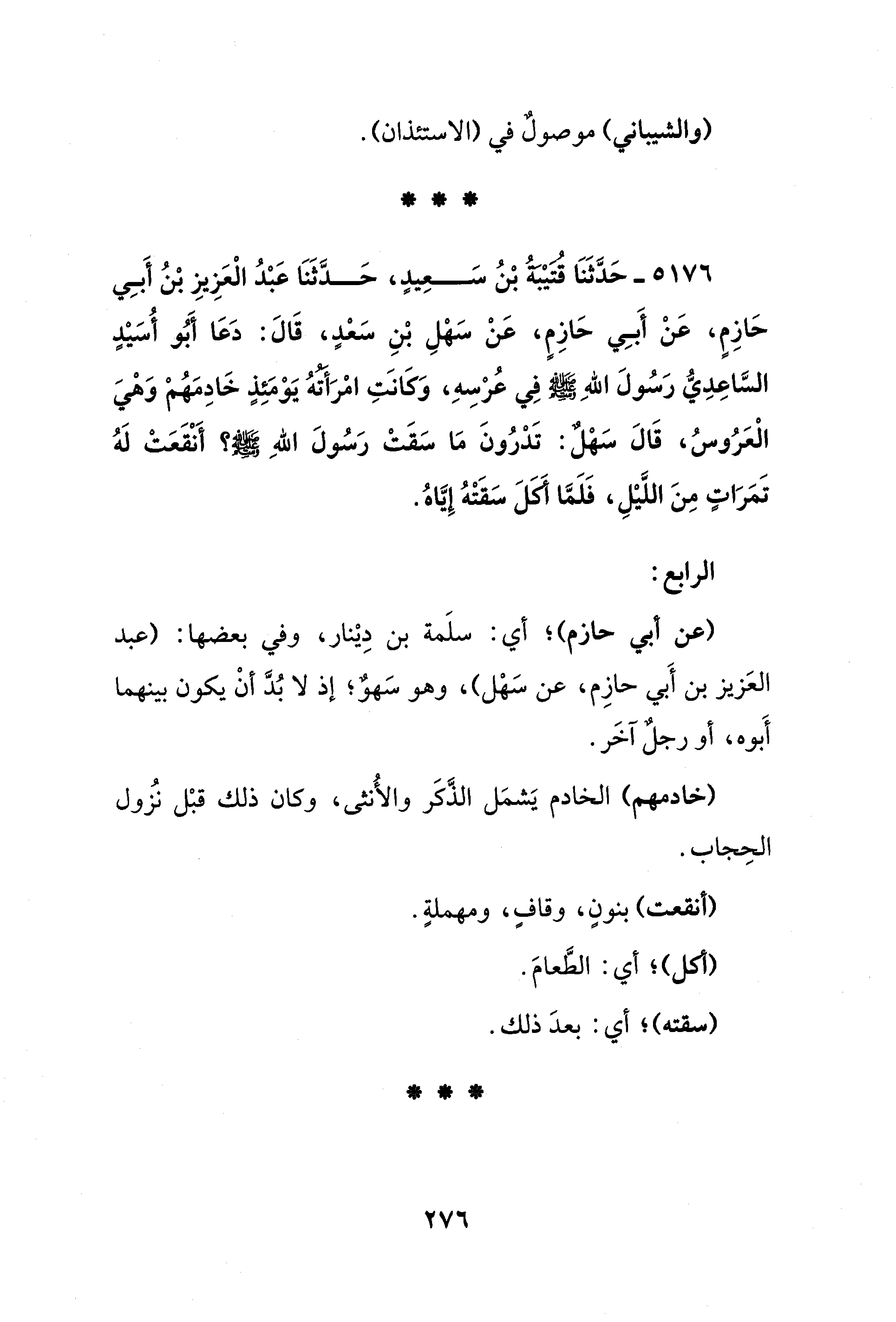 5176 - حَدَّثَنَا قُتَيْبَةُ بْنُ سَعِيدٍ، حَدَّثَنَا عَبْدُ الْعَزِيزِ بْنُ أَبِي حَازِمٍ، عَنْ أَبِي حَازِمٍ، عَنْ سَهْلِ بْنِ سَعْدٍ، قَالَ: دَعَا أبُو أسُيْدٍ السَّاعِدِيُّ رَسُولَ اللهِ - صلى الله عليه وسلم - فِي عُرْسِهِ، وَكَانَتِ امْرَأتُهُ يَوْمَئِذٍ خَادِمَهُمْ وَهْيَ الْعَرُوسُ، قَالَ سَهْلٌ: تَدْرُونَ مَا سَقَتْ رَسُولَ اللهِ - صلى الله عليه وسلم -؟ أَنْقَعَتْ لَهُ تَمَرَاتٍ مِنَ اللَّيْلِ، فَلَمَّا أَكَلَ سَقَتْهُ إِيَّاهُ.