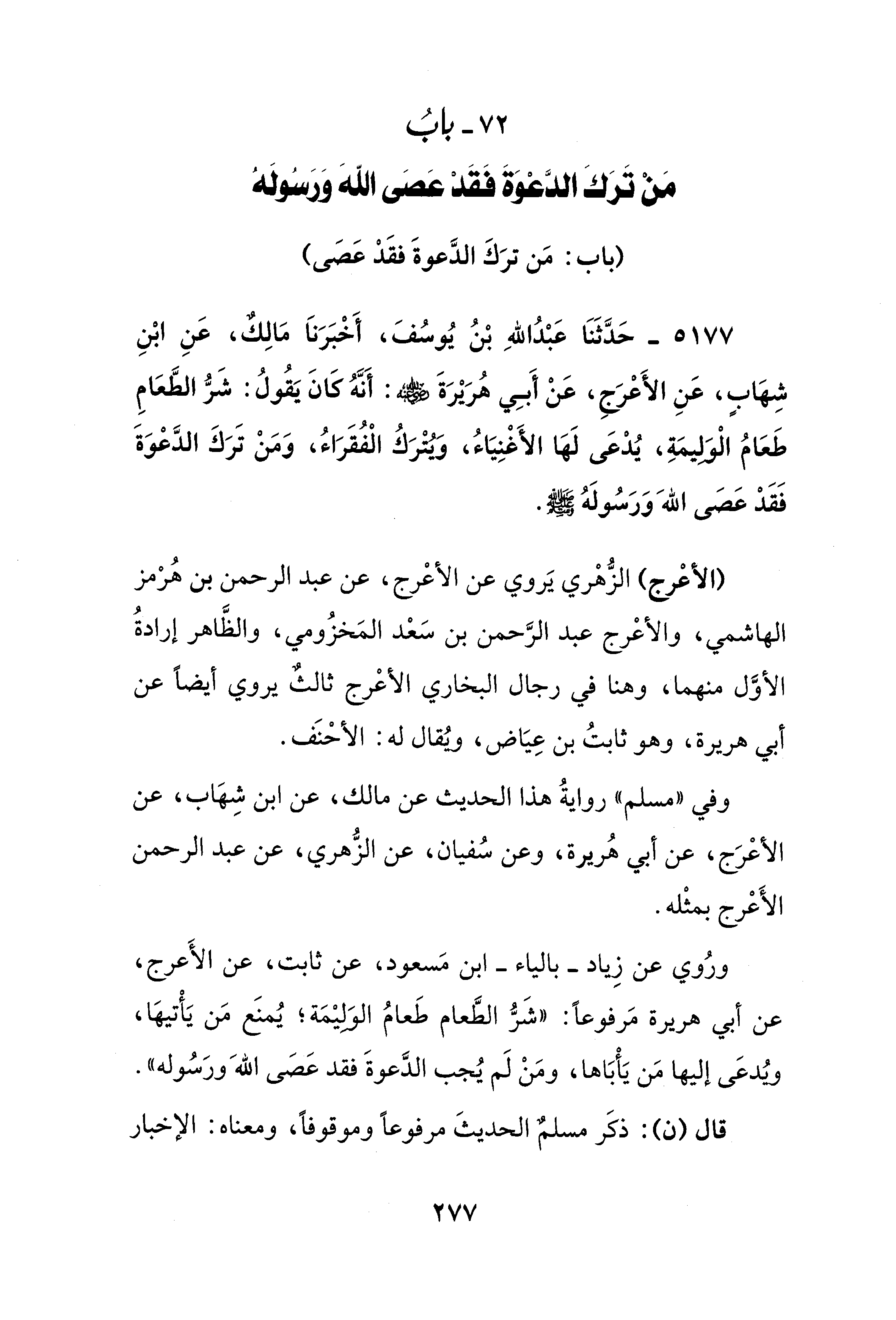 5177 - حَدَّثَنَا عَبْدُ اللهِ بْنُ يُوسُفَ، أَخْبَرَنَا مَالِكٌ، عَنِ ابْنِ شِهَابٍ، عَنِ الأَعْرَجِ، عَنْ أَبِي هُرَيْرَةَ - رضي الله عنه -: أَنَّهُ كَانَ يَقُولُ: شَرُّ الطَّعَامِ طَعَامُ الْوَلِيمَةِ، يُدْعَى لَهَا الأَغْنِيَاءُ، وَيُتْرَكُ الْفُقَرَاءُ، وَمَنْ تَرَكَ الدَّعْوَةَ فَقَدْ عَصَى اللهَ وَرَسُولَهُ - صلى الله عليه وسلم -.