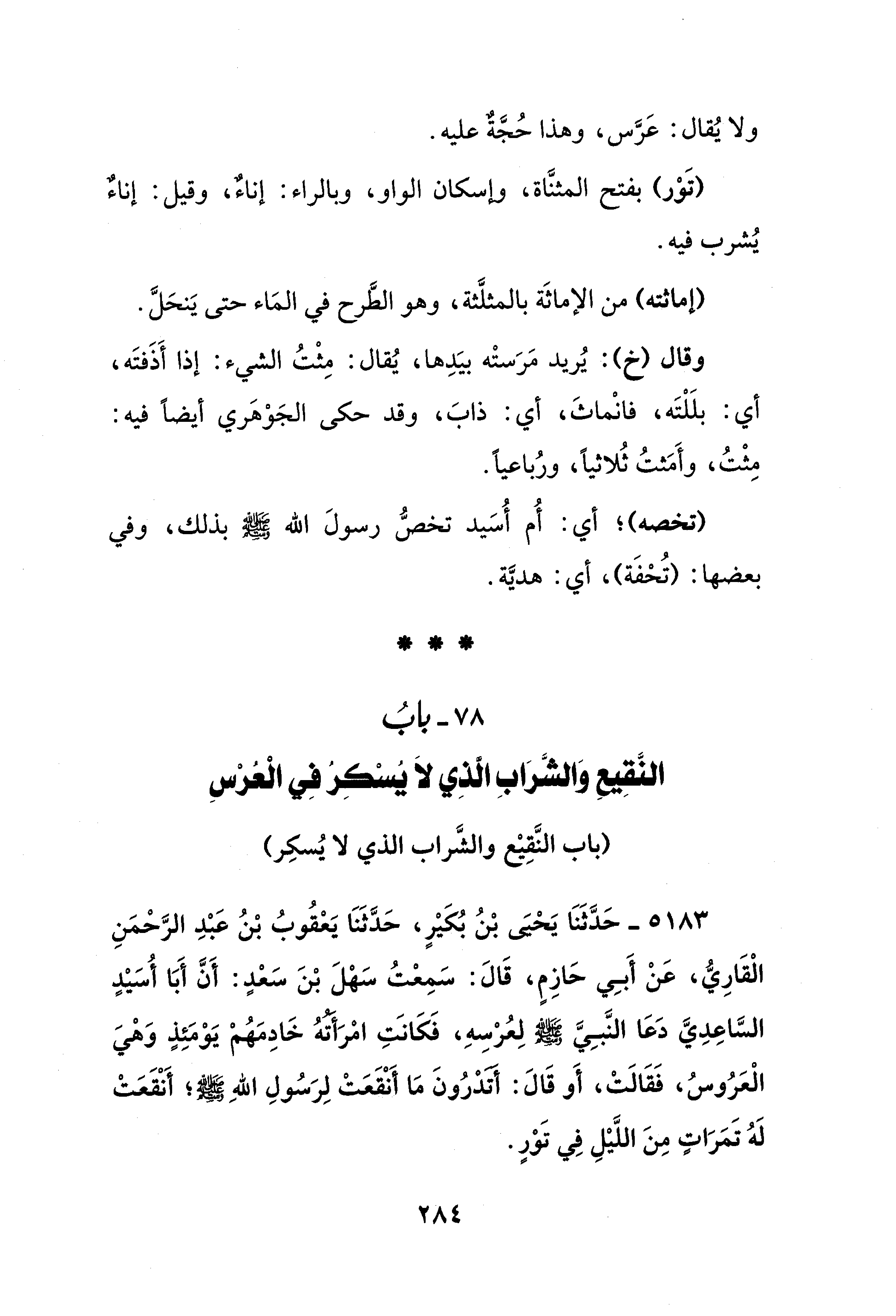 5183 - حَدَّثَنَا يَحْيَى بْنُ بُكَيْرٍ، حَدَّثَنَا يَعْقُوبُ بْنُ عَبْدِ الرَّحْمَنِ الْقَارِيُّ، عَنْ أَبِي حَازِمٍ، قَالَ: سَمِعْتُ سَهْلَ بْنَ سَعْدٍ: أَنَّ أَبَا أُسَيْدٍ السَّاعِدِيَّ دَعَا النَّبِيَّ - صلى الله عليه وسلم - لِعُرْسِهِ، فَكَانَتِ امْرَأتهُ خَادِمَهُمْ يَوْمَئِذٍ وَهْيَ الْعَرُوسُ، فَقَالَتْ، أَو قَالَ: أتدْرُونَ مَا أَنْقَعَتْ لِرَسُولِ اللهِ - صلى الله عليه وسلم -؛ أَنْقَعَتْ لَهُ تَمَرَاتٍ مِنَ اللَّيْلِ فِي تَوْرٍ.
