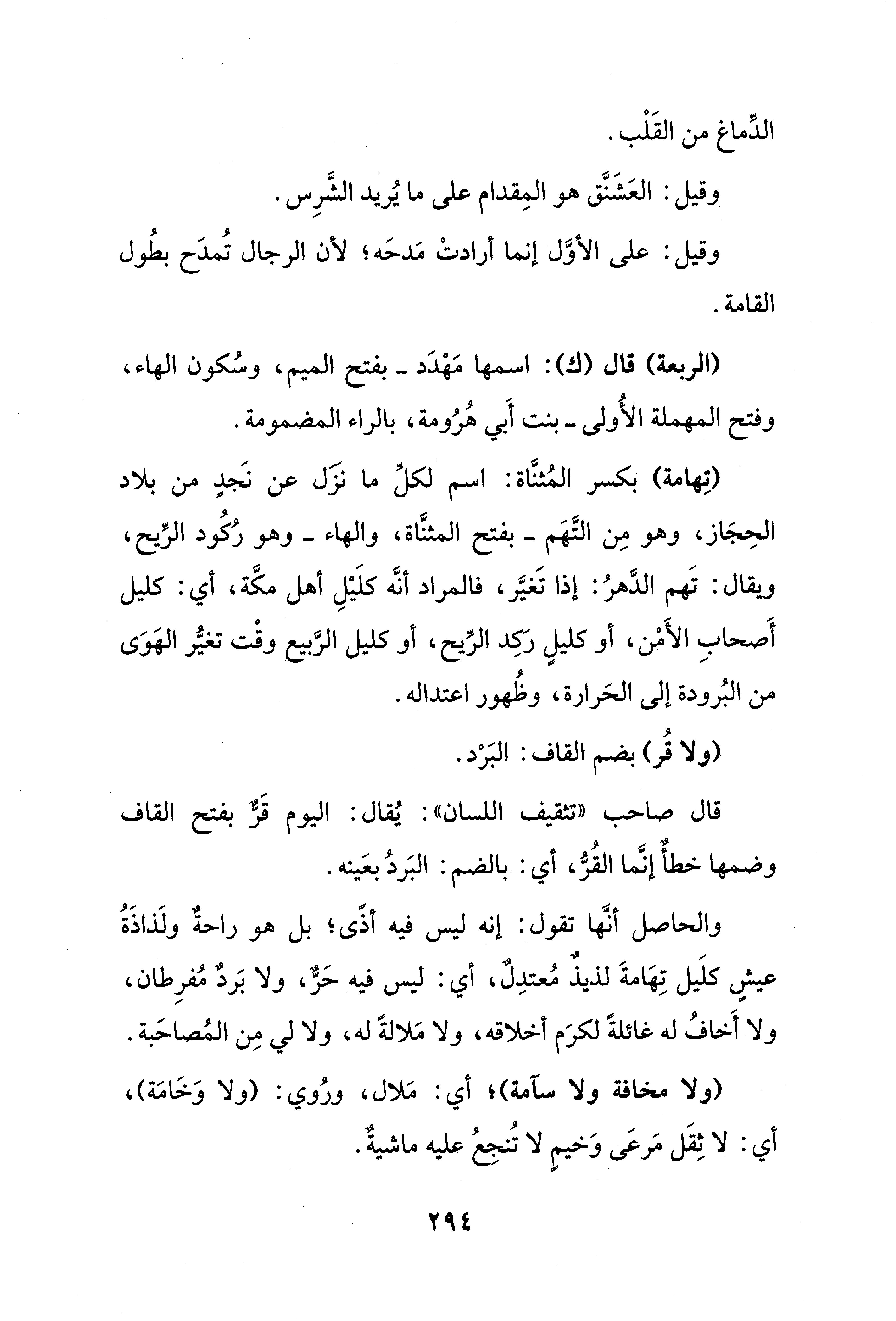 والحاصل أنَّها تقول: إنه ليس فيه أذًى؛ بل هو راحةٌ ولَذاذَةُ عيشٍ كلَيل تِهَامةَ لذيذٌ مُعتدِلٌ، أي: ليس فيه حَرٌّ، ولا بَردٌ مُفرِطان، ولا أَخافُ له غائلةً لكرَم أخلاقه، ولا مَلالةً له، ولا في مِن المُصاحَبة.
