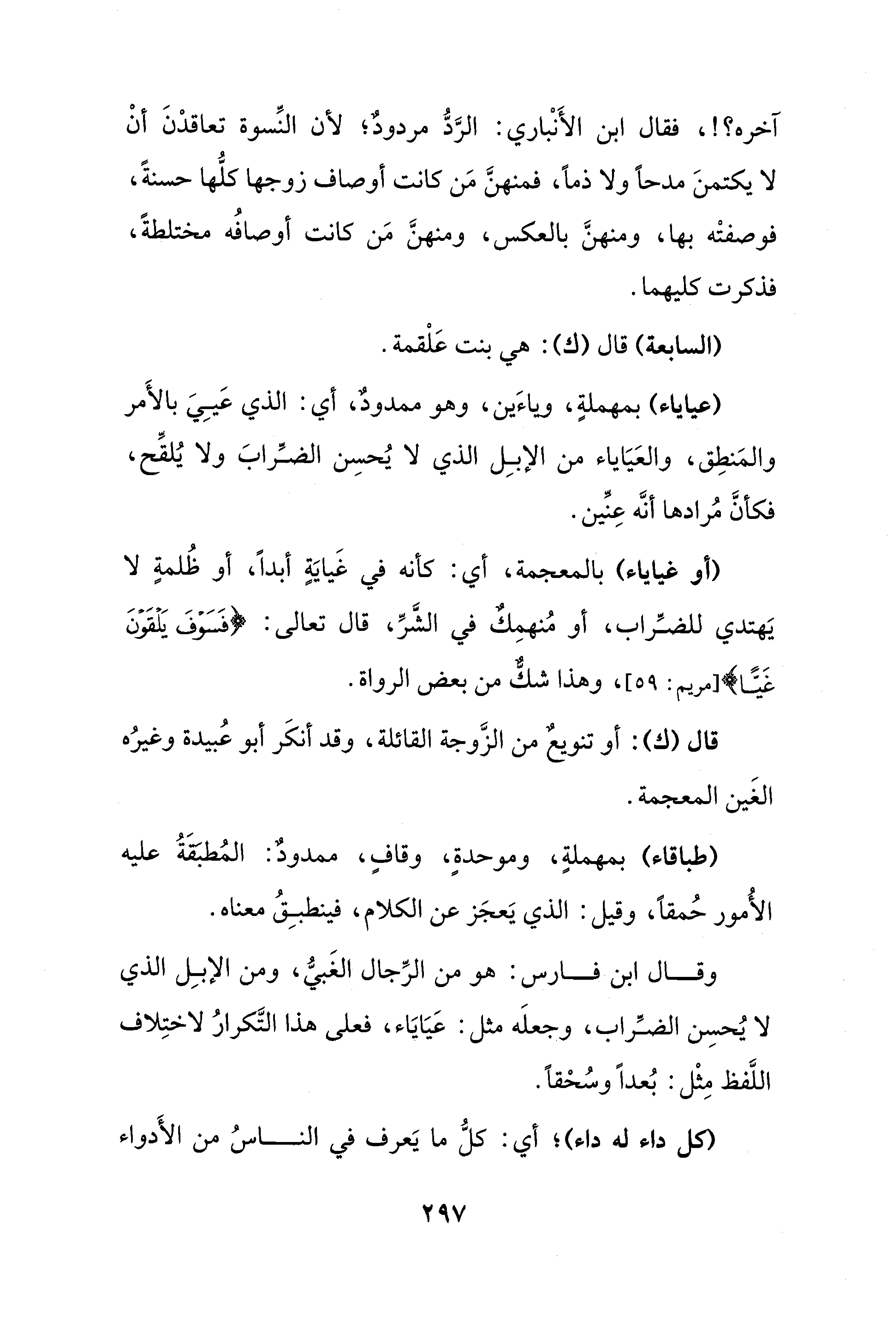 وقال ابن فارس: هو من الرِّجال الغَبيُّ، ومن الإبِل الذي لا يُحسِن الضِّراب، وجعلَه مثل: عَيَايَاء، فعلى هذا التَّكرارُ لاختِلاف اللَّفظ مِثْل: بُعدًا وسُحْقًا.