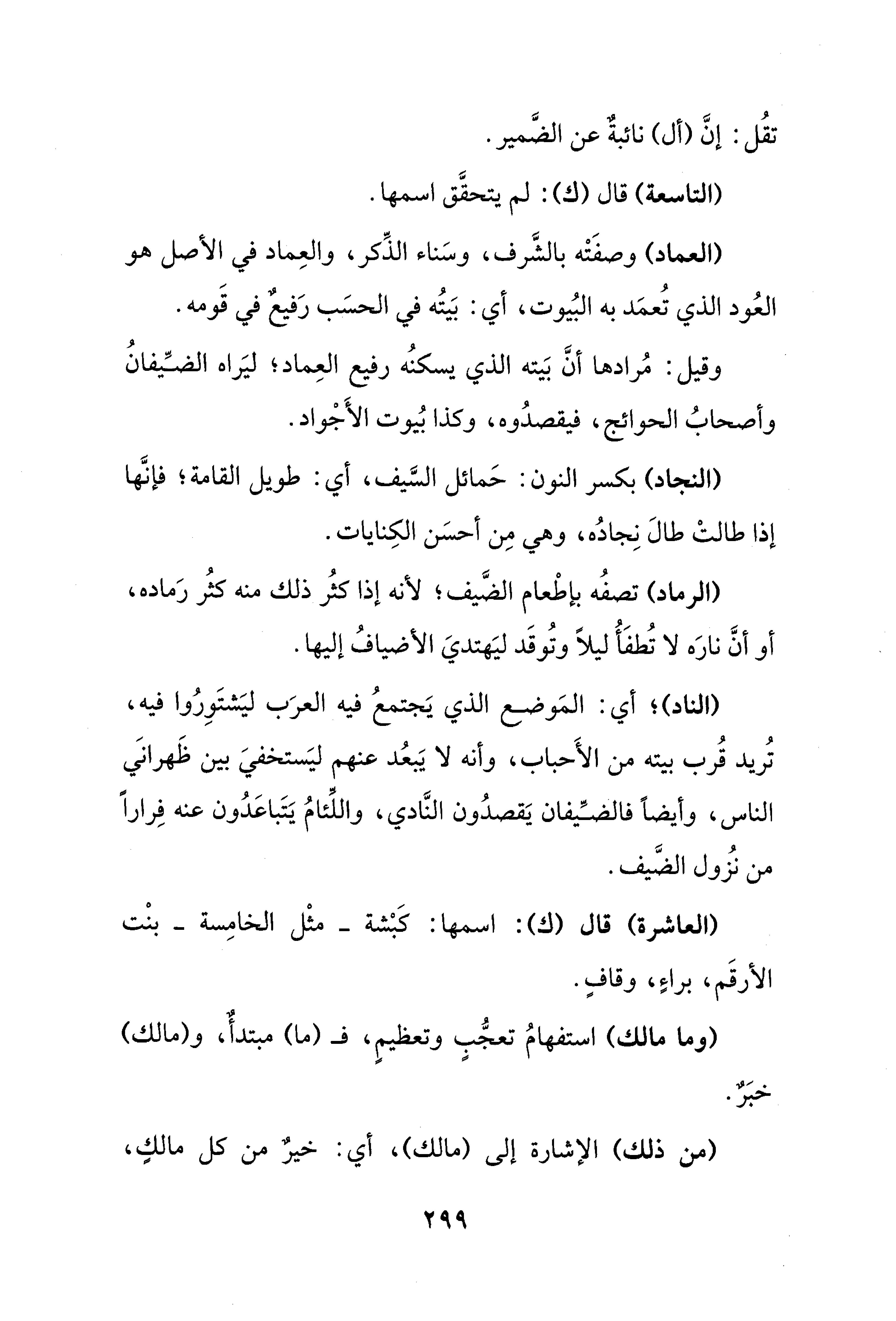 وقيل: مُرادها أنَّ بَيته الذي يسكنُه رفيع العِماد؛ ليَراه الضِّيفانُ وأصحابُ الحوائج، فيقصدُوه، وكذا بُيوت الأَجْواد.