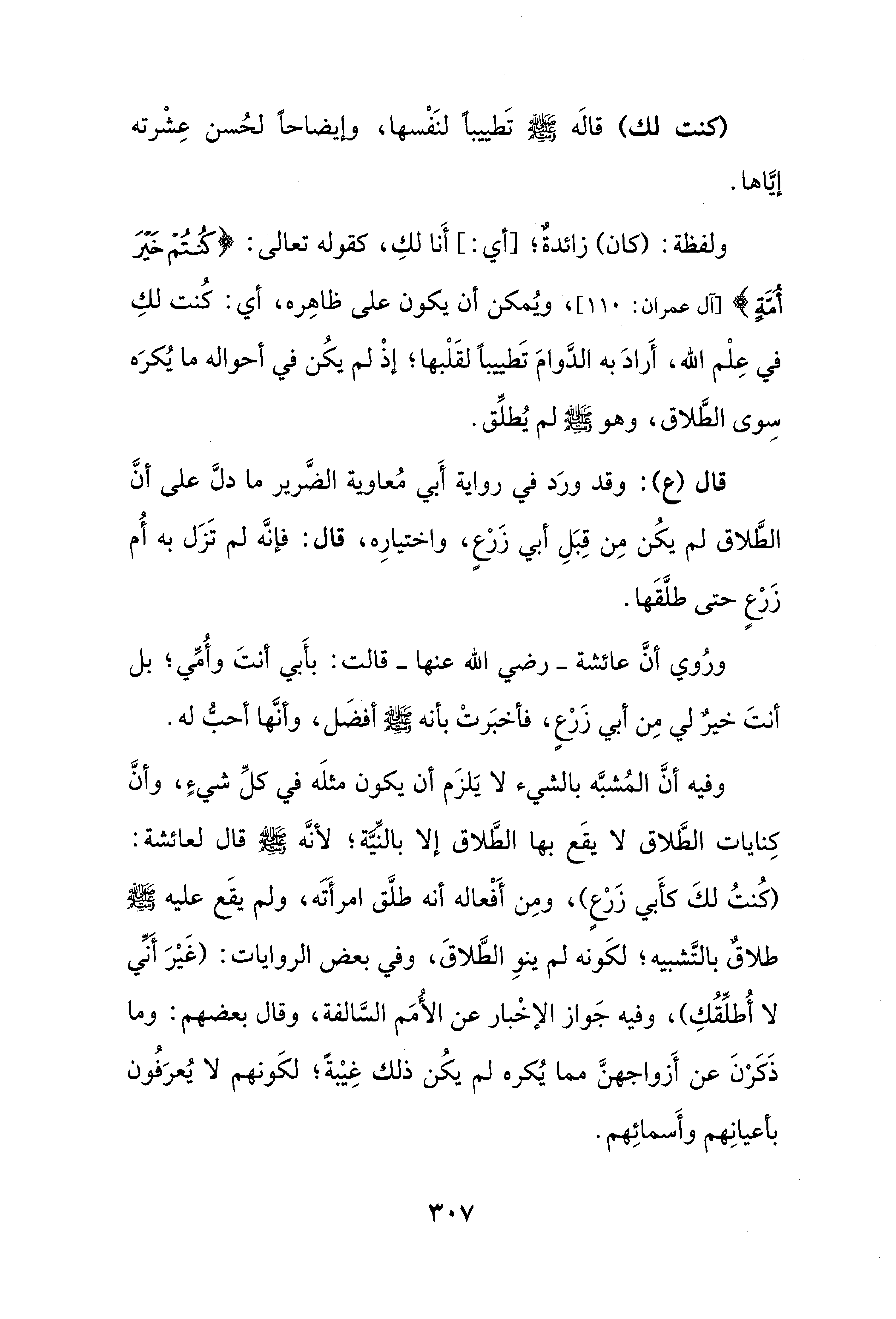 وفيه أنَّ المُشبَّه بالشيء لا يَلزَم أن يكون مثلَه في كل شيءٍ، وأنَّ كِنايات الطَّلاق لا يقَع بها الطَّلاق إلا بالنِّيَّة؛ لأنَّه - صلى الله عليه وسلم - قال لعائشة: (كُنتُ لكَ كأَبي زَرْعٍ)، ومِن أَفْعاله أنه طلَّق امرأَتَه، ولم يقَع عليه - صلى الله عليه وسلم - طلاقٌ بالتَّشبيه؛ لكَونه لم ينوِ الطَّلاقَ، وفي بعض الروايات: (غَيْرَ أنِّي لا أُطلِّقُكِ)، وفيه جَواز الإخْبار عن الأُمَم السَّالفة، وقال بعضهم: وما ذَكَرْنَ عن أَزواجهنَّ مما يُكره لم يكُن ذلك غِيْبةً؛ لكَونهم لا يُعرَفُون بأعيانِهم وأَسمائِهم.