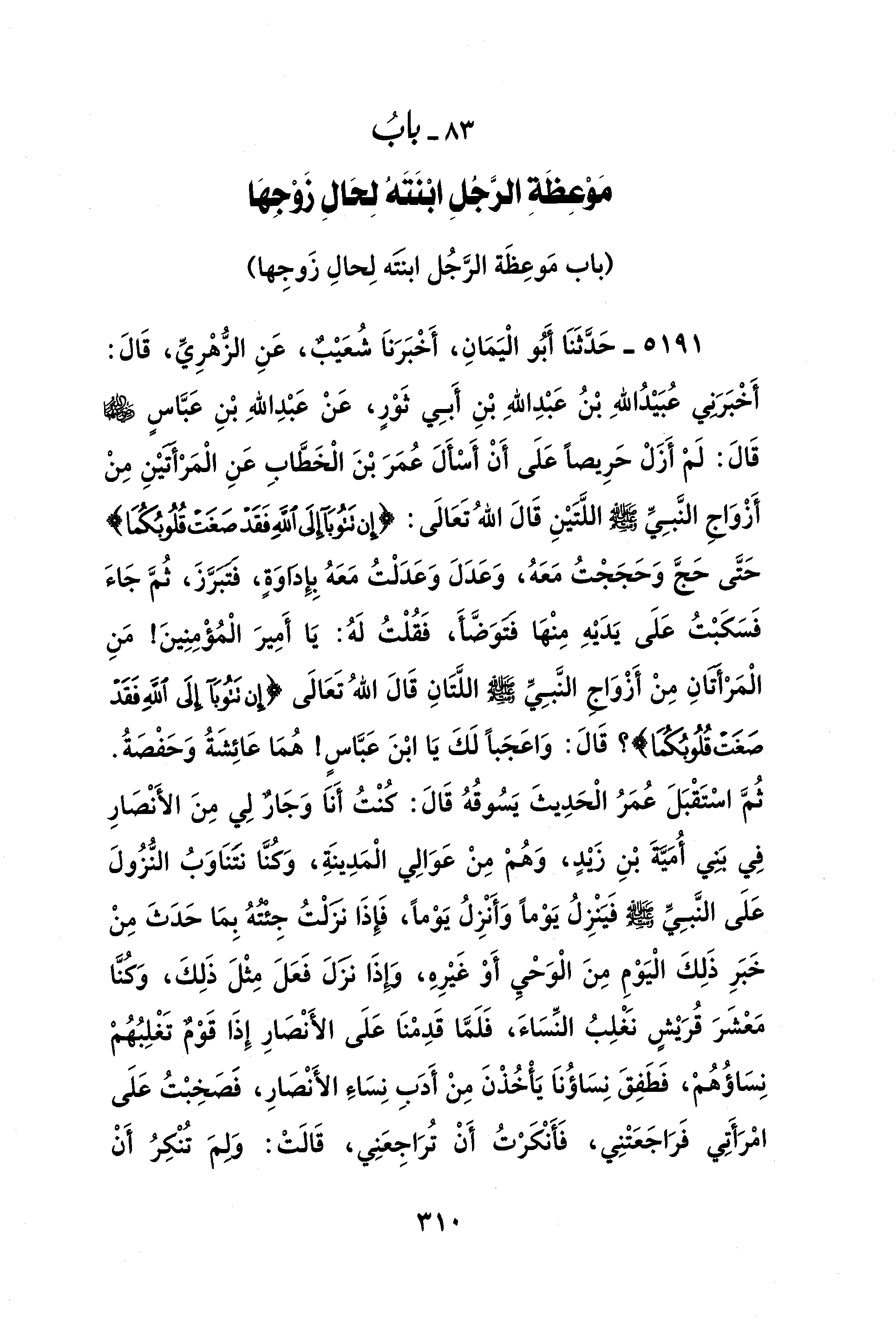 5191 - حَدَّثَنَا أَبُو الْيَمَانِ، أَخْبَرَنَا شُعَيْبٌ، عَنِ الزُّهْرِيِّ، قَالَ: أَخْبَرَنِي عُبَيْدُ اللهِ بْنُ عَبْدِ اللهِ بْنِ أَبِي ثَوْرٍ، عَنْ عَبْدِ اللهِ بْنِ عَبَّاسٍ - رضي الله عنهما - قَالَ: لَمْ أَزَلْ حَرِيصًا عَلَى أَنْ أَسْاَلَ عُمَرَ بْنَ الْخَطَّابِ عَنِ الْمَرْأتيْنِ مِنْ أَزْوَاجِ النَّبِيِّ - صلى الله عليه وسلم - اللَّتَيْنِ قَالَ اللهُ تَعَالَى: {إِنْ تَتُوبَا إِلَى اللَّهِ فَقَدْ صَغَتْ قُلُوبُكُمَا} حَتَّى حَجَّ وَحَجَجْتُ مَعَهُ، وَعَدَلَ وَعَدَلْتُ مَعَهُ بِإِداوَةٍ، فتبَرَّزَ، ثُمَّ جَاءَ فَسَكَبْتُ عَلَى يَدَيْهِ مِنْهَا فتوَضَّأَ، فَقُلْتُ لَهُ: يَا أَمِيرَ الْمُؤْمِنِينَ! مَنِ الْمَرْأتانِ مِنْ أَزْوَاج النَّبِيِّ - صلى الله عليه وسلم - اللَّتَانِ قَالَ اللهُ تَعَالَى {إِنْ تَتُوبَا إِلَى اللَّهِ فَقَدْ صَغَتْ قُلُوبُكُمَا}؟ قَالَ: وَاعَجَبًا لَكَ يَا ابْنَ عَبَّاسٍ! هُمَا عَائِشَةُ وَحَفْصَةُ. ثُمَّ اسْتَقْبَلَ عُمَرُ الْحَدِيثَ يَسُوقُهُ قَالَ: كنْتُ أَنَا وَجَارٌ لِي مِنَ الأَنْصَارِ فِي بَنِي أُمَيَّةَ بْنِ زيدٍ، وَهُمْ مِنْ عَوَالِي الْمَدِينَةِ، وَكُنَّا نتَنَاوَبُ النُّزُولَ عَلَى النَّبِيِّ - صلى الله عليه وسلم - فَيَنْزِلُ يَوْمًا وَأَنْزِلُ يَوْمًا، فَإِذَا نزلْتُ جِئْتُهُ بِمَا حَدَثَ مِنْ خَبَرِ ذَلِكَ الْيَوْمِ مِنَ الْوَحْيِ أَوْ غَيْرِهِ، وَإِذَا نزَلَ فَعَلَ مِثْلَ ذَلِكَ، وَكنَّا مَعْشَرَ قُرَيْش نَغْلِبُ النِّسَاءَ، فَلَمَّا قَدِمْنَا عَلَى الأَنْصَارِ إِذَا قَوْمٌ تَغْلِبُهُمْ نِسَاؤُهُمْ، فَطَفِقَ نِسَاؤُنَا يَأخُذْنَ مِنْ أَدَبِ نِسَاءِ الأَنْصَارِ، فَصَخِبْتُ عَلَى امْرَأَتِي فَرَاجَعَتْنِي، فَأنْكَرْتُ أَنْ تُرَاجِعَنِي، قَالَتْ: وَلمَ تُنْكِرُ أَنْ