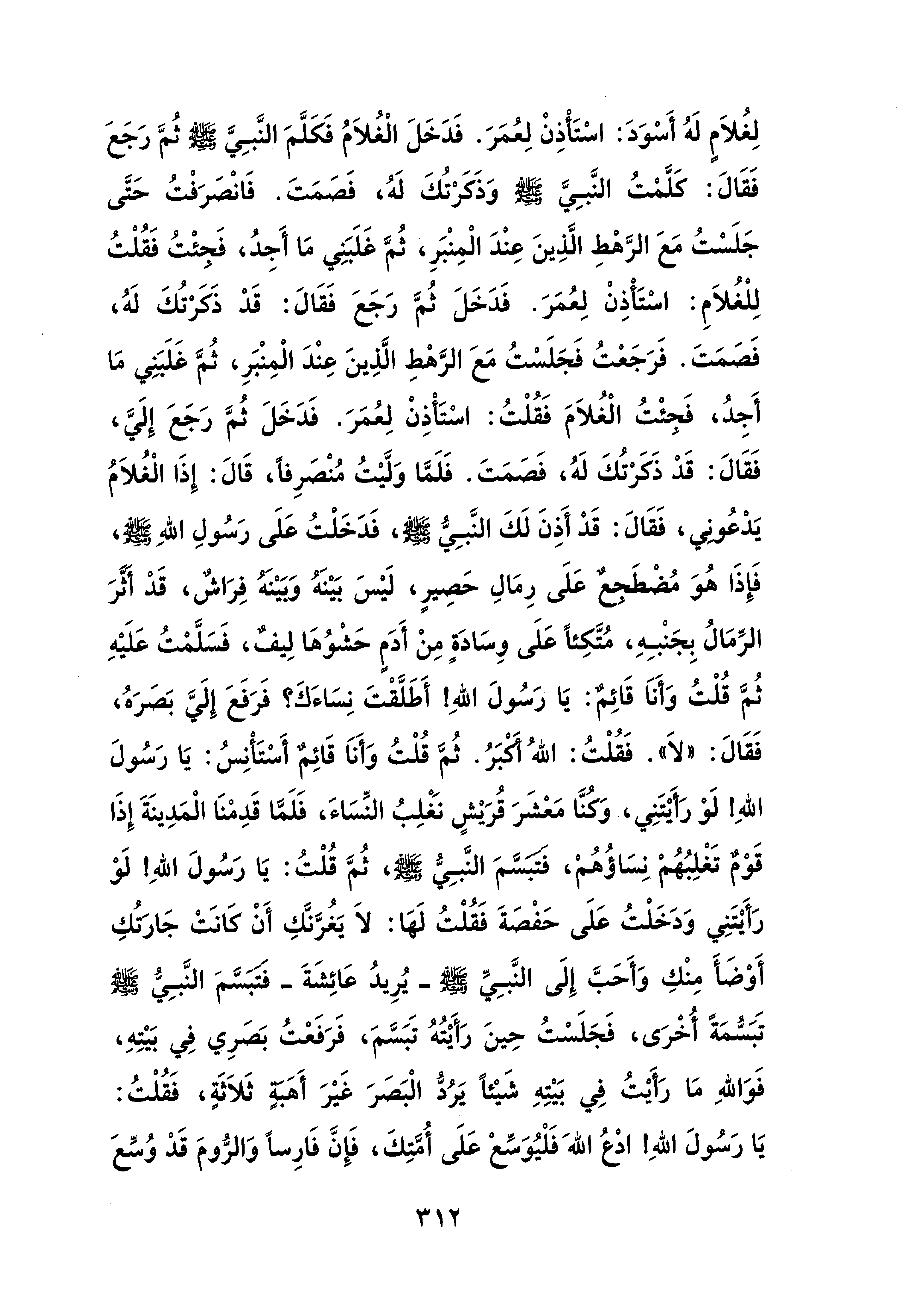 لِغُلاَمٍ لَهُ أَسْوَدَ: اسْتَأذِنْ لِعُمَرَ. فَدَخَلَ الْغُلاَمُ فَكَلَّمَ النَّبِيَّ - صلى الله عليه وسلم - ثُمَّ رَجَعَ فَقَالَ: كَلَّمْتُ النَّبِيَّ - صلى الله عليه وسلم - وَذَكَرْتُكَ لَهُ، فَصَمَتَ. فَانْصَرَفْتُ حَتَّى جَلَسْتُ مَعَ الرَّهْطِ الَّذِينَ عِنْدَ الْمِنْبَرِ، ثُمَّ غَلَبَنِي مَا أَجِدُ، فَجئْتُ فَقُلْتُ لِلْغُلاَمِ: اسْتَأذِنْ لِعُمَرَ. فَدَخَلَ ثُمَّ رَجَعَ فَقَالَ: قَدْ ذَكَرْتُكَ لَهُ، فَصَمَتَ. فَرَجَعْتُ فَجَلَسْتُ مَعَ الرَّهْطِ الَّدِينَ عِنْدَ الْمِنْبَرِ، ثُمَّ غَلَبَنِي مَا أَجِدُ، فَجئْتُ الْغُلاَمَ فَقُلْتُ: اسْتَأذِنْ لِعُمَرَ. فَدَخَلَ ثُمَّ رَجَعَ إِلَيَّ، فَقَالَ: قَدْ ذَكَرْتُكَ لَهُ، فَصَمَتَ. فَلَمَّا وَلَّيْتُ مُنْصَرِفًا، قَالَ: إِذَا الْغُلاَمُ يَدْعُوني، فَقَالَ: قَدْ أَذِنَ لَكَ النَّبِيُّ - صلى الله عليه وسلم -، فَدَخَلْتُ عَلَى رَسُولِ اللهِ - صلى الله عليه وسلم -، فَإِذَا هُوَ مُضْطَجعٌ عَلَى رِمَالِ حَصِيرٍ، لَيْسَ بَيْنَهُ وَبَيْنَهُ فِرَاشٌ، قَدْ أَثَّرَ الرِّمَالُ بِجَنْبِهِ، مُتَّكِئًا عَلَى وِسَادَةٍ مِنْ أَدَمٍ حَشْوُهَا لِيفٌ، فَسَلَّمْتُ عَلَيْهِ ثُمَّ قُلْتُ وَأَنَا قَائِمٌ: يَا رَسُولَ اللهِ! أَطَلَّقْتَ نِسَاءَكَ؟ فَرَفَعَ إِلَيَّ بَصَرَهُ، فَقَالَ: "لَا". فَقُلْتُ: اللهُ أكبَرُ. ثُمَّ قُلْتُ وَأَنَا قَائِمٌ أَسْتَأْنِسُ: يَا رَسُولَ اللهِ! لَوْ رَأَيْتَنِي، وَكُنَّا مَعْشَرَ قُرَيْشٍ نَغْلِبُ النِّسَاءَ، فَلَمَّا قَدِمْنَا الْمَدِينَةَ إِذَا قَوْمٌ تَغْلِبُهُمْ نِسَاؤُهُمْ، فتبَسَّمَ النَّبِيُّ - صلى الله عليه وسلم -، ثُمَّ قُلْتُ: يَا رَسُولَ اللهِ! لَوْ رَأَيْتَنِي وَدَخَلْتُ عَلَى حَفْصَةَ فَقُلْتُ لَهَا: لَا يَغُرَّنَّكِ أَنْ كَانَتْ جَارتكِ أَوْضَأ مِنْكِ وَأَحَبَّ إِلَى النَّبِيِّ - صلى الله عليه وسلم - -يُرِيدُ عَائِشَةَ- فتبَسَّمَ النَّبِيُّ - صلى الله عليه وسلم - تَبَسُّمَةً أخرَى، فَجَلَسْتُ حِينَ رَأَيْتُهُ تَبَسَّمَ، فَرَفَعْتُ بَصَرِي فِي بَيْتِهِ، فَوَاللهِ مَا رَأَيْتُ فِي بَيْتِهِ شَيْئًا يَرُدُّ الْبَصَرَ غَيْرَ أَهَبَةٍ ثَلاَثَةٍ، فَقُلْتُ: يَا رَسُولَ اللهِ! ادْعُ اللهَ فَلْيُوَسِّعْ عَلَى أمُّتِكَ، فإِنَّ فَارِسًا وَالرُّومَ قَدْ وُسِّعَ