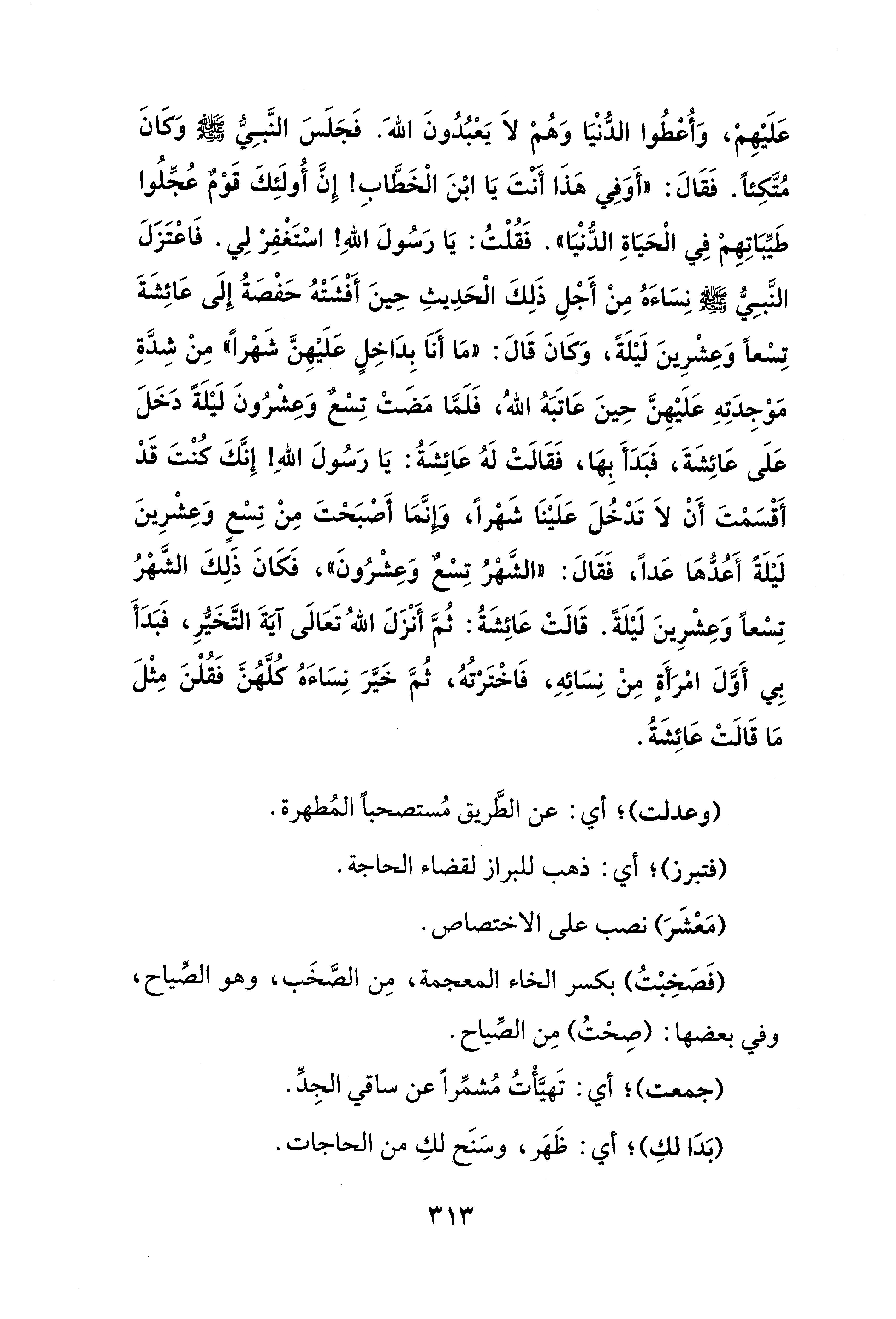 عَلَيْهِمْ، وَأُعْطُوا الدُّنْيَا وَهُمْ لَا يَعْبُدُونَ اللهَ. فَجَلَسَ النَّبِيُّ - صلى الله عليه وسلم - وَكانَ مُتَّكِئًا. فَقَالَ: "أَوَفِي هَذَا أَنْتَ يَا ابْنَ الْخَطَّابِ! إِنَّ أُولَئِكَ قَوْمٌ عُجِّلُوا طَيِّبَاتِهِمْ فِي الْحَيَاةِ الدُّنْيَا". فَقُلْتُ: يَا رَسُولَ اللهِ! اسْتَغْفِرْ لِي. فَاعْتَزَلَ النَّبِيُّ - صلى الله عليه وسلم - نِسَاءَهُ مِنْ أَجْلِ ذَلِكَ الْحَدِيثِ حِينَ أَفْشَتْهُ حَفْصَةُ إِلَى عَائِشَةَ تِسْعًا وَعِشْرِينَ لَيْلَةً، وَكَانَ قَالَ: "مَا أَنَا بِدَاخِلٍ عَلَيْهِنَّ شَهْرًا" مِنْ شِدَّةِ مَوْجِدَتِهِ عَلَيْهِنَّ حِينَ عَاتَبَهُ الله، فَلَمَّا مَضَتْ تِسْعٌ وَعِشْرُونَ لَيْلَةً دَخَلَ عَلَى عَائِشَةَ، فَبَدَأَ بِهَا، فَقَالَتْ لَهُ عَائِشَةُ: يَا رَسُولَ اللهِ! إنَّكَ كُنْتَ قَدْ أَقْسَمْتَ أَنْ لَا تَدْخُلَ عَلَيْنَا شَهْرًا، وَإِنَّمَا أَصْبَحْتَ مِنْ تِسْعٍ وَعِشْرِينَ لَيْلَةً أَعُدُّهَا عَدًا، فَقَالَ: "الشَّهْرُ تِسْعٌ وَعِشْرُونَ"، فَكَانَ ذَلِكَ الشَّهْرُ تِسْعًا وَعِشْرِينَ لَيْلَةً. قَالَتْ عَائِشَةُ: ثُمَّ أَنْزَلَ اللهُ تَعَالَى آيَةَ التَّخَيُّرِ، فَبَدَأَ بِي أَوَّلَ امْرَأَةٍ مِنْ نِسَائِهِ، فَاخْتَرْتُهُ، ثُمَّ خَيَّرَ نِسَاءَهُ كلَّهُنَّ فَقُلْنَ مِثْلَ مَا قَالَتْ عَائِشَةُ.