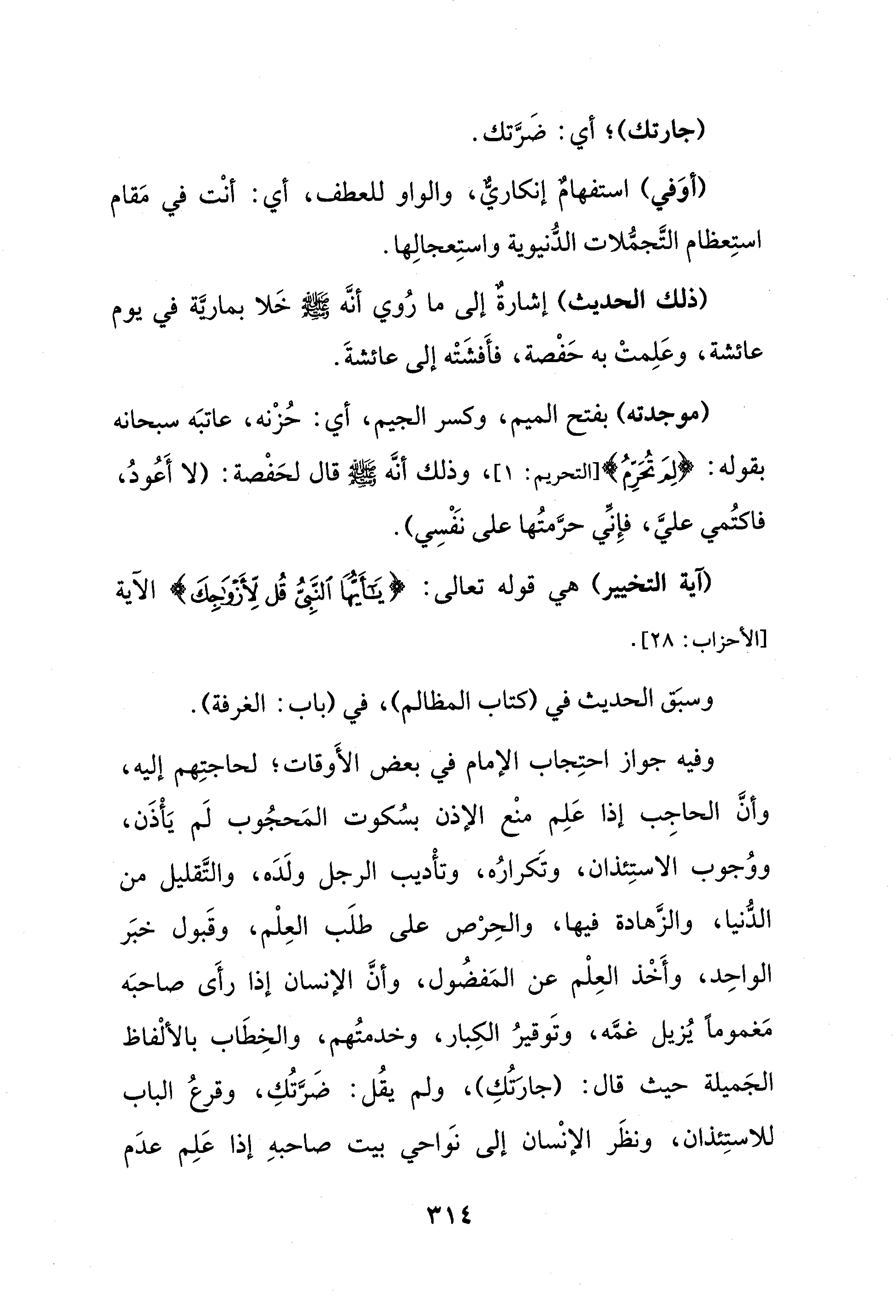 وفيه جواز احتِجاب الإمام في بعض الأَوقات؛ لحاجتِهم إليه، وأنَّ الحاجِب إذا عَلِم منْع الإذن بسُكوت المَحجُوب لَم يَأْذَن، ووُجوب الاستِئذان، وتَكرارُه، وتأْديب الرجل ولَدَه، والتَّقليل من الدُّنيا، والزَّهادة فيها، والحِرْص على طلَب العِلْم، وقَبول خبَر الواحِد، وأَخْذ العِلْم عن المَفضُول، وأنَّ الإنسان إذا رأَى صاحبَه مَغمومًا يُزيل غمَّه، وتَوقيرُ الكِبار، وخدمتُهم، والخِطَاب بالألْفاظ الجَميلة حيث قال: (جارتكِ)، ولم يقُل: ضَرَّتُكِ، وقرعُ الباب للاستِئذان، ونظَر الإنْسان إلى نَواحي بيت صاحبهِ إذا عَلِم عدَم