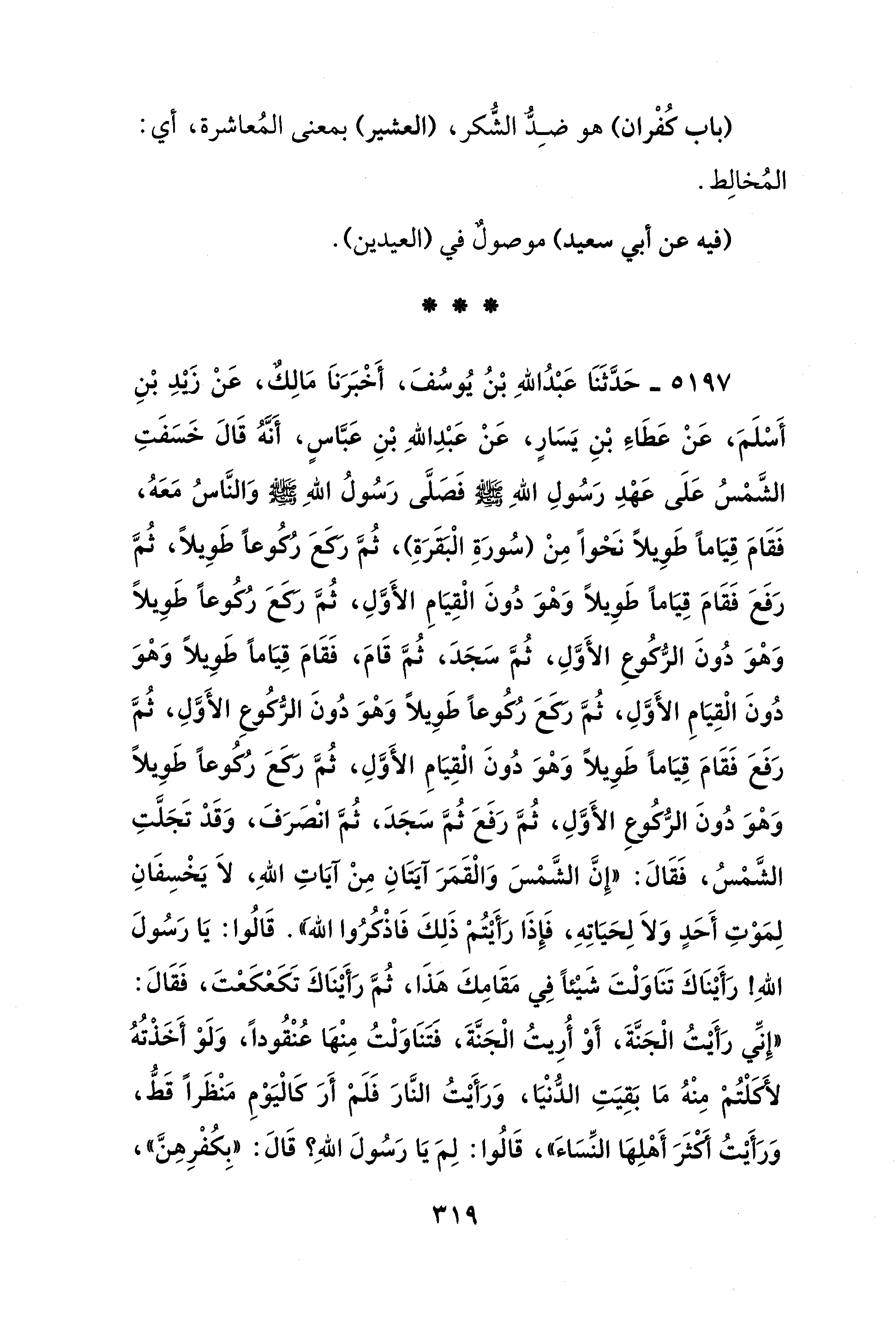 5197 - حَدَّثَنَا عَبْدُ اللهِ بْنُ يُوسُفَ، أَخْبَرَنَا مَالِكٌ، عَنْ زيدِ بْنِ أَسْلَمَ، عَنْ عَطَاءِ بْنِ يَسَارٍ، عَنْ عَبْدِ اللهِ بْنِ عَبَّاسٍ، أَنَّهُ قَالَ خَسَفَتِ الشَّمْسُ عَلَى عَهْدِ رَسُولِ اللهِ - صلى الله عليه وسلم - فَصَلَّى رَسُولُ اللهِ - صلى الله عليه وسلم - وَالنَّاسُ مَعَهُ، فَقَامَ قِيَامًا طَوِيلًا نَحْوًا مِنْ (سُورَةِ الْبَقَرَةِ)، ثُمَّ رَكعَ رُكُوعًا طَوِيلًا، ثُمَّ رَفَعَ فَقَامَ قِيَامًا طَوِيلًا وَهْوَ دُونَ الْقِيَامِ الأَوَّلِ، ثُمَّ رَكعَ رُكُوعًا طَوِيلًا وَهْوَ دُونَ الرُّكُوعِ الأَوَّلِ، ثُمَّ سَجَدَ، ثُمَّ قَامَ، فَقَامَ قِيَامًا طَوِيلًا وَهْوَ دُونَ الْقِيَامِ الأَوَّلِ، ثُمَّ رَكعَ رُكُوعًا طَوِيلًا وَهْوَ دُونَ الرُّكُوعِ الأَوَّلِ، ثُمَّ رَفَعَ فَقَامَ قِيَامًا طَوِيلًا وَهْوَ دُونَ الْقِيَامِ الأَوَّلِ، ثُمَّ رَكعَ رُكُوعًا طَوِيلًا وَهْوَ دُونَ الرُّكُوعِ الأَوَّلِ، ثُمَّ رَفَعَ ثُمَّ سَجَدَ، ثُمَّ انْصَرَفَ، وَقَدْ تَجَلَّتِ الشَّمْسُ، فَقَالَ: "إِنَّ الشَّمْسَ وَالْقَمَرَ آيَتَانِ مِنْ آيَاتِ اللهِ، لَا يَخْسِفَانِ لِمَوْتِ أَحَدٍ وَلَا لِحَيَاتِهِ، فَإِذَا رَأَيْتُمْ ذَلِكَ فَاذْكُرُوا الله". قَالُوا: يَا رَسُولَ اللهِ! رَأَيْنَاكَ تناوَلْتَ شَيْئًا فِي مَقَامِكَ هَذَا، ثُمَّ رَأَيْنَاكَ تَكَعْكَعْتَ، فَقَالَ: "إِنِّي رَأَيْتُ الْجَنَّةَ، أَوْ أُرِيتُ الْجَنَّةَ، فتنَاوَلْتُ مِنْهَا عُنْقُودًا، وَلَوْ أَخَذْتُهُ لأكَلْتُمْ مِنْهُ مَا بَقِيَتِ الدُّنْيَا، وَرَأَيْتُ النَّارَ فَلَمْ أَرَ كَالْيَوْمِ مَنْظَرًا قَطُّ، وَرَأَيْتُ أَكثَرَ أَهْلِهَا النِّسَاءَ"، قَالُوا: لِمَ يَا رَسُولَ اللهِ؟ قَالَ: "بِكُفْرِهِنَّ"،