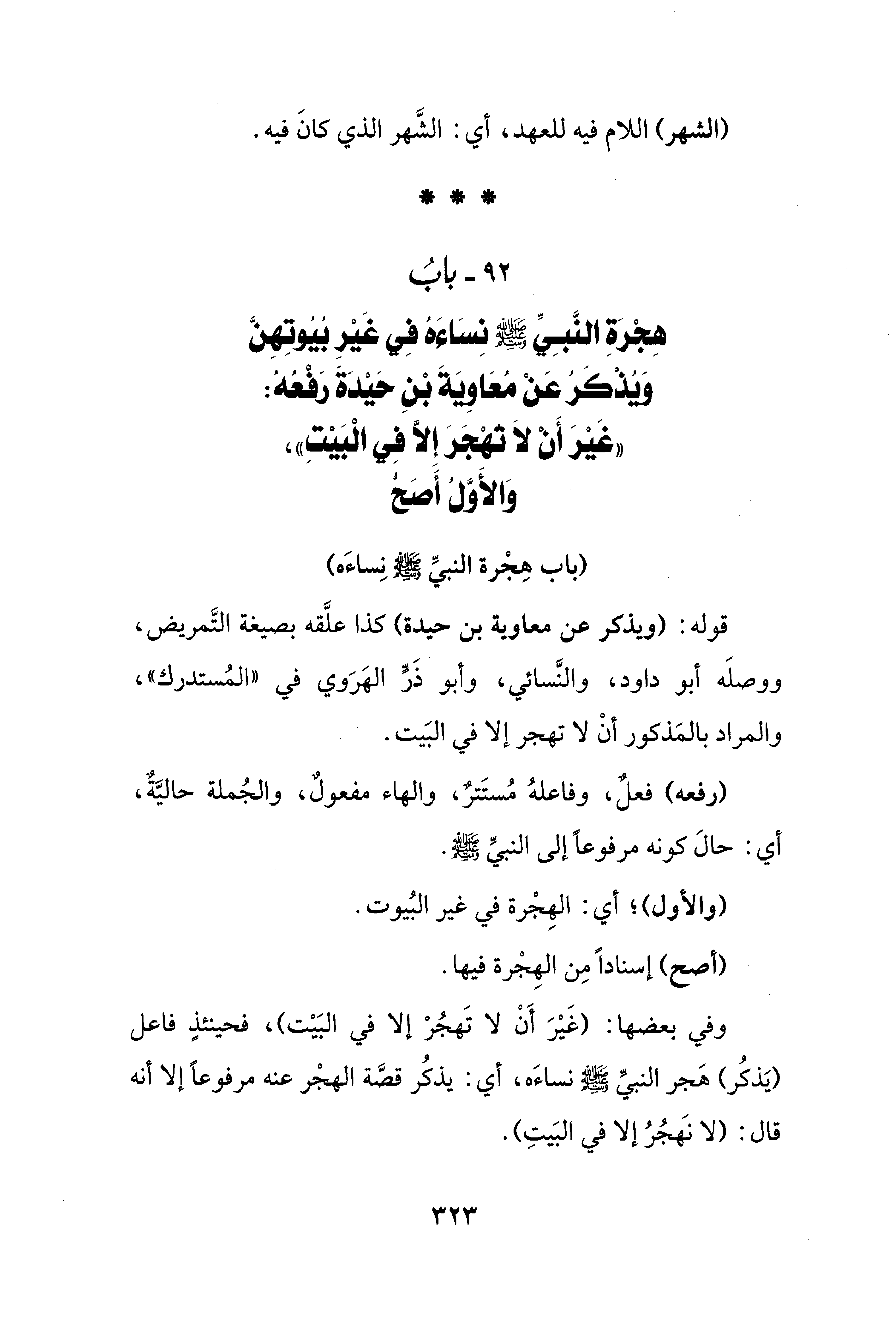 92 - بابُ هِجْرةِ النَّبِيِّ - صلى الله عليه وسلم - نِسَاءَهُ فِي غَيْرِ بُيُوتِهِنَّ وَيُذْكَرُ عَنْ مُعَاوَيَةَ بْنِ حَيْدَةَ رَفْعُهُ: "غَيْرَ أَنْ لاَ تهجَرَ إلا فِي الْبَيْتِ"، وَالأَوَّلُ أَصحُّ