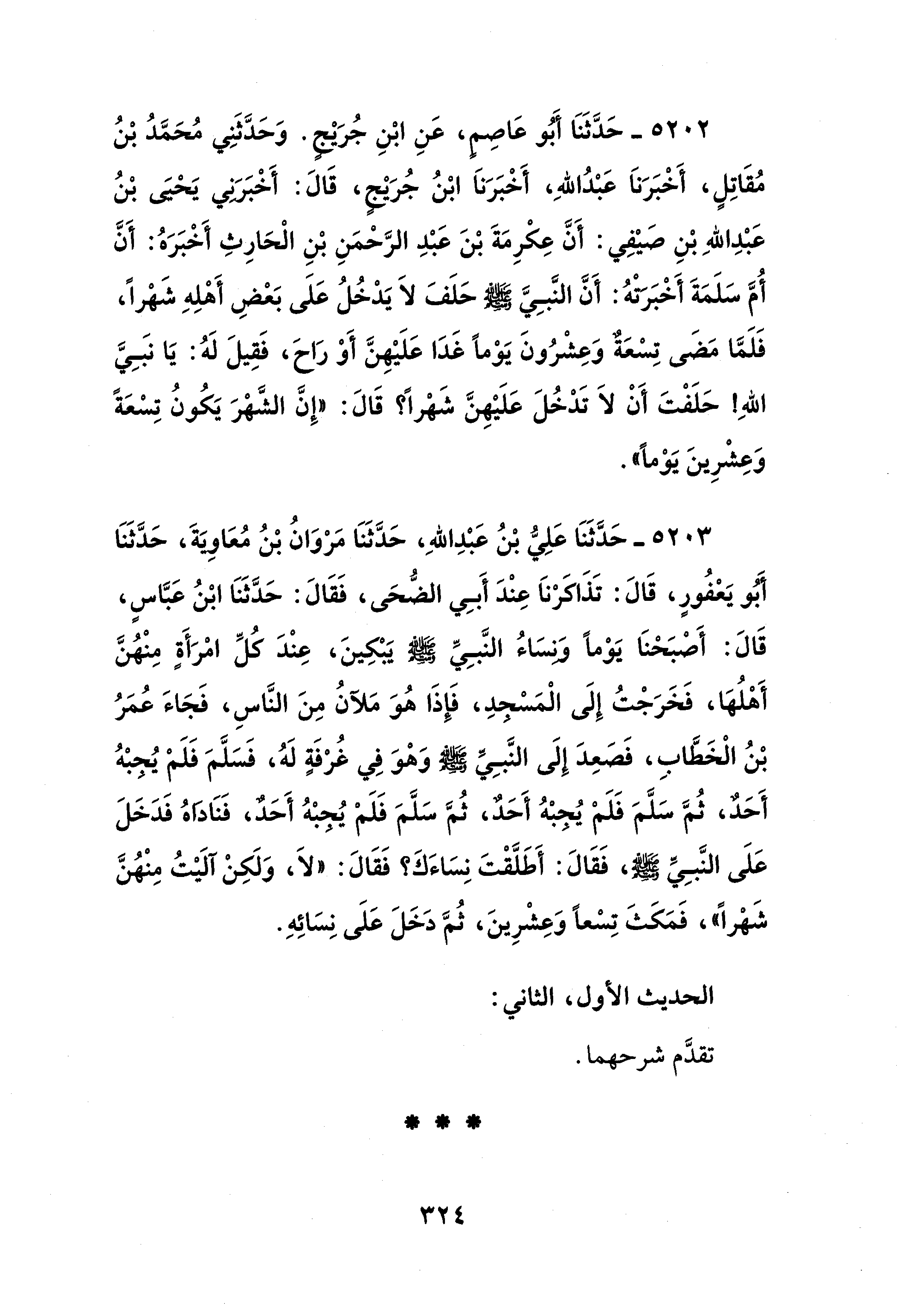 5203 - حَدَّثَنَا عَلِيُّ بْنُ عَبْدِ اللهِ، حَدَّثَنَا مَرْوَانُ بْنُ مُعَاوِيَةَ، حَدَّثَنَا أَبُو يَعْفُورٍ، قَالَ: تَذَاكَرْناَ عِنْدَ أَبِي الضُّحَى، فَقَالَ: حَدَّثَنَا ابْنُ عَبَّاسٍ، قَالَ: أَصْبَحْنَا يَوْمًا وَنسَاءُ النَّبِيِّ - صلى الله عليه وسلم - يَبْكِينَ، عِنْدَ كلِّ امْرَأَةٍ مِهُنَّ أَهْلُهَا، فَخَرَجْتُ إِلَى الْمَسْجدِ، فَإِذَا هُوَ مَلآنُ مِنَ النَّاسِ، فَجَاءَ عُمَرُ بْنُ الْخَطَّابِ، فَصَعِدَ إِلَى النَّبِيِّ - صلى الله عليه وسلم - وَهْوَ فِي غُرْفَةٍ لَهُ، فَسَلَّمَ فَلَمْ يُجبْهُ أَحَدٌ، ثُمَّ سَلَّمَ فَلَمْ يُجبْهُ أَحَدٌ، ثُمَّ سَلَّمَ فَلَمْ يُجبْهُ أَحَدٌ، فَنَاداهُ فَدَخَلَ عَلَى النَّبِيِّ - صلى الله عليه وسلم -، فَقَالَ: أَطَلَّقْتَ نِسَاءَكَ؟ فَقَالَ: "لَا، وَلَكِنْ آلَيْتُ مِنْهُنَّ شَهْرًا"، فَمَكَثَ تِسْعًا وَعِشْرِينَ، ثُمَّ دَخَلَ عَلَى نِسَائِهِ.