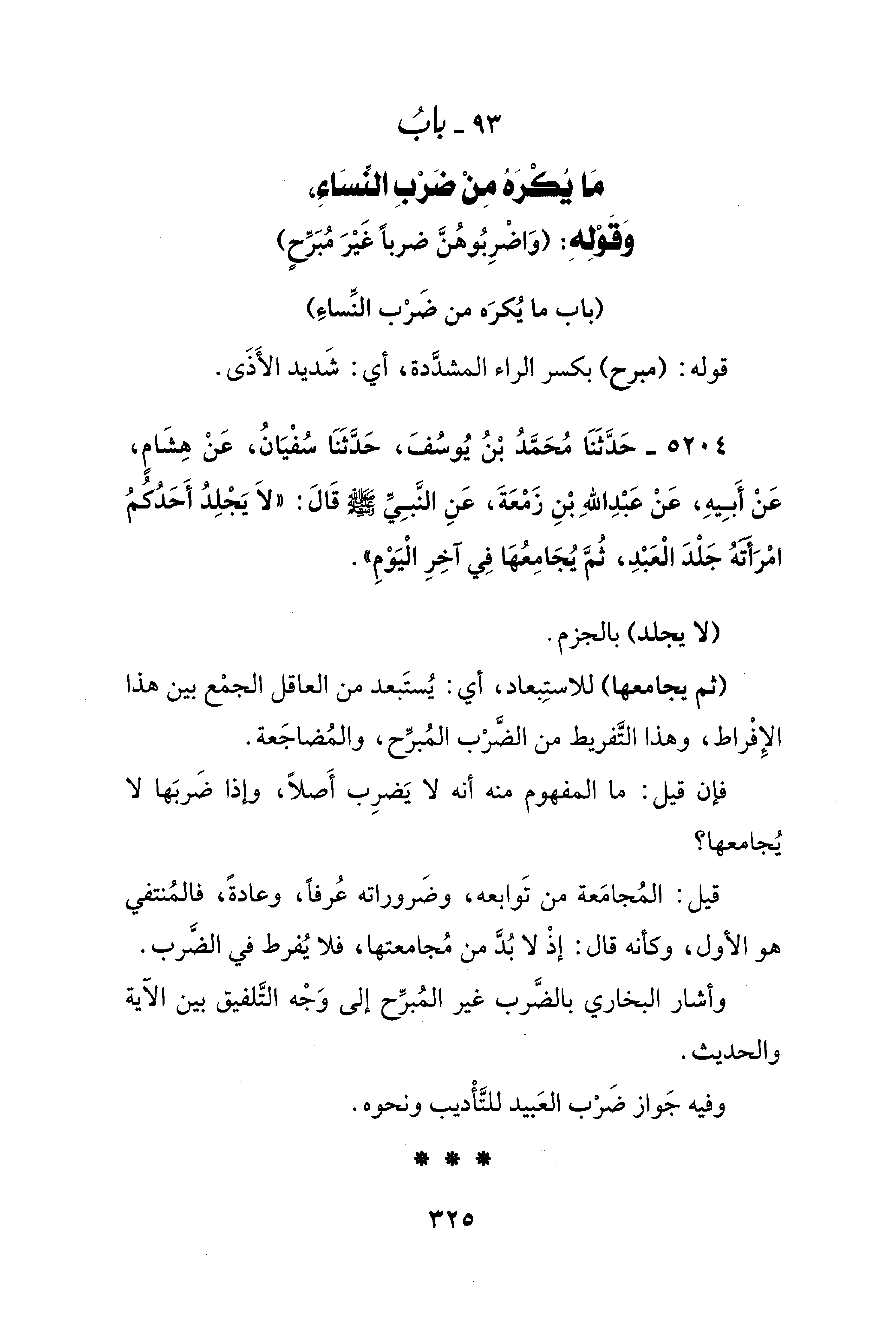 5204 - حَدَّثَنَا مُحَمَّدُ بْنُ يُوسُفَ، حَدَّثَنَا سُفْيَانُ، عَنْ هِشَامٍ، عَنْ أَبِيهِ، عَنْ عَبْدِ اللهِ بْنِ زَمْعَةَ، عَنِ النَّبِيِّ - صلى الله عليه وسلم - قَالَ: "لَا يَجْلِدُ أَحَدُكُمُ امْرَأتهُ جَلْدَ الْعَبْدِ، ثُمَّ يُجَامِعُهَا فِي آخِرِ الْيَوْمِ".
