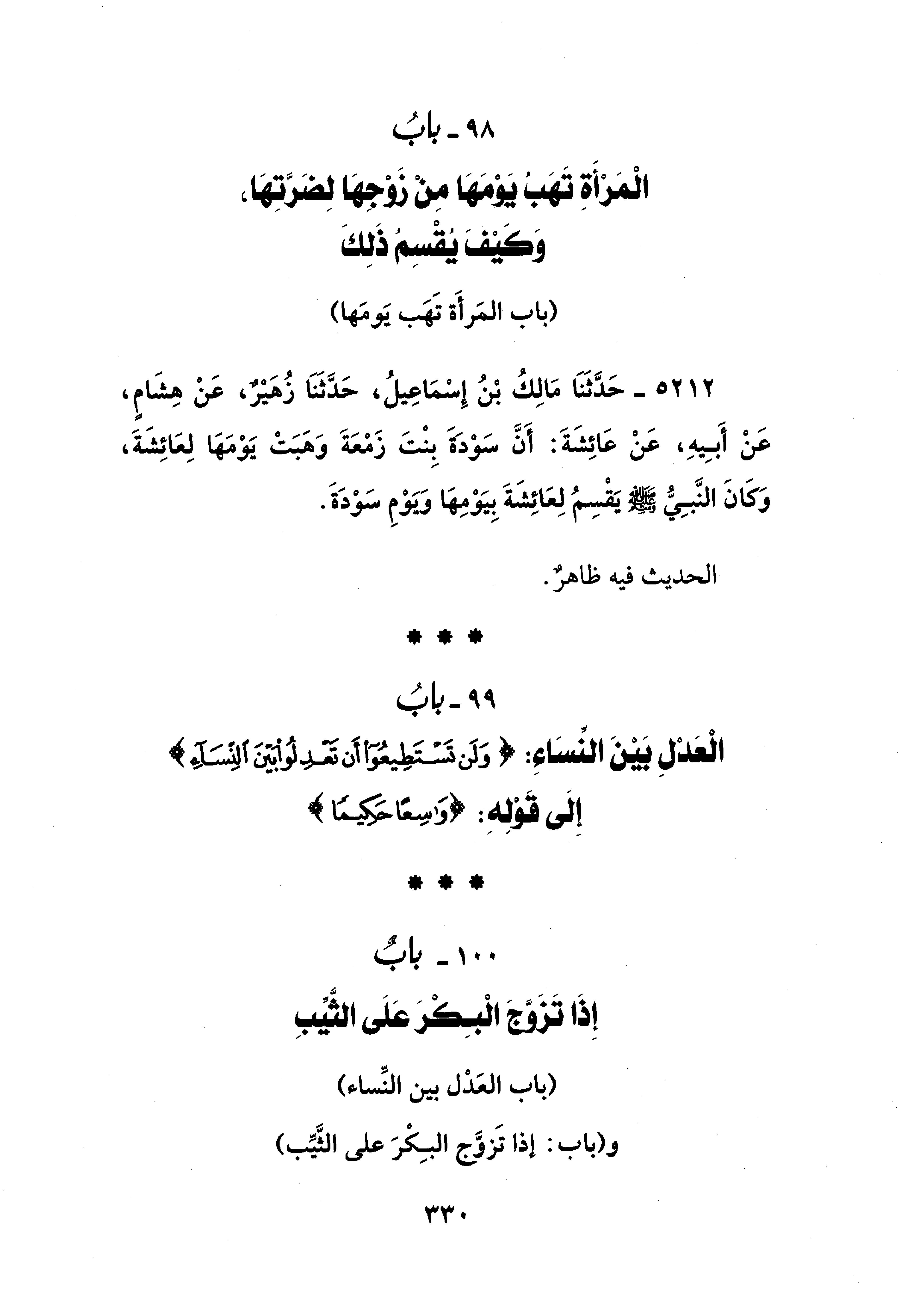99 - بابُ العدل بين النساء: {وَلَنْ تَسْتَطِيعُوا أَنْ تَعْدِلُوا بَيْنَ النِّسَاءِ} إِلَى قَوْلِهِ: {وَاسِعًا حَكِيمًا}
