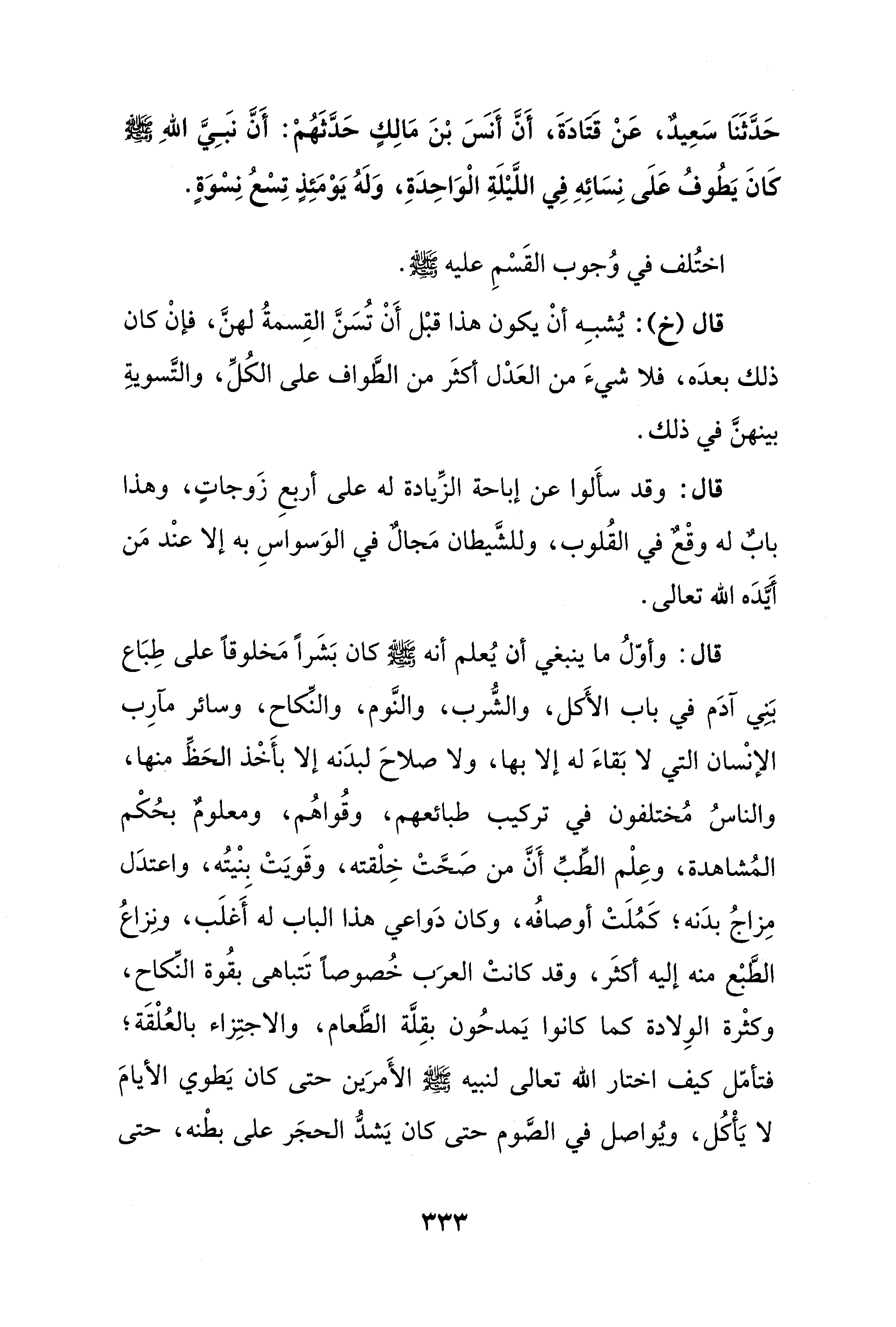 قال: وأوّلُ ما ينبغي أن يُعلم أنه - صلى الله عليه وسلم - كان بَشَرًا مَخلوقًا على طِبَاع بَنِي آدَم في باب الأكَل، والشُّرب، والنَّوم، والنَّكاح، وسائر مآرِب الإنْسان التي لا بَقاءَ له إلا بها، ولا صلاحَ لبدَنه إلا بأَخْذ الحَظِّ منها، والناسُ مُختلفون في تركيب طبائعهم، وقُواهُم، ومعلومٌ بحُكْم المُشاهدة، وعِلْم الطِّبِّ أَنَّ من صَحَّتْ خِلْقته، وقَويَتْ بِنْيتُه، واعتدَل مِزاجُ بدَنه؛ كَمُلَتْ أوصافُه، وكان دَواعي هذا الباب له أَغلَب، ونِزاعُ الطَّبعْ منه إليه أكثَر، وقد كانتْ العرَب خُصوصًا تَتباهى بقُوة النِّكاح، وكثْرة الوِلادة كما كانوا يَمدحُون بقِلَّة الطَّعام، والاجتِزاء بالعُلْقَة؛ فتأمّل كيف اختار الله تعالى لنبيه - صلى الله عليه وسلم - الأَمرَين حتى كان يَطوي الأيامَ لا يَأْكُل، ويُواصل في الصَّوم حتى كان يَشدُّ الحجَر على بطْنه، حتى