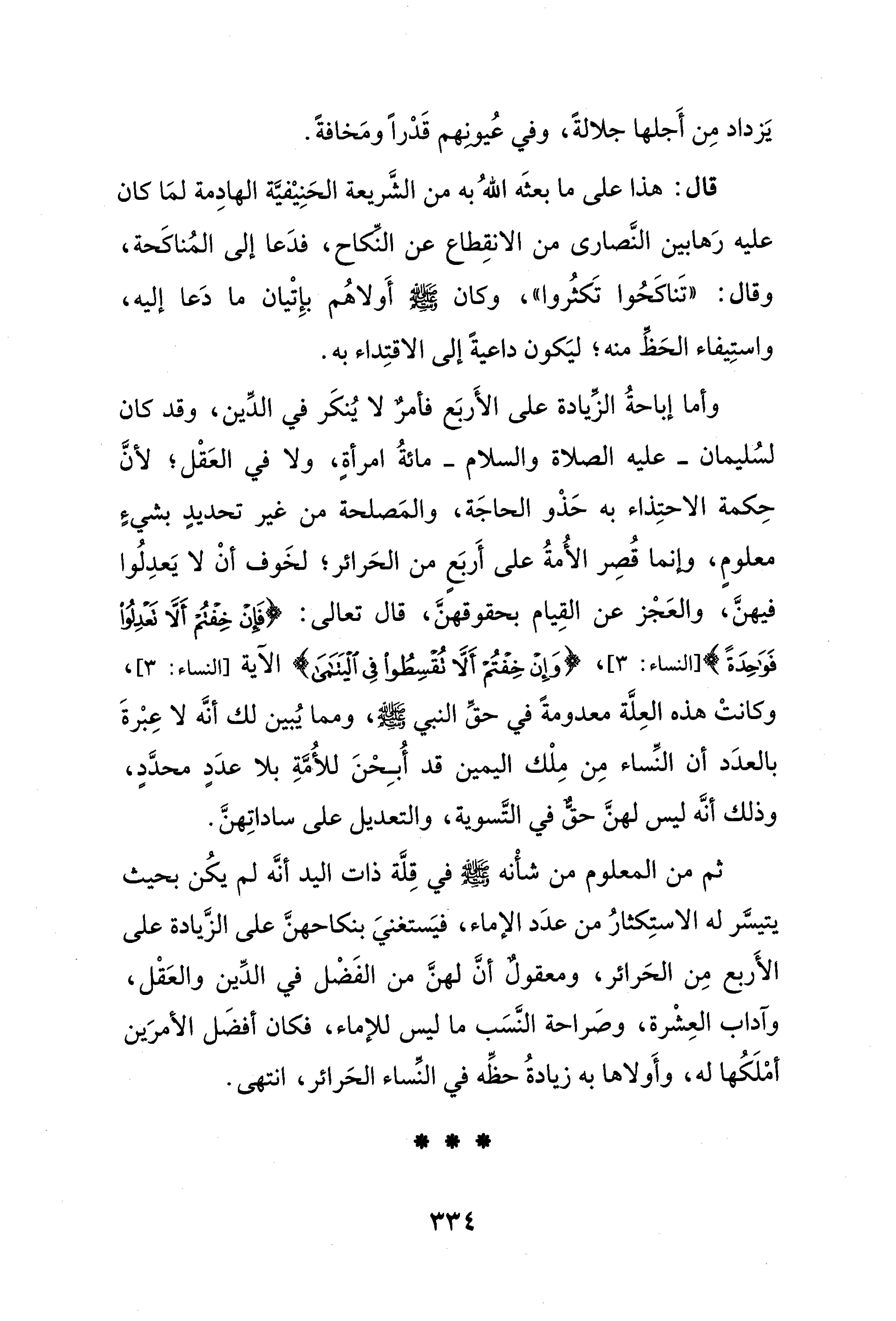 وأما إباحةُ الزِّيادة على الأَربَع فأمرٌ لا يُنكَر في الدِّين، وقد كان لسُليمان -عليه الصلاة والسلام- مائةُ امرأةٍ، ولا في العَقْل؛ لأنَّ حِكمة الاحتِذاء به حَذْو الحاجَة، والمَصلحة من غير تحديدٍ بشيءٍ معلومٍ، وإنما قُصِر الأُمةُ على أَربَعٍ من الحَرائر؛ لخَوف أنْ لا يَعدِلُوا فيهنَّ، والعَجْز عن القِيام بحقوقهنَّ، قال تعالى: {فَإِنْ خِفْتُمْ أَلَّا تَعْدِلُوا فَوَاحِدَةً} [النساء: 3]، {وَإِنْ خِفْتُمْ أَلَّا تُقْسِطُوا فِي الْيَتَامَى} الآية [النساء: 3]، وكانتْ هذه العِلَّة معدومةً في حقِّ النبي - صلى الله عليه وسلم -، ومما يُبين لك أنَّه لا عِبْرةَ بالعدَد أن النِّساء مِن مِلْك اليمين قد أُبِحْنَ للأُمَّةِ بلا عدَدٍ محدَّدٍ، وذلك أنَّه ليس لهنَّ حقٌّ في التَّسوية، والتعديل على ساداتِهنَّ.