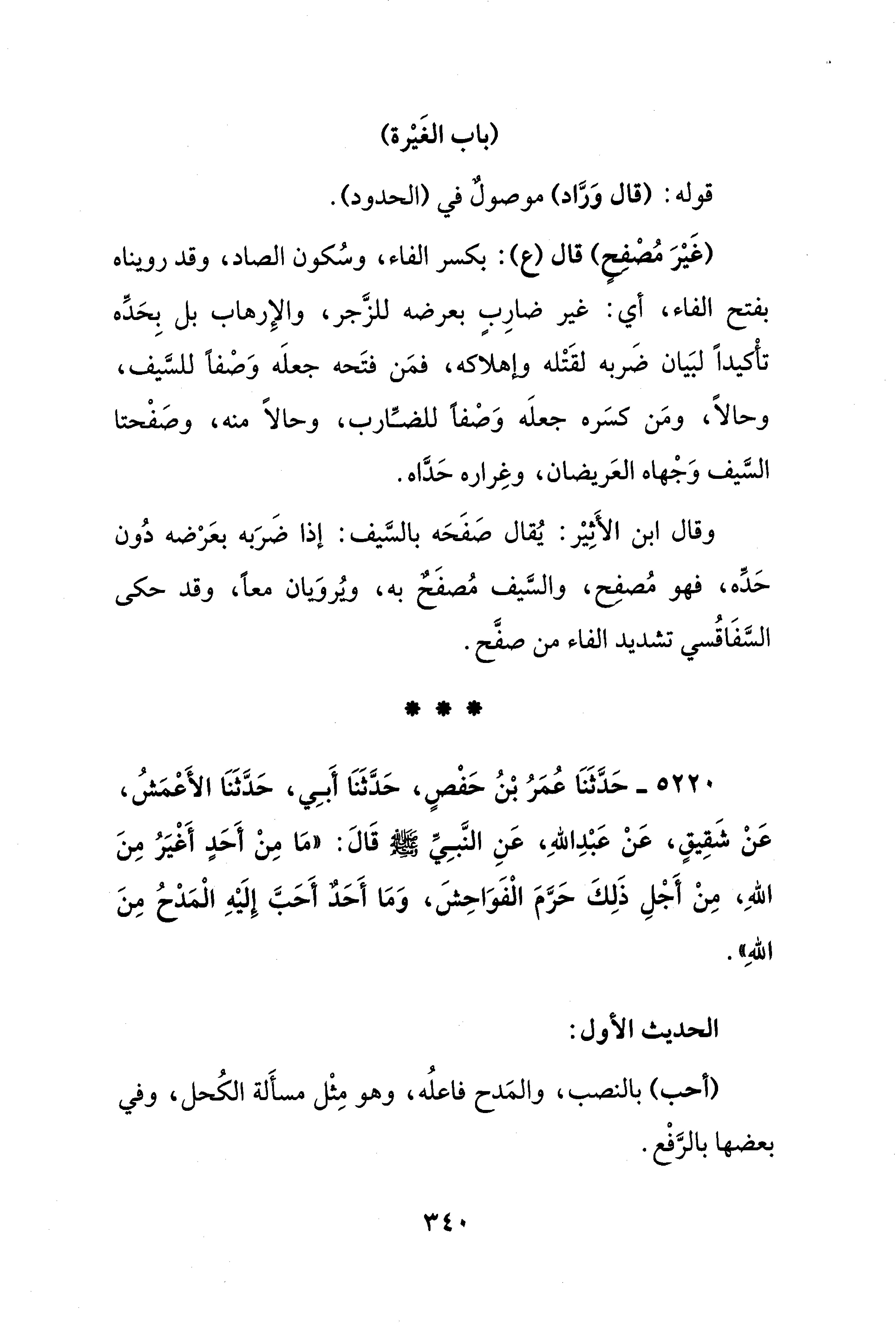 5220 - حَدَّثَنَا عُمَرُ بْنُ حَفْصٍ، حَدَّثَنَا أَبِي، حَدَّثَنَا الأَعْمَشُ، عَنْ شَقِيقٍ، عَنْ عَبْدِ اللهِ، عَنِ النَّبِيِّ - صلى الله عليه وسلم - قَالَ: "مَا مِنْ أَحَدٍ أَغْيَرُ مِنَ اللهِ، مِنْ أَجْلِ ذَلِكَ حَرَّمَ الْفَوَاحِشَ، وَمَا أَحَدٌ أَحَبَّ إِلَيْهِ الْمَدْحُ مِنَ اللهِ".