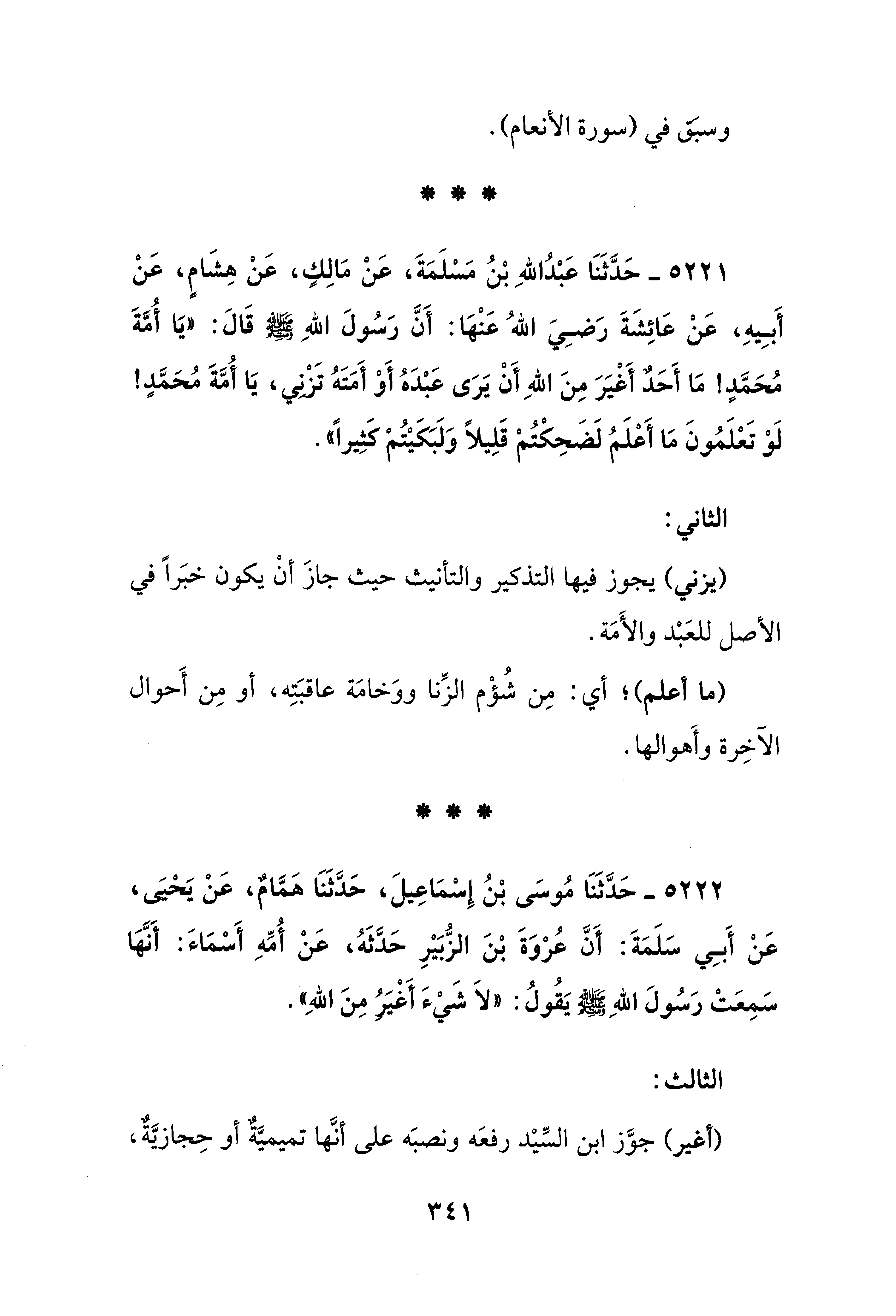 5221 - حَدَّثَنَا عَبْدُ اللهِ بْنُ مَسْلَمَةَ، عَنْ مَالِكٍ، عَنْ هِشَامٍ، عَنْ أَبِيهِ، عَنْ عَائِشَةَ رَضِيَ اللهُ عَنْهَا: أَنَّ رَسُولَ اللهِ - صلى الله عليه وسلم - قَالَ: "يَا أُمَّةَ مُحَمَّدٍ! مَا أَحَدٌ أَغْيَرَ مِنَ اللهِ أَنْ يَرَى عَبْدَهُ أَوْ أَمَتَهُ تَزني، يَا أُمَّةَ مُحَمَّدٍ! لَوْ تَعْلَمُونَ مَا أَعْلَمُ لَضَحِكْتُمْ قَلِيلًا وَلَبَكَيْتُمْ كَثِيرًا".
