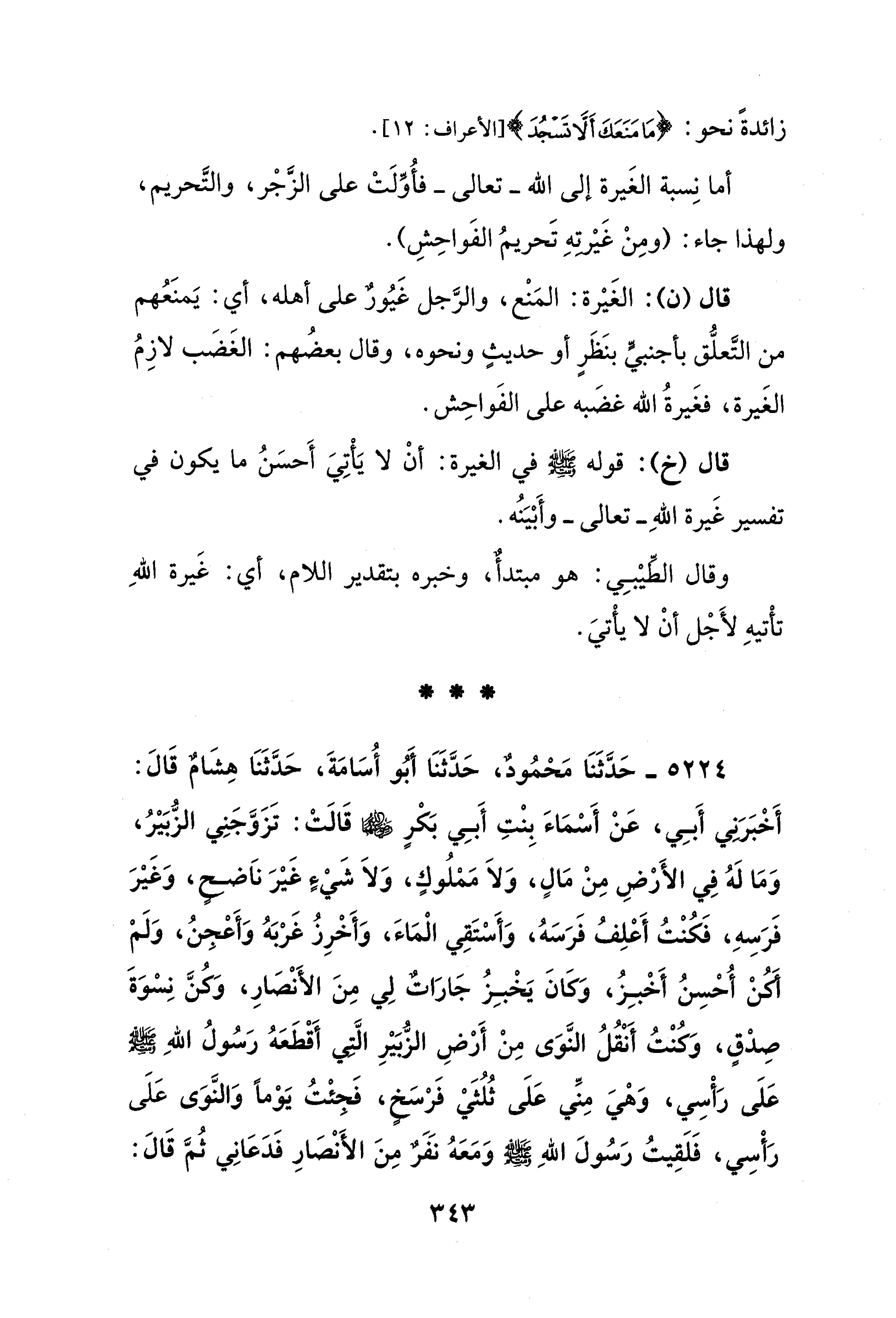 قال (خ): قوله - صلى الله عليه وسلم - في الغيرة: أنْ لا يَأتِيَ أَحسَنُ ما يكون في تفسير غَيرة اللهِ -تعالى- وأَبْيَنُه.