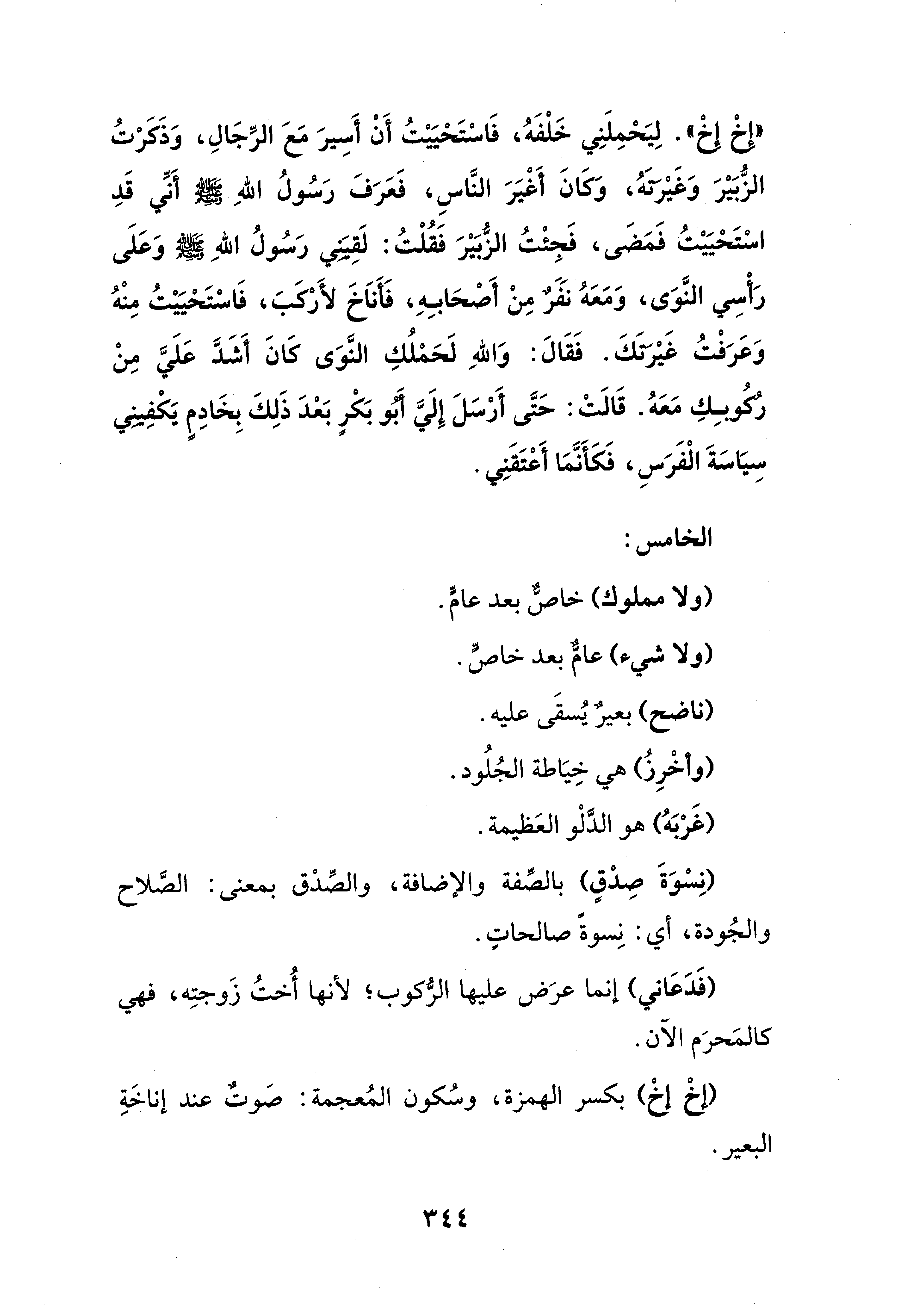 "إخْ إخ". لِيَحْمِلَنِي خَلْفَهُ، فَاسْتَحْيَيْتُ أَنْ أَسِيرَ مَعَ الرِّجَالِ، وَذَكَرْتُ الزُّبَيْرَ وَغَيْرتَهُ، وَكانَ أَغْيَرَ النَّاسِ، فَعَرَفَ رَسُولُ اللهِ - صلى الله عليه وسلم - أَنِّي قَدِ اسْتَحْيَيْتُ فَمَضَى، فَجِئْتُ الزُّبَيْرَ فَقُلْتُ: لَقِيني رَسُولُ اللهِ - صلى الله عليه وسلم - وَعَلَى رَأْسِي النَّوَى، وَمَعَهُ نَفَرٌ مِنْ أَصْحَابِهِ، فَأنَاخَ لأَرْكَبَ، فَاسْتَحْيَيْتُ مِنْهُ وَعَرَفْتُ غَيْرَتَكَ. فَقَالَ: وَاللهِ لَحَمْلُكِ النَّوَى كَانَ أَشَدَّ عَلَيَّ مِنْ رُكُوبِكِ مَعَهُ. قَالَتْ: حَتَّى أَرْسَلَ إِلَيَّ أَبُو بَكْرٍ بَعْدَ ذَلِكَ بِخَادِمٍ يَكْفِيني سِيَاسَةَ الْفَرَسِ، فَكَأَنَّمَا أَعْتَقَنِي.