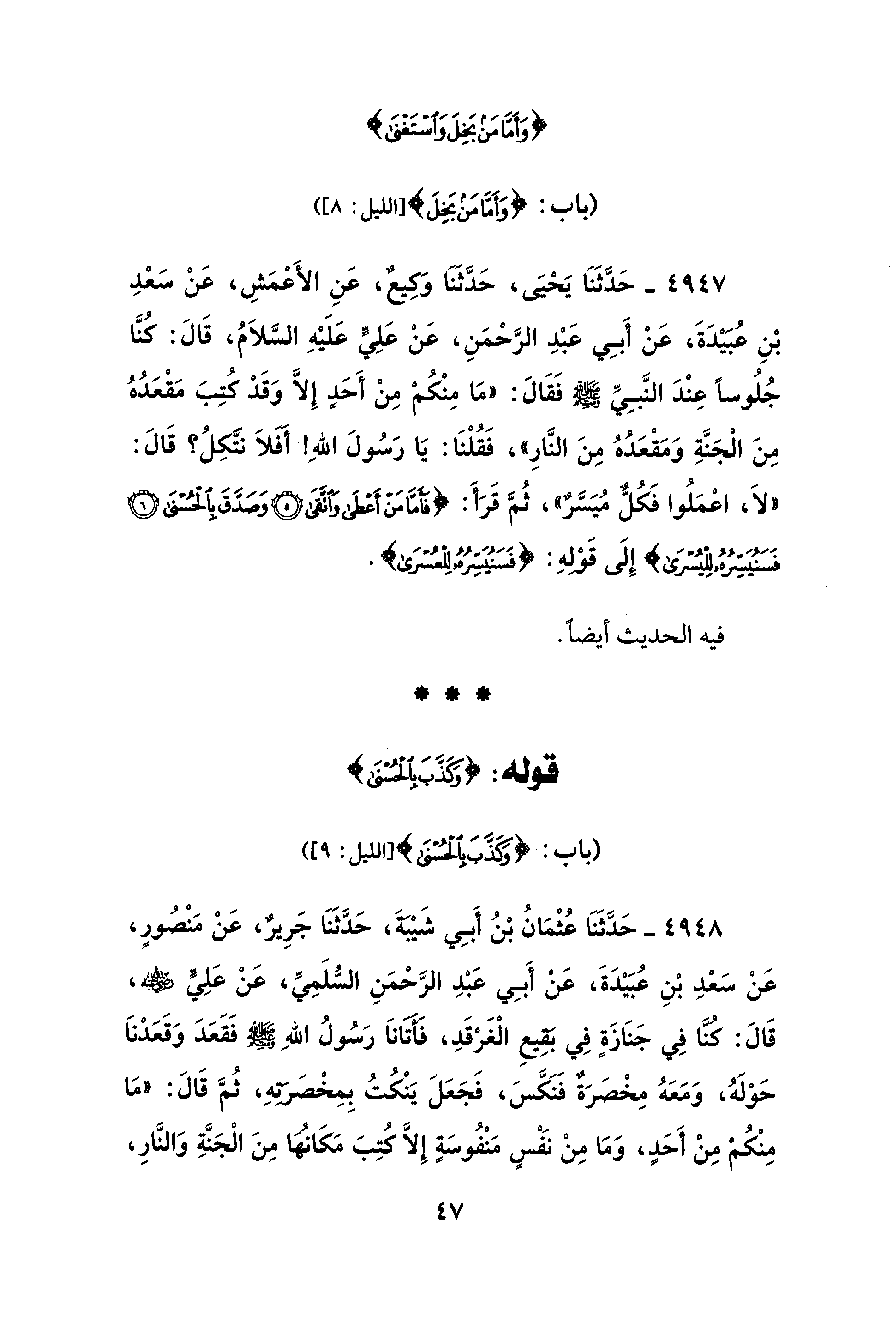 4947 - حَدَّثَنَا يَحيَى، حَدَّثَنَا وَكِيعٌ، عَنِ الأَعْمَشِ، عَنْ سعْدِ بْنِ عُبَيْدَةَ، عَنْ أَبِي عَبْدِ الرَّحْمَنِ، عَنْ عَلِيٍّ عَلَيْهِ السَّلاَمُ، قَالَ: كُنَّا جُلُوسًا عِنْدَ النَّبِيِّ - صلى الله عليه وسلم - فَقَالَ: "مَا مِنْكُمْ مِنْ أَحَدٍ إِلَّا وَقَد كُتِبَ مَقْعَدُهُ مِنَ الْجَنَّةِ وَمَقْعَدُهُ مِنَ النَّار"، فَقُلْنَا: يَا رَسُولَ اللهِ! أفلاَ نتَّكِلُ؟ قَالَ: "لَا، اعمَلُوا فَكُلٌّ مُيَسَّرٌ"، ثُمَّ قَرَأَ: {فَأَمَّا مَنْ أَعْطَى وَاتَّقَى (5) وَصَدَّقَ بِالْحُسْنَى فَسَنُيَسِّرُهُ لِلْيُسْرَى} إِلَى قولهِ: {فَسَنُيَسِّرُهُ لِلْيُسْرَى}.