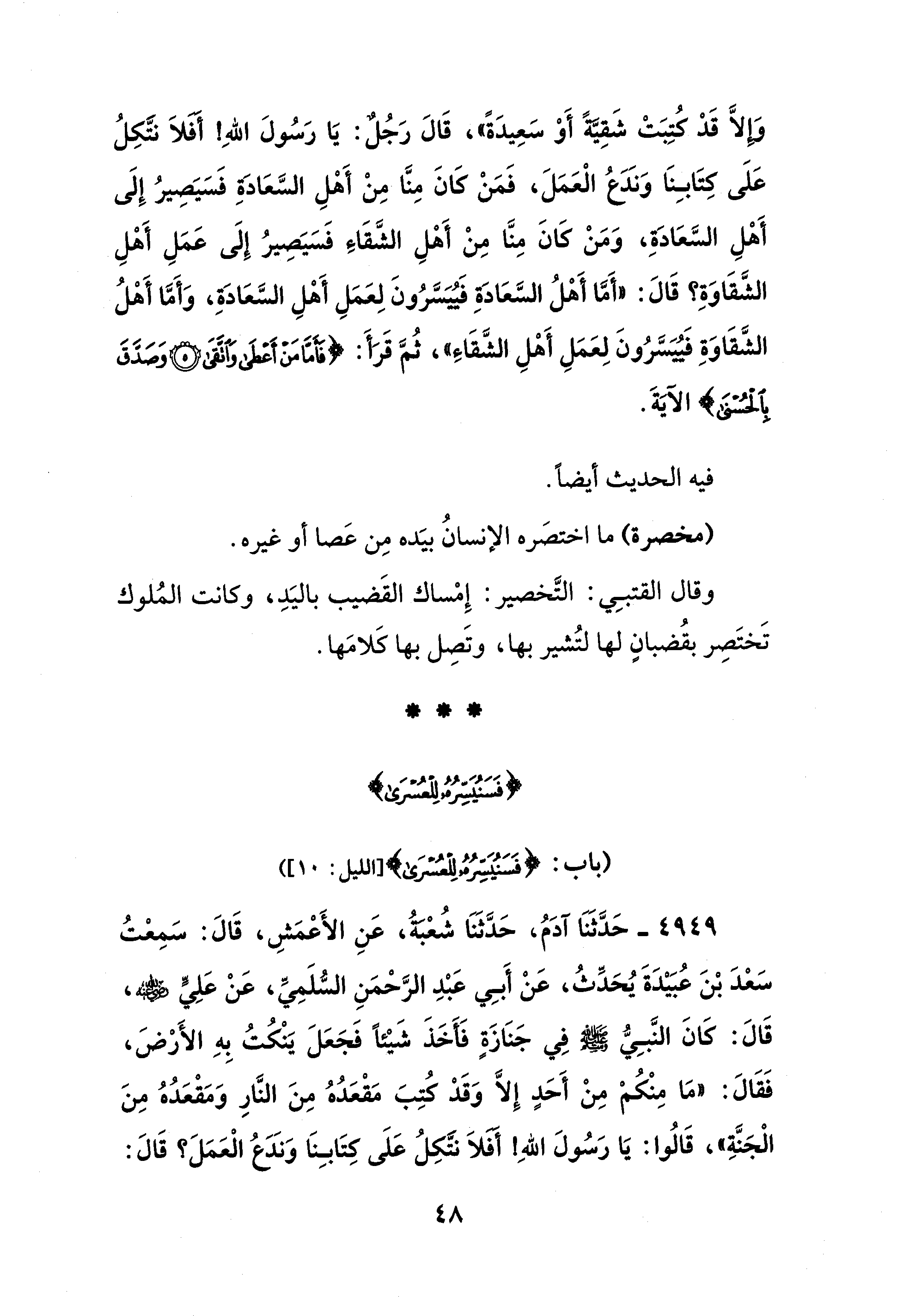 4949 - حَدَّثَنَا آدَمُ، حَدَّثَنَا شُعبةُ، عَنِ الأَعمَشِ، قَالَ: سَمِعْتُ سَعدَ بْنَ عُبَيْدَةَ يُحَدِّثُ، عَنْ أَبِي عَبْدِ الرَّحْمَنِ السُّلَمِيِّ، عَنْ عَليٍّ - رضي الله عنه -، قَالَ: كَانَ النَّبِيُّ - صلى الله عليه وسلم - فِي جَنَازَةٍ فَأَخَذَ شَيْئًا فَجَعَلَ يَنْكُتُ بِهِ الأرضَ، فَقَالَ: "مَا مِنْكُم مِنْ أَحَدٍ إِلَّا وَقَد كتِبَ مَقْعَدُهُ مِنَ النَّارِ وَمَقْعَدُهُ مِنَ الْجَنَّةِ"، قَالُوا: يَا رَسُولَ اللهِ! أفلاَ نتَّكِلُ عَلَى كتَابِنَا وَندع الْعَمَلَ؟ قَالَ: