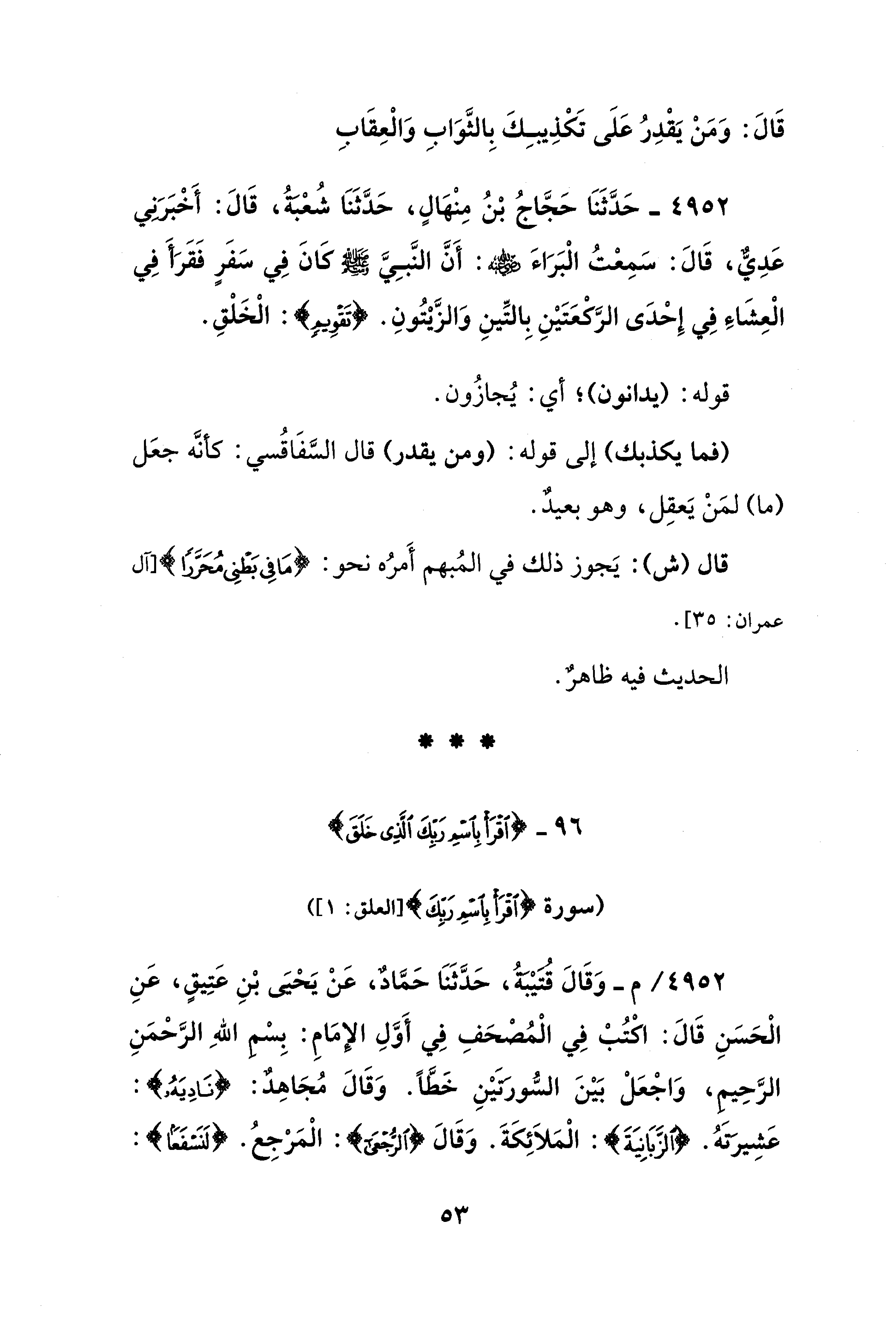 4952 - حَدَّثَنَا حَجَّاجُ بْنُ مِنهالٍ، حَدَّثَنَا شُعبةُ، قَالَ: أَخْبَرَني عَدِيٌّ، قَالَ: سَمِعْتُ الْبَرَاء - رضي الله عنه -: أَنَّ النَّبِيَّ - صلى الله عليه وسلم - كَانَ فِي سَفَرٍ فَقَرَأَ فِي الْعِشَاءِ فِي إحدَى الرَّكْعَتَيْنِ بِالتِّينِ وَالزَّيْتُونِ {تقويم}: الْخَلْقِ.