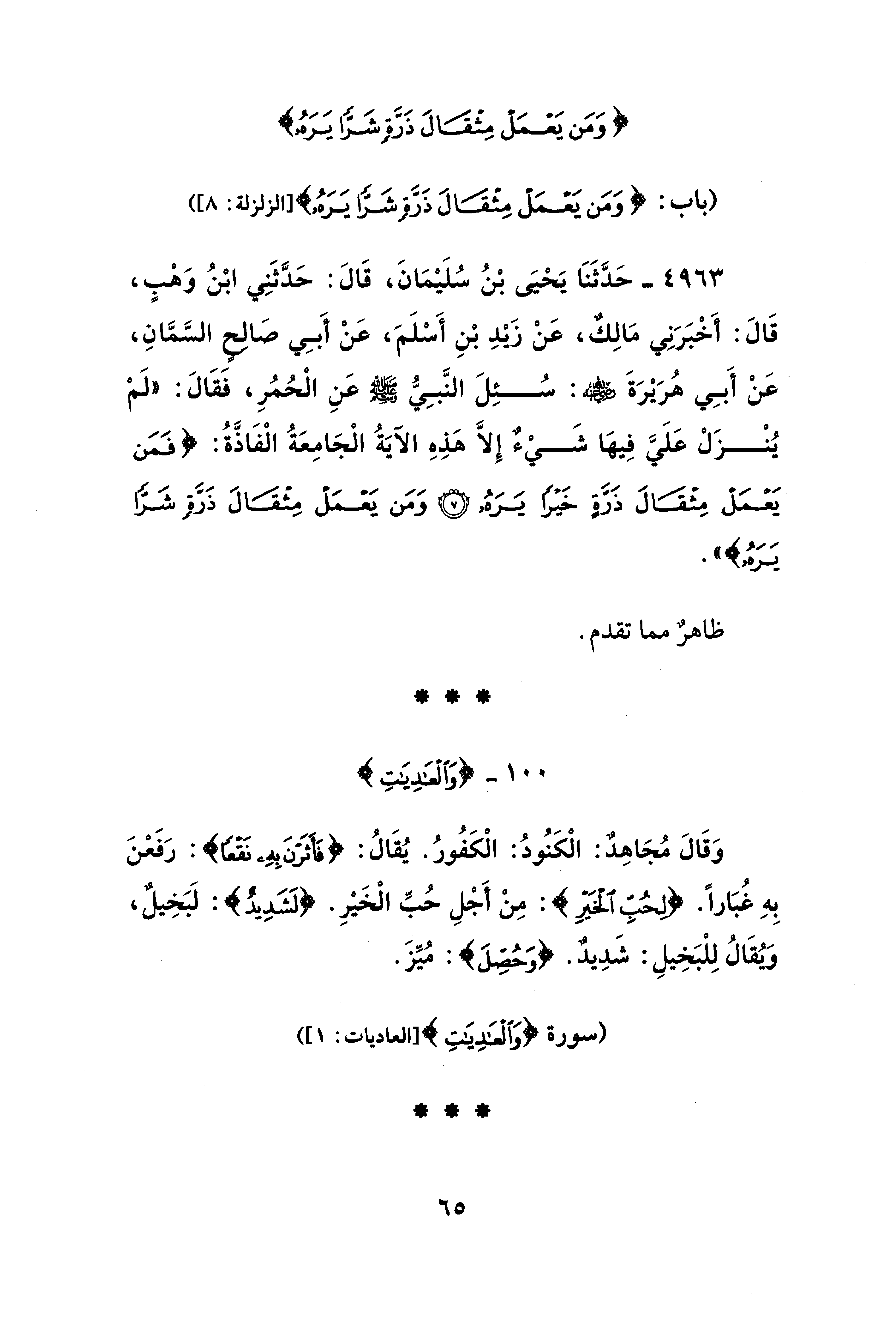 4963 - حَدَّثَنَا يَحيَى بْنُ سُلَيْمَانَ، قَالَ: حَدَّثَنِي ابْنُ وَهْبٍ، قَالَ: أَخْبَرَنِي مَالِكٌ، عَنْ زَيْدِ بْنِ أَسْلَمَ، عَنْ أَبِي صَالح السَّمَّانِ، عَنْ أَبِي هُرَيرَةَ - رضي الله عنه -: سُئِلَ النَّبِيُّ - صلى الله عليه وسلم - عَنِ الْحُمُرِ، فَقَالَ: "لم يُنْزَلْ عَلَيَّ فِيها شَيْءٌ إلَّا هذِهِ الآيَةُ الْجَامِعَةُ الْفَاذَّةُ: {فَمَنْ يَعْمَلْ مِثْقَالَ ذَرَّةٍ خَيْرًا يَرَهُ (7) وَمَنْ يَعْمَلْ مِثْقَالَ ذَرَّةٍ شَرًّا يَرَهُ} ".
