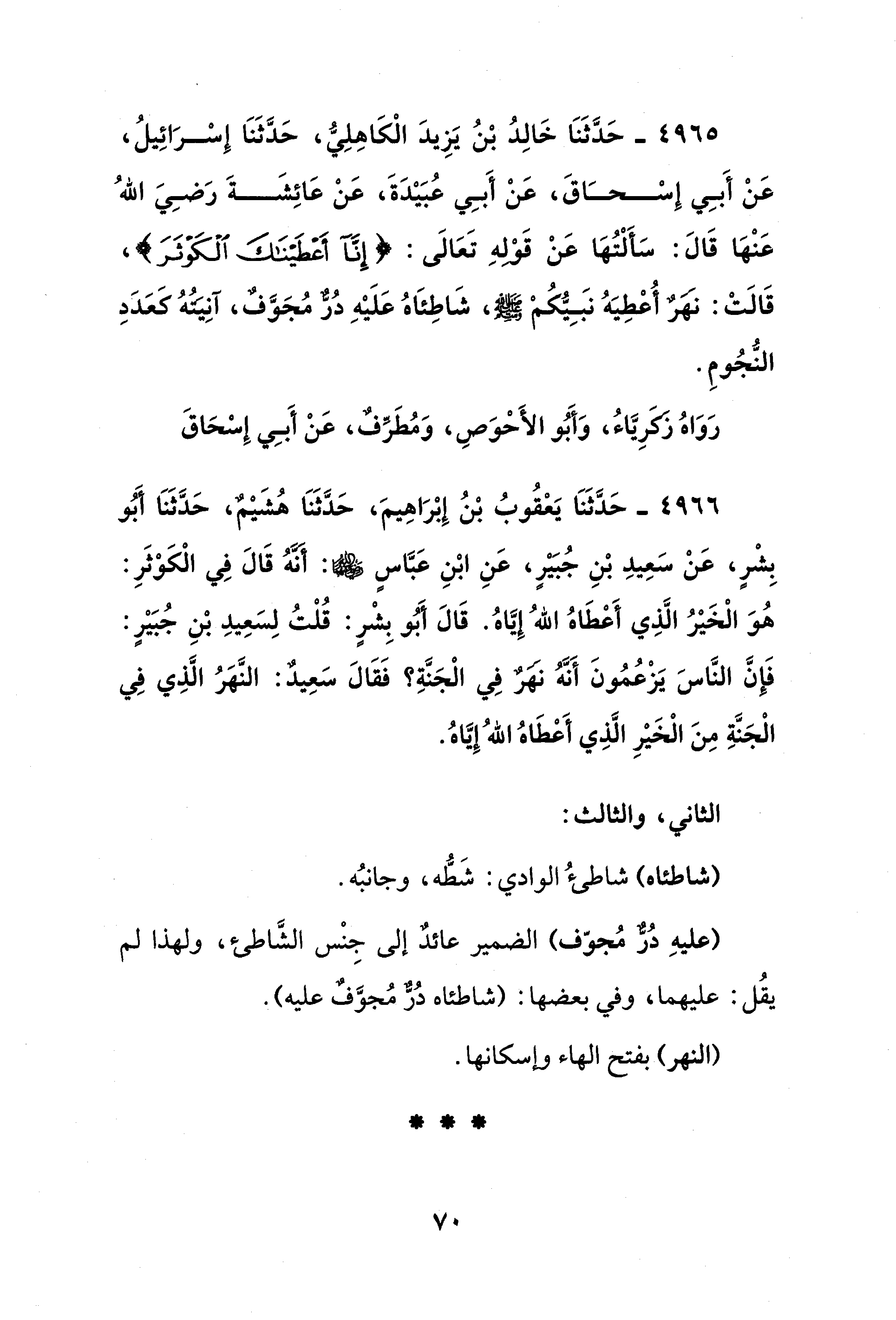 4965 - حَدَّثَنَا خَالِدُ بْنُ يَزِيدَ الْكَاهِلِيُّ، حَدَّثَنَا إِسْرَائِيلُ، عَنْ أَبِي إِسْحَاقَ، عَنْ أَبِي عُبَيْدَةَ، عَنْ عَائِشَةَ رَضِيَ اللهُ عَنْها قَالَ: سَأَلْتُها عَنْ قَوْلِهِ تَعَالَى: {إِنَّا أَعْطَيْنَاكَ الْكَوْثَرَ}، قَالَتْ: نهرٌ أُعْطِيَهُ نبَيُّكم - صلى الله عليه وسلم -، شَاطِئَاهُ عَلَيْهِ دُرٌّ مُجَوَّفٌ، آنِيتهُ كَعَدَدِ النُّجُومِ.