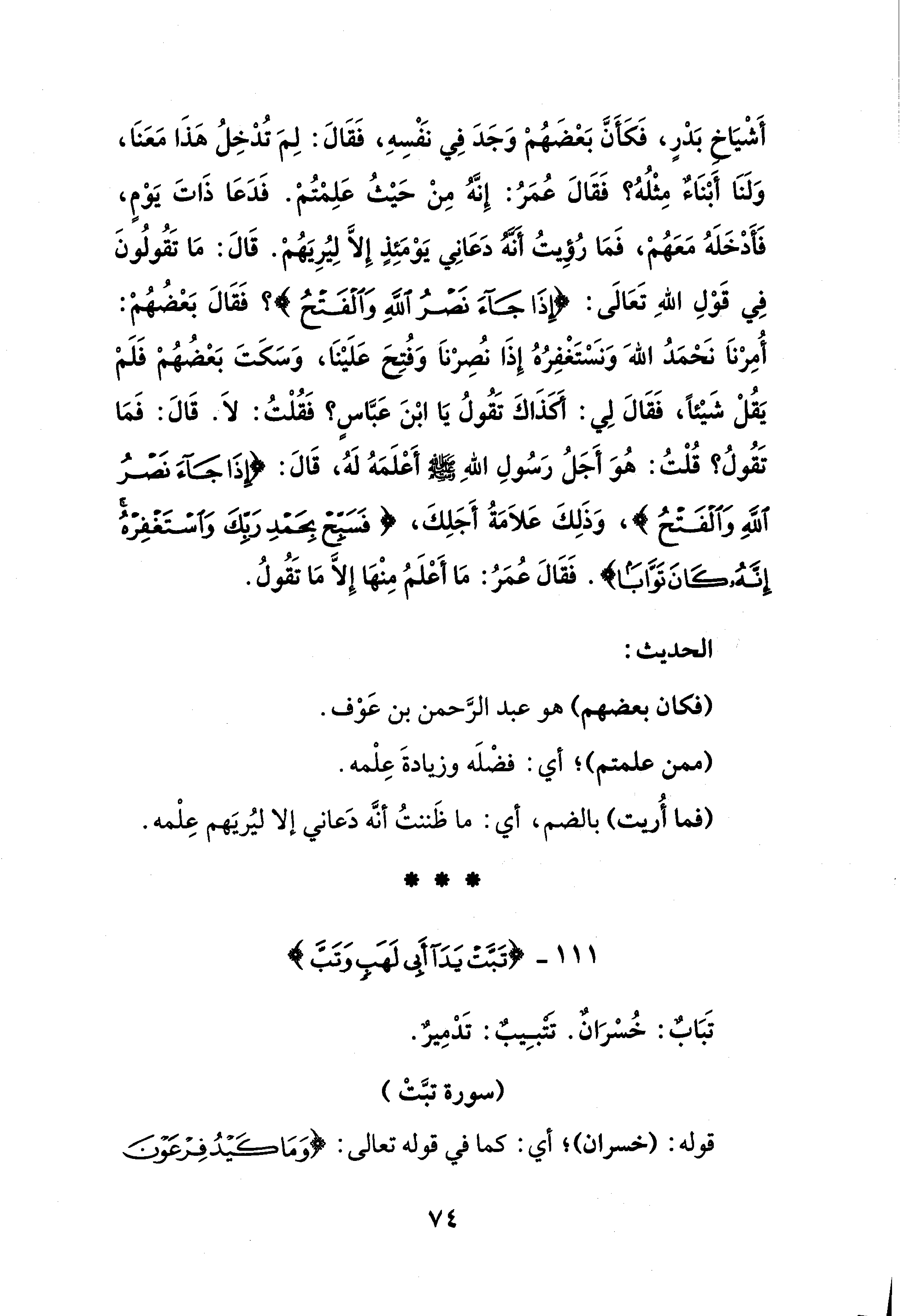 أَشْيَاخ بَدْرٍ، فَكأَنَّ بَعْضَهُمْ وَجَدَ فِي نفسِهِ، فَقَالَ: لِمَ تُدْخِلُ هَذَا مَعَنَا، وَلنا أَبْنَاءٌ مِثْلُهُ؟ فَقَالَ عُمَرُ: إِنَّهُ مِنْ حَيْثُ عَلِمْتُمْ. فَدَعَا ذَاتَ يَوْمٍ، فَأَدْخَلَهُ مَعَهُمْ، فَمَا رُؤِيتُ أَنَهُ دَعَانِي يَوْمَئِذٍ إِلَّا لِيُرِيَهُمْ. قَالَ: مَا تَقُولُونَ فِي قَوْلِ اللهِ تَعَالَى: {إِذَا جَاءَ نَصْرُ اللَّهِ وَالْفَتْحُ}؟ فَقَالَ بَعْضهُمْ: أُمِرْنَا نَحْمَدُ اللهَ وَنستَغْفِرُهُ إِذَا نُصِرْنَا وَفُتِحَ عَلَيْنَا، وَسَكَتَ بَعْضُهُمْ فَلَمْ يَقُلْ شَيْئًا، فَقَالَ لِي: أَكَذَاكَ تَقُولُ يَا ابْنَ عَبَّاسٍ؟ فَقُلْتُ: لَا. قَالَ: فَمَا تَقُولُ؟ قُلْتُ: هُوَ أَجَلُ رَسُولِ اللهِ - صلى الله عليه وسلم - أَعْلَمَهُ لَهُ، قَالَ: {إِذَا جَاءَ نَصْرُ اللَّهِ وَالْفَتْحُ}، وَذَلِكَ عَلاَمَةُ أَجَلِكَ، {فَسَبِّحْ بِحَمْدِ رَبِّكَ وَاسْتَغْفِرْهُ إِنَّهُ كَانَ تَوَّابًا}. فَقَالَ عُمَرُ: مَا أَعْلَمُ مِنْهَا إِلَّا مَا تَقُولُ.