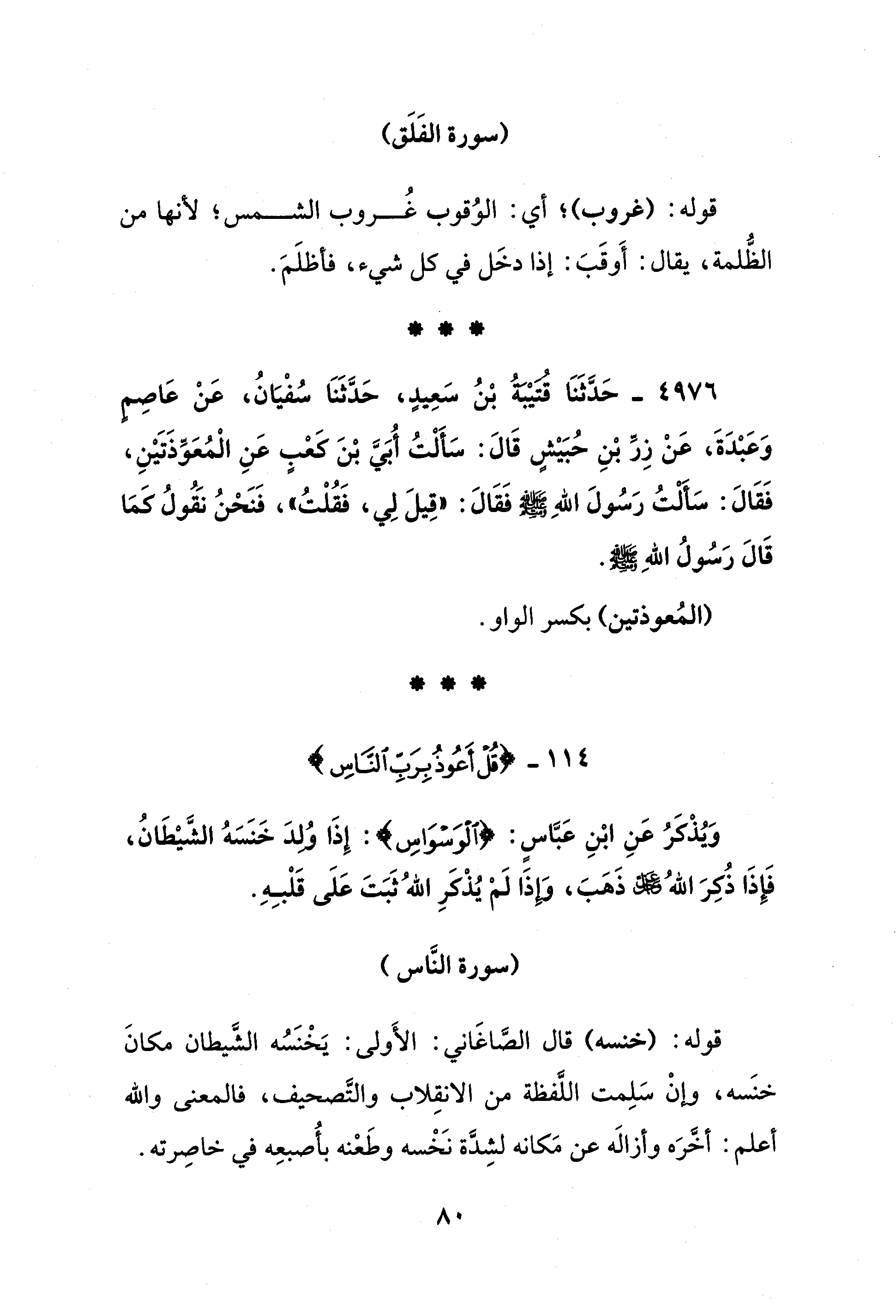 4976 - حَدَّثَنَا قتيْبَةُ بْنُ سَعِيدٍ، حَدَّثَنَا سُفْيَانُ، عَنْ عَاصِمٍ وَعَبْدَةَ، عَنْ زِرِّ بْنِ حُبَيْشٍ قَالَ: سَأَلْتُ أُبَيَّ بْنَ كَعْبٍ عَنِ الْمُعَوِّذَتَيْنِ، فَقَالَ: سَأَلتُ رَسُولَ اللهِ - صلى الله عليه وسلم - فَقَالَ: "قِيلَ لِي، فَقُلْتُ"، فَنَحْنُ نقُولُ كَمَا قَالَ رَسُولُ اللهِ - صلى الله عليه وسلم -.