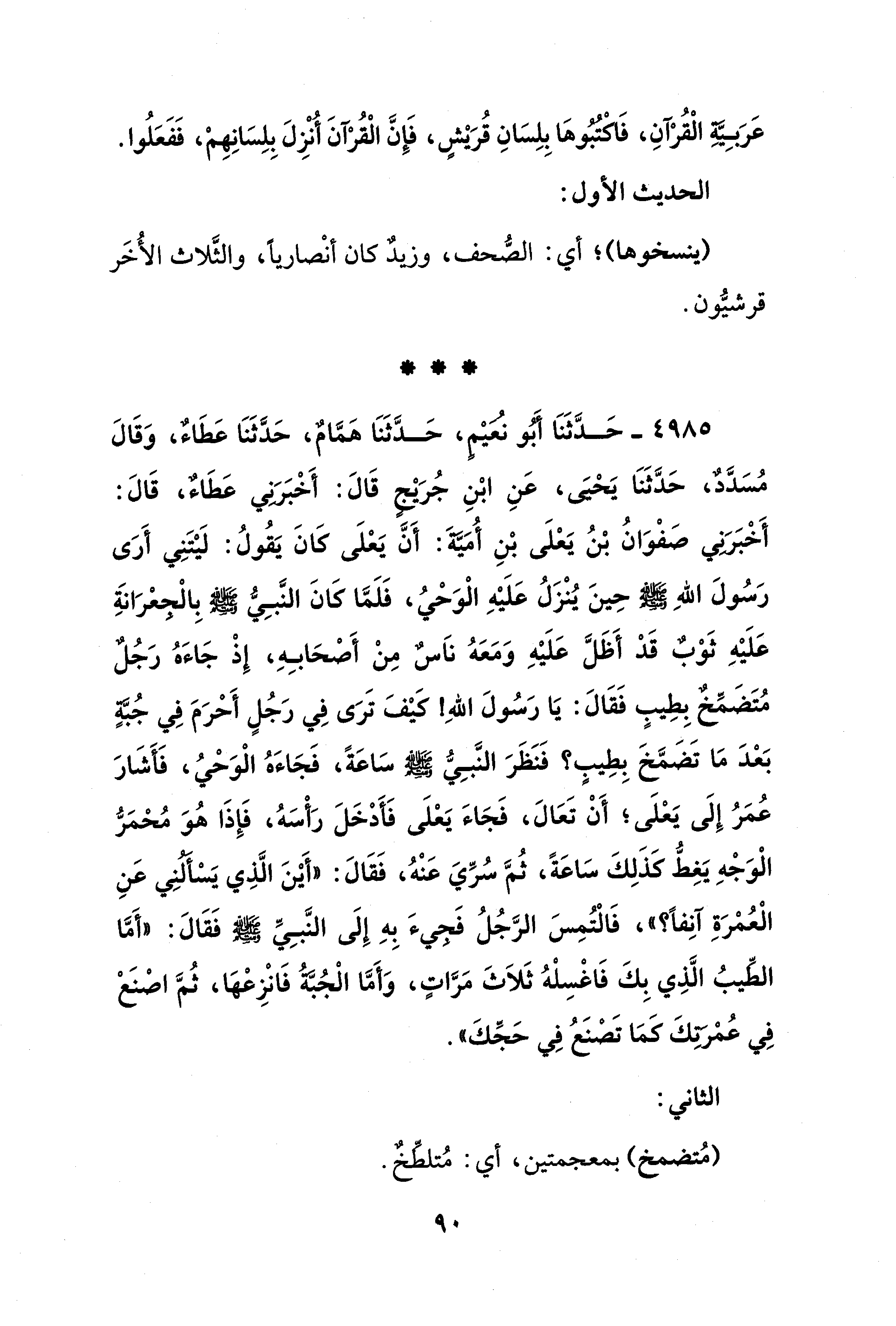 4985 - حَدَّثَنَا أَبُو نُعَيْمٍ، حَدَّثَنَا هَمَّامٌ، حَدَّثَنَا عَطَاءٌ، وَقَالَ مُسَدَّدٌ، حَدَّثَنَا يَحْيَى، عَنِ ابْنِ جُرَيْجٍ قَالَ: أَخْبَرَنِي عَطَاءٌ، قَالَ: أَخْبَرَنِي صَفْوَانُ بْنُ يَعْلَى بْنِ أُمَيَّةَ: أَنَّ يَعْلَى كَانَ يَقُولُ: لَيْتَنِي أَرَى رَسُولَ اللهِ - صلى الله عليه وسلم - حِينَ يُنْزَلُ عَلَيْهِ الْوَحْيُ، فَلَمَّا كَانَ النَّبِيُّ - صلى الله عليه وسلم - بِالْجعْرَانَةِ عَلَيْهِ ثَوْبٌ قَدْ أَظَلَّ عَلَيْهِ وَمَعَهُ نَاسٌ مِنْ أَصْحَابِهِ، إِذْ جَاءَهُ رَجُلٌ مُتَضَمِّخٌ بِطِيبٍ فَقَالَ: يَا رَسُولَ اللهِ! كَيْفَ تَرَى فِي رَجُلٍ أَحْرَمَ فِي جُبَّةٍ بَعْدَ مَا تَضَمَّخَ بِطِيبٍ؟ فَنَظَرَ النَّبِيُّ - صلى الله عليه وسلم - سَاعَةً، فَجَاءَهُ الْوَحْيُ، فَأَشَارَ عُمَرُ إِلَى يَعْلَى؛ أَنْ تَعَالَ، فَجَاءَ يَعْلَى فَأَدْخَلَ رَأْسَهُ، فَإِذَا هُوَ مُحْمَرُّ الْوَجْهِ يَغِطُّ كَذَلِكَ سَاعَةً، ثُمَّ سُرِّيَ عَنْهُ، فَقَالَ: "أَيْنَ الَّذِي يَسْأَلُنِي عَنِ الْعُمْرَةِ آنِفًا؟ "، فَالْتُمِسَ الرَّجُلُ فَجيءَ بِهِ إِلَى النَّبِيِّ - صلى الله عليه وسلم - فَقَالَ: "أَمَّا الطِّيبُ الَّذِي بِكَ فَاغْسِلْهُ ثَلاَثَ مَرَّاتٍ، وَأَمَّا الْجُبَّةُ فَانْزِعْهَا، ثُمَّ اصْنَعْ فِي عُمْرتِكَ كَمَا تَصْنعُ فِي حَجِّكَ".
